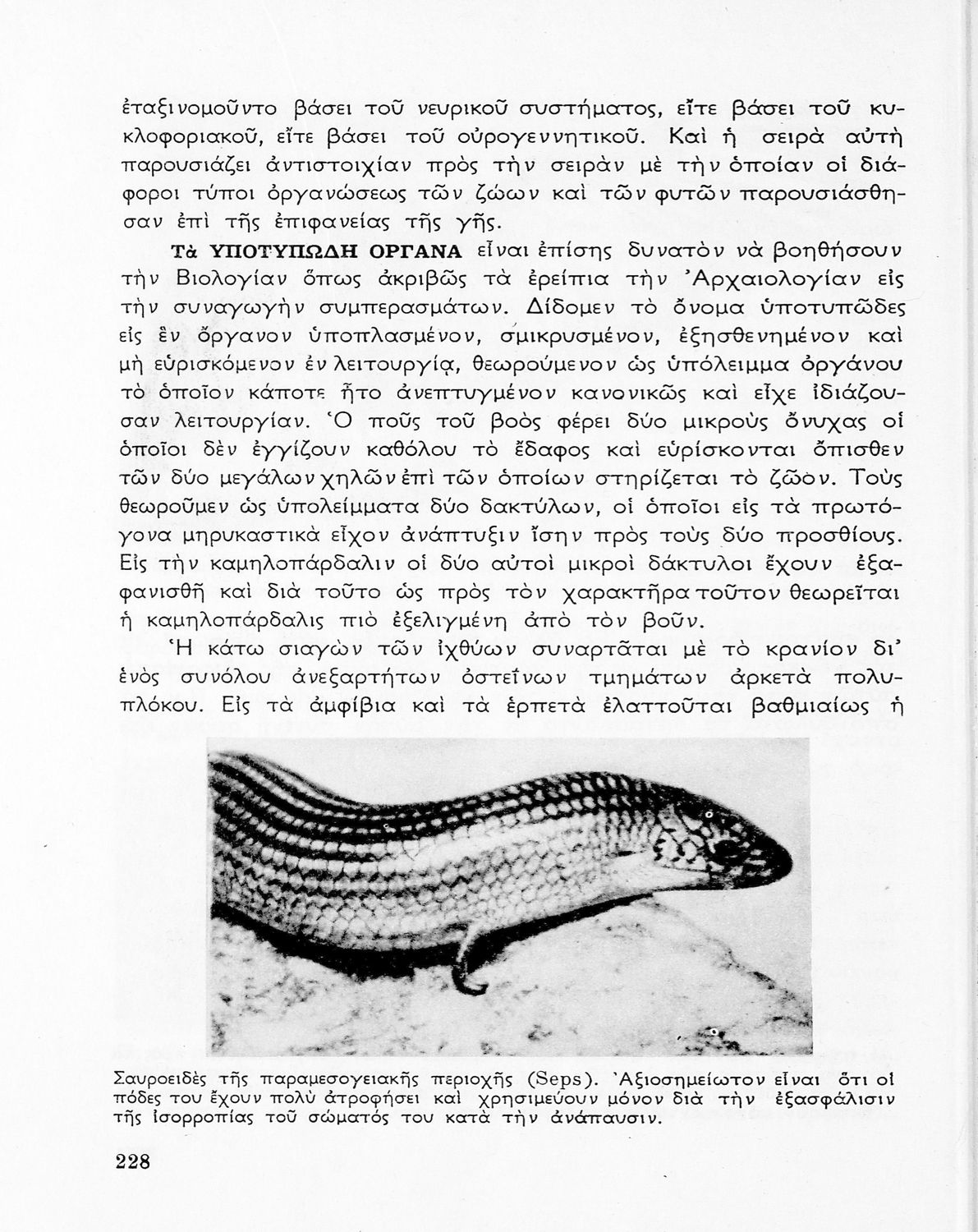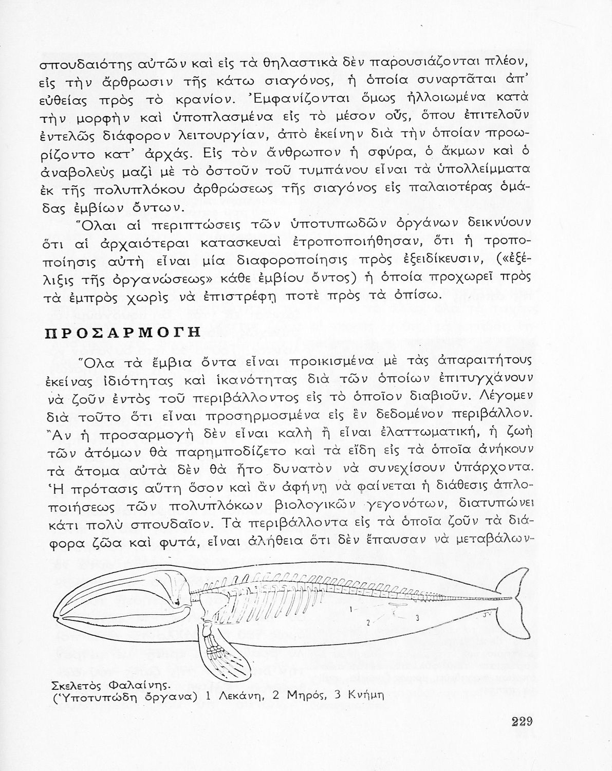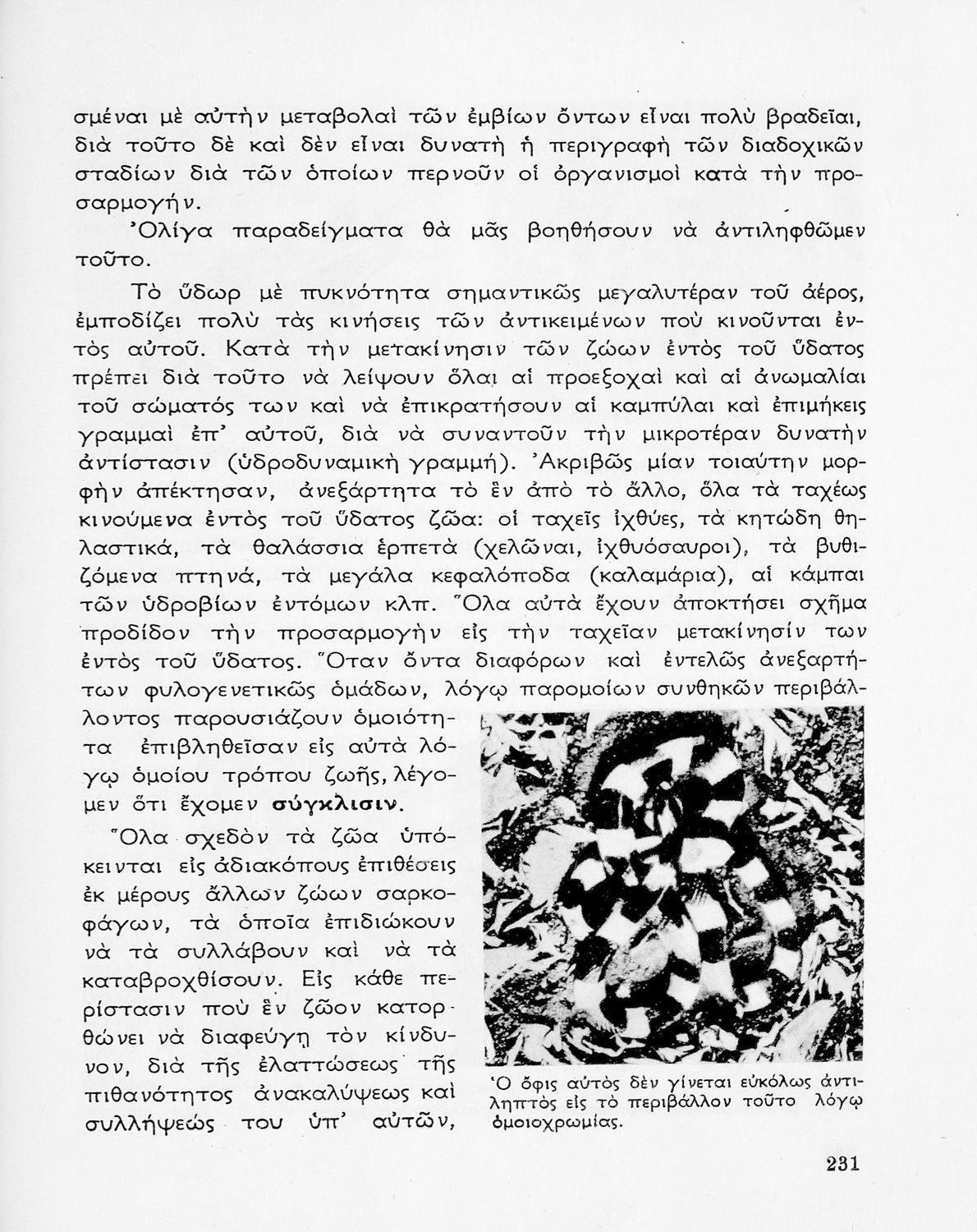 Σχολικό εγχειρίδιο Βιολογίας ΣΤ΄ Γυμνασίου που εστιάζει στις συνθήκες γέννησης, μεταβολής και θανάτου των έμβιων οργανισμών. Φέρει το σύμβολο της δικτατορίας. Ο συγγραφέας ήταν υφηγητής του Πανεπιστημίου Αθηνών.