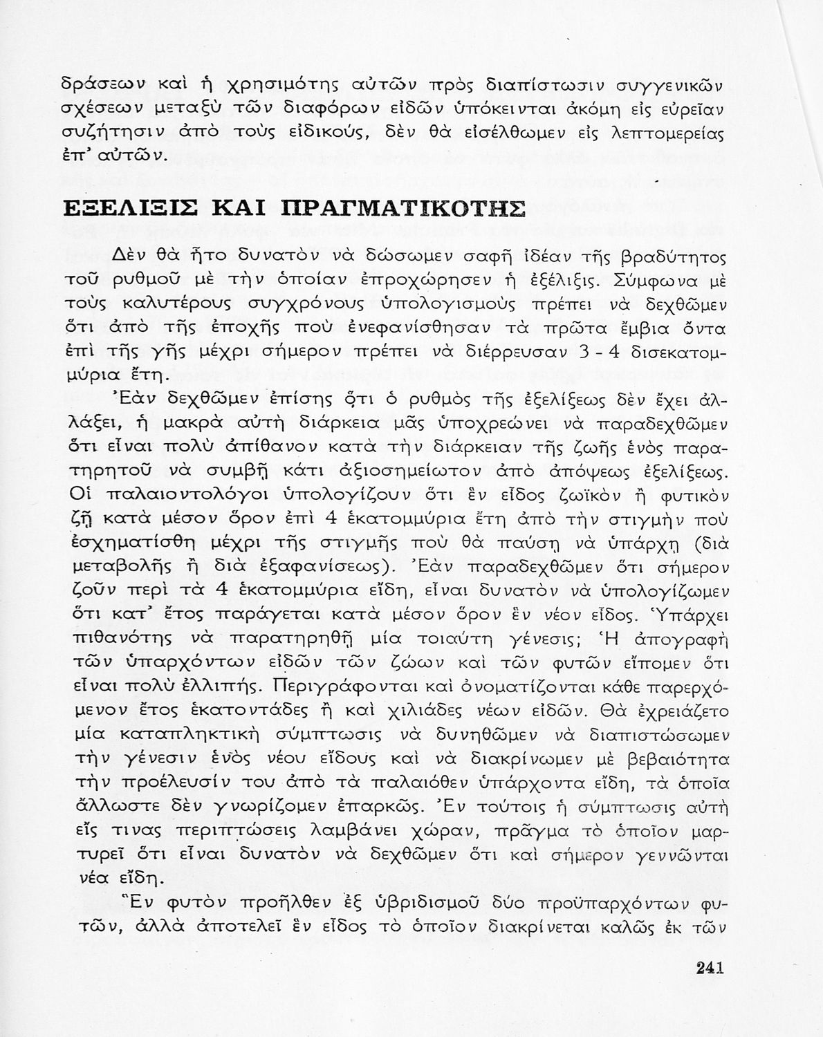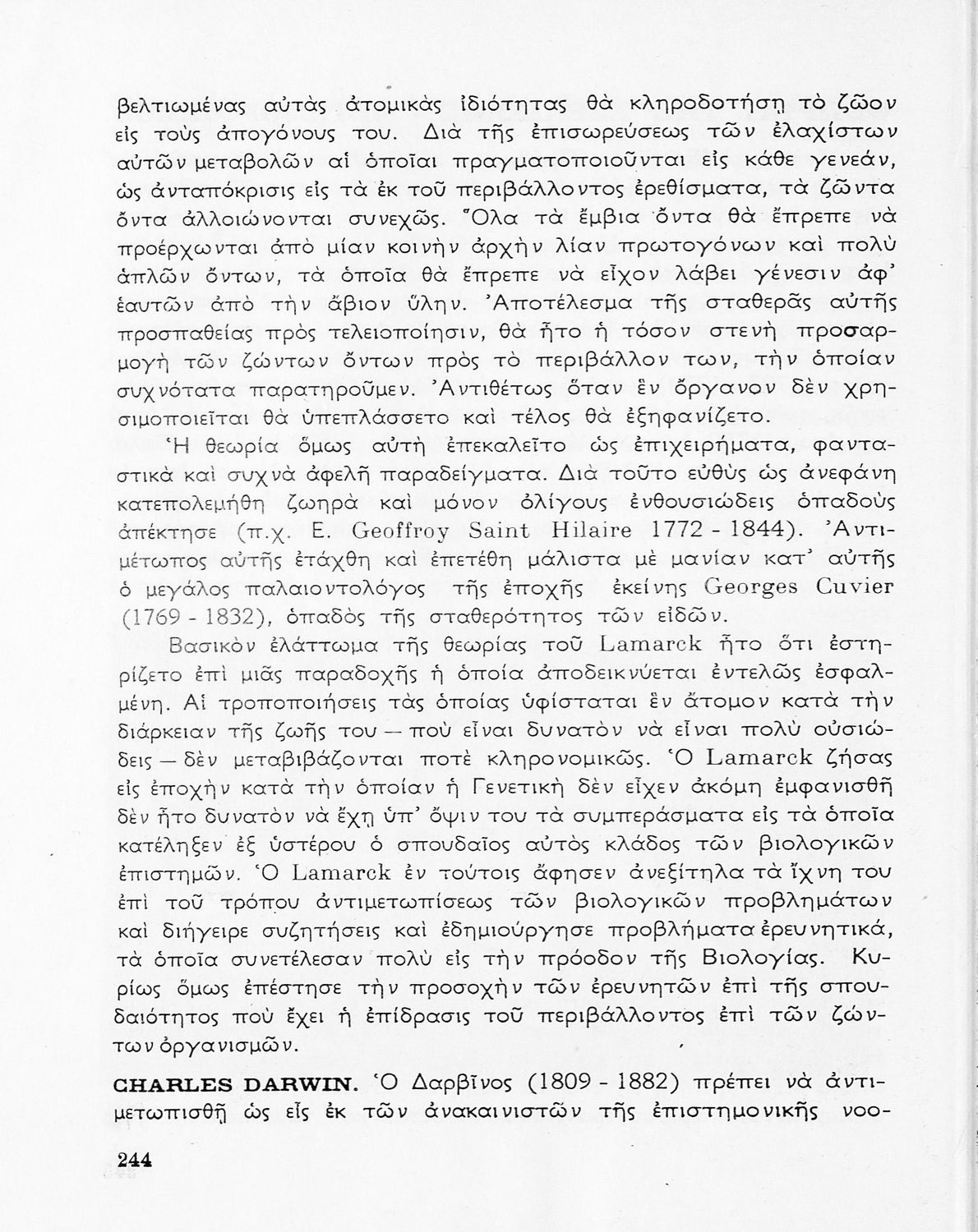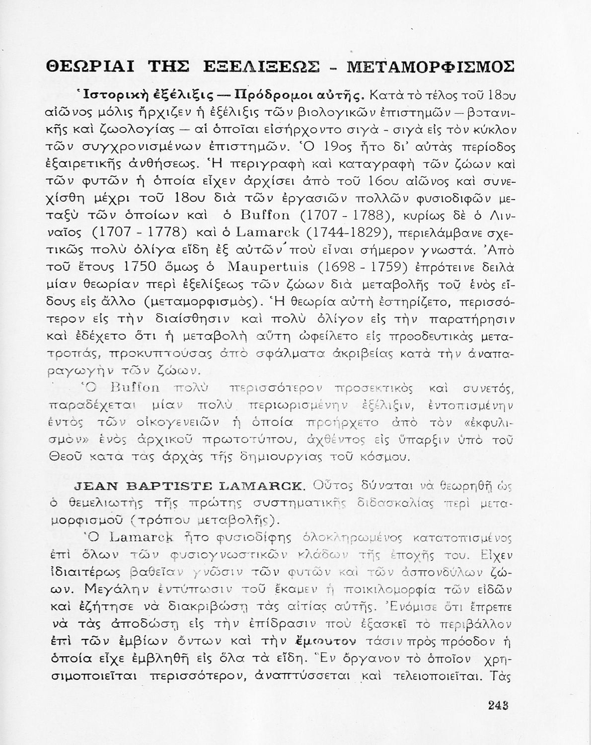 Σχολικό εγχειρίδιο Βιολογίας ΣΤ΄ Γυμνασίου που εστιάζει στις συνθήκες γέννησης, μεταβολής και θανάτου των έμβιων οργανισμών. Φέρει το σύμβολο της δικτατορίας. Ο συγγραφέας ήταν υφηγητής του Πανεπιστημίου Αθηνών.