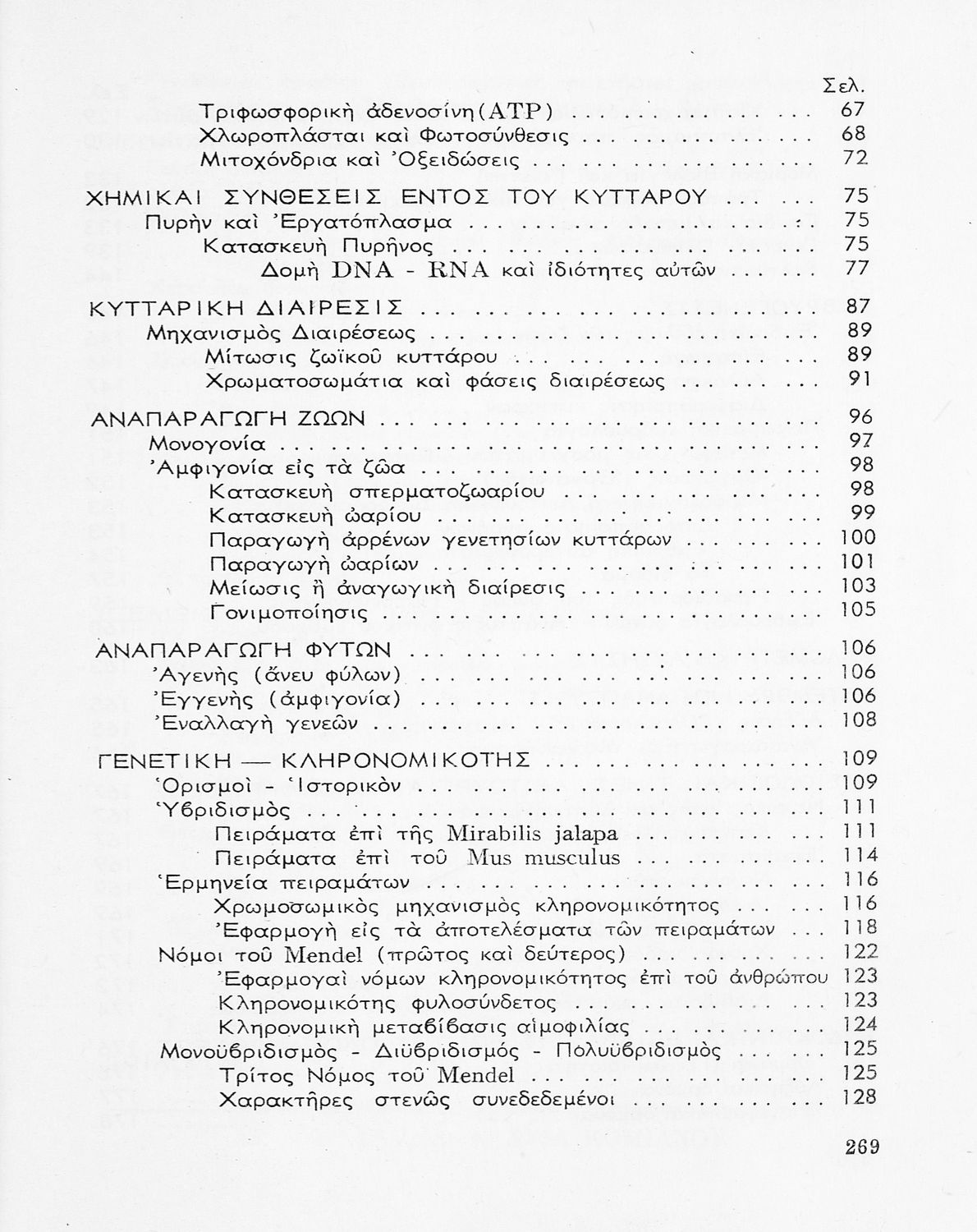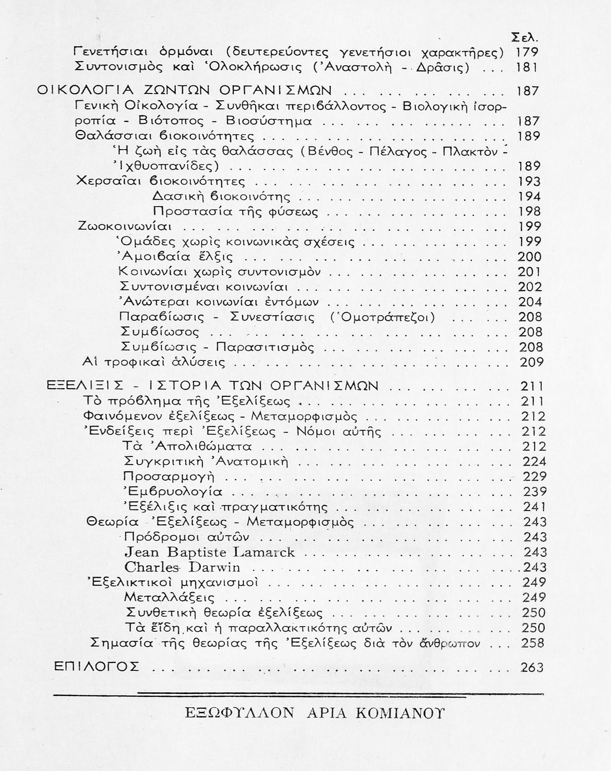 Σχολικό εγχειρίδιο Βιολογίας ΣΤ΄ Γυμνασίου που εστιάζει στις συνθήκες γέννησης, μεταβολής και θανάτου των έμβιων οργανισμών. Φέρει το σύμβολο της δικτατορίας. Ο συγγραφέας ήταν υφηγητής του Πανεπιστημίου Αθηνών.