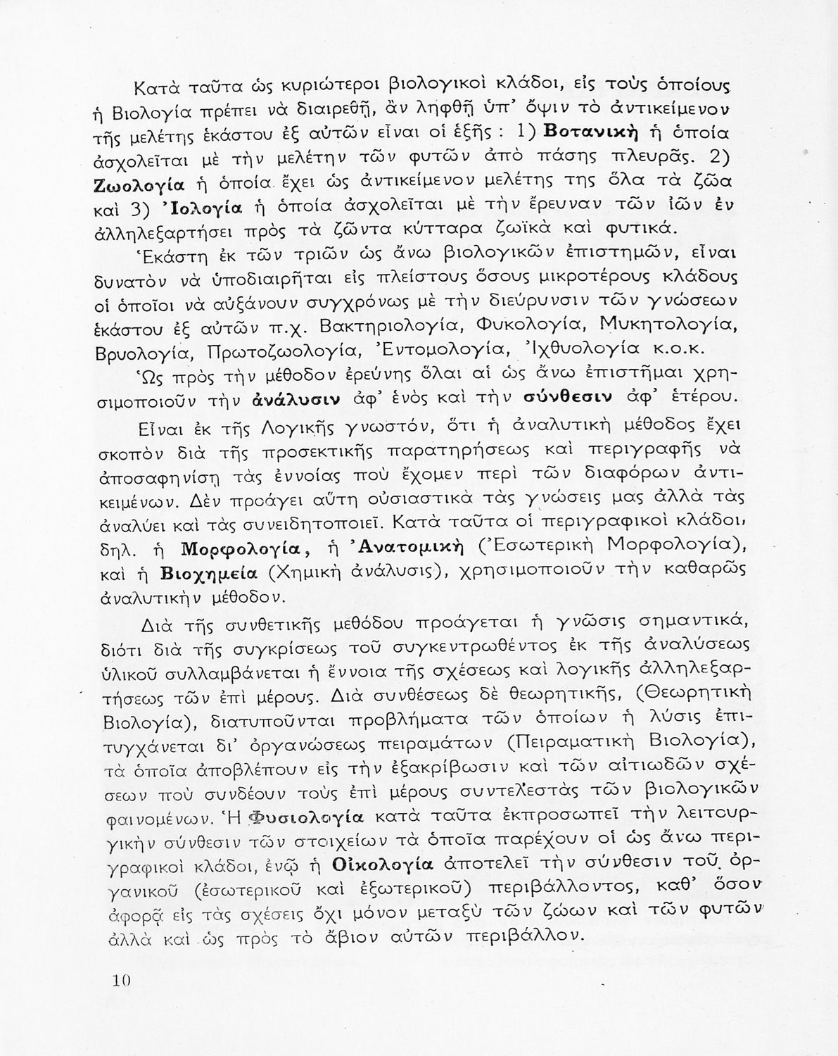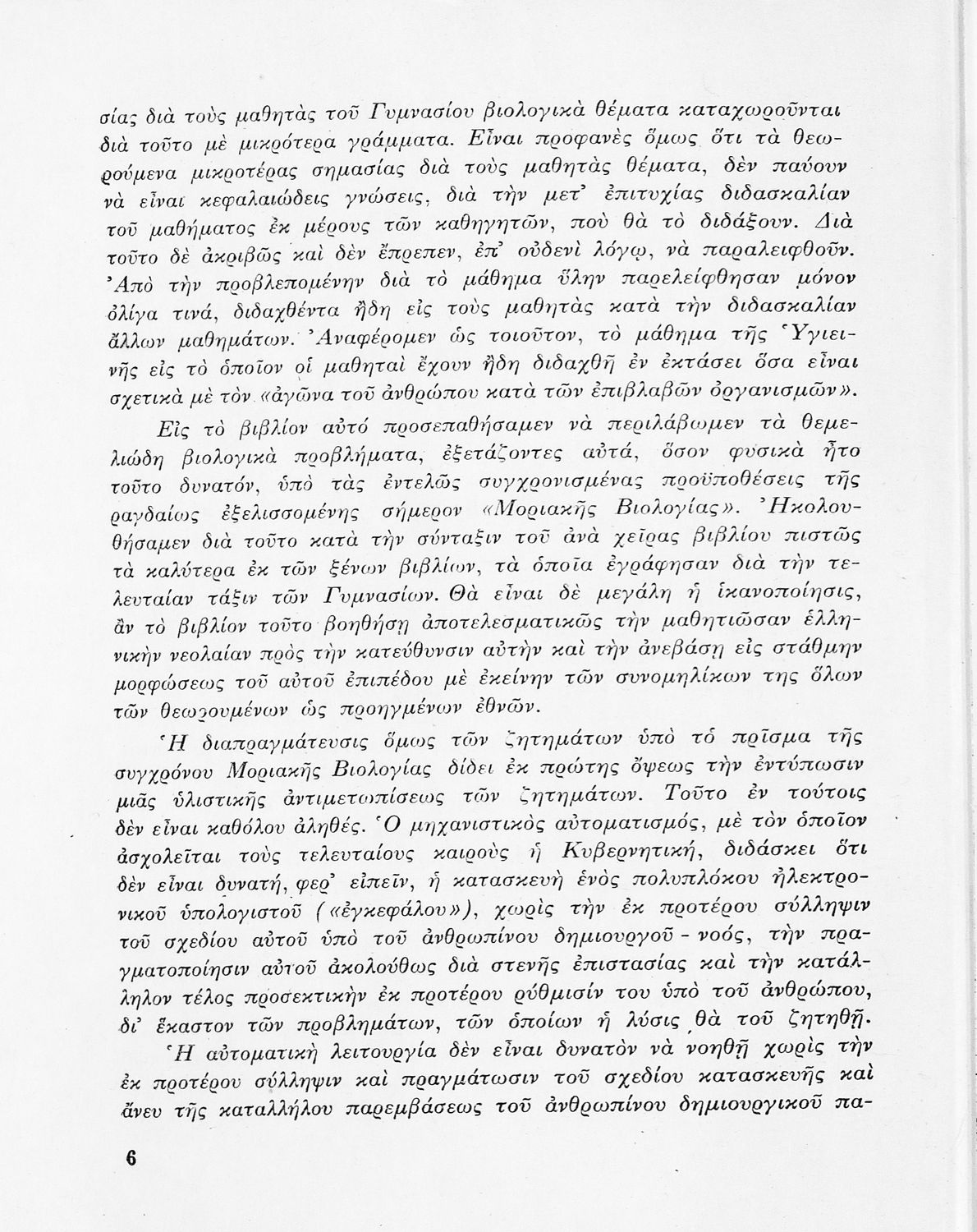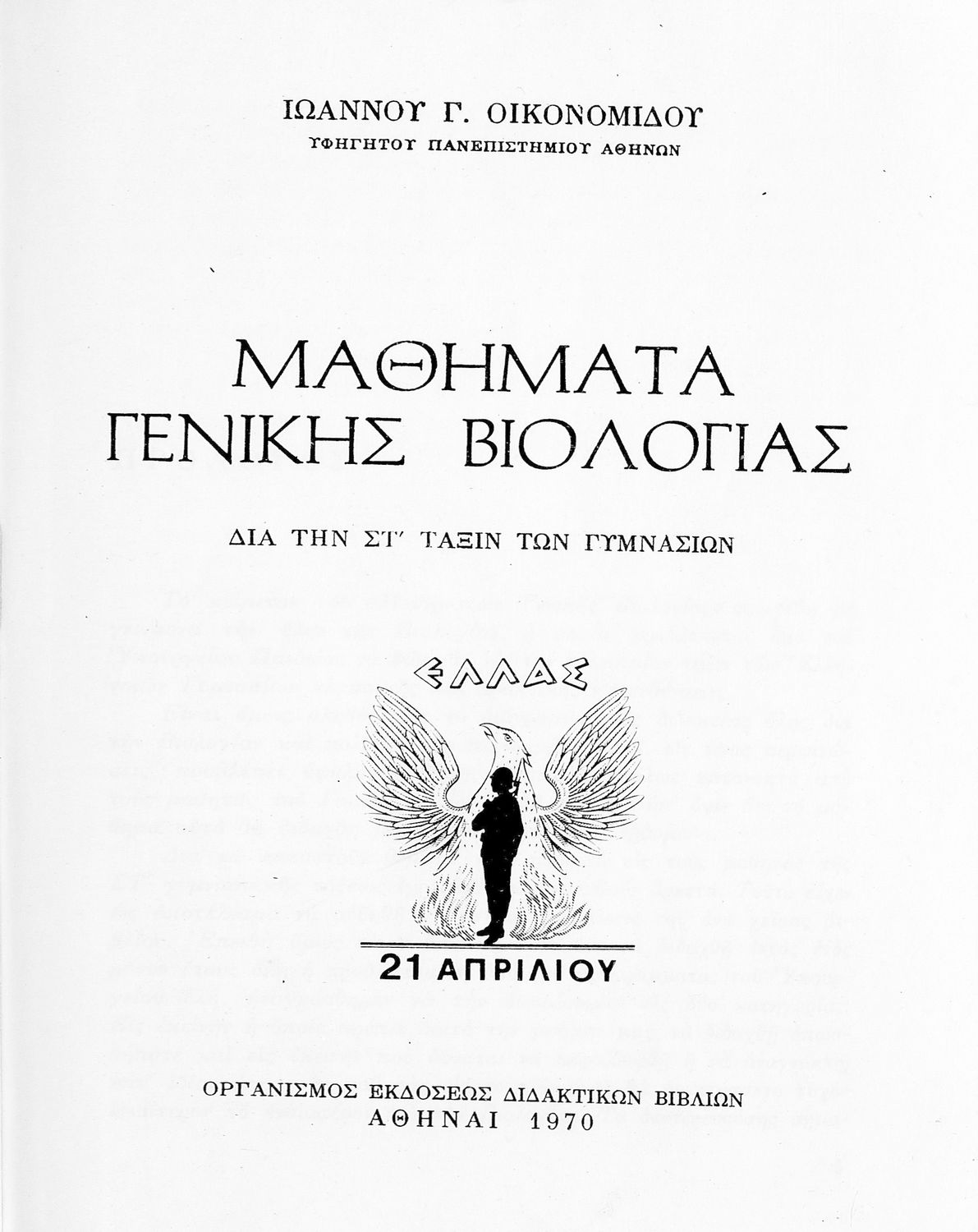 Σχολικό εγχειρίδιο Βιολογίας ΣΤ΄ Γυμνασίου που εστιάζει στις συνθήκες γέννησης, μεταβολής και θανάτου των έμβιων οργανισμών. Φέρει το σύμβολο της δικτατορίας. Ο συγγραφέας ήταν υφηγητής του Πανεπιστημίου Αθηνών.