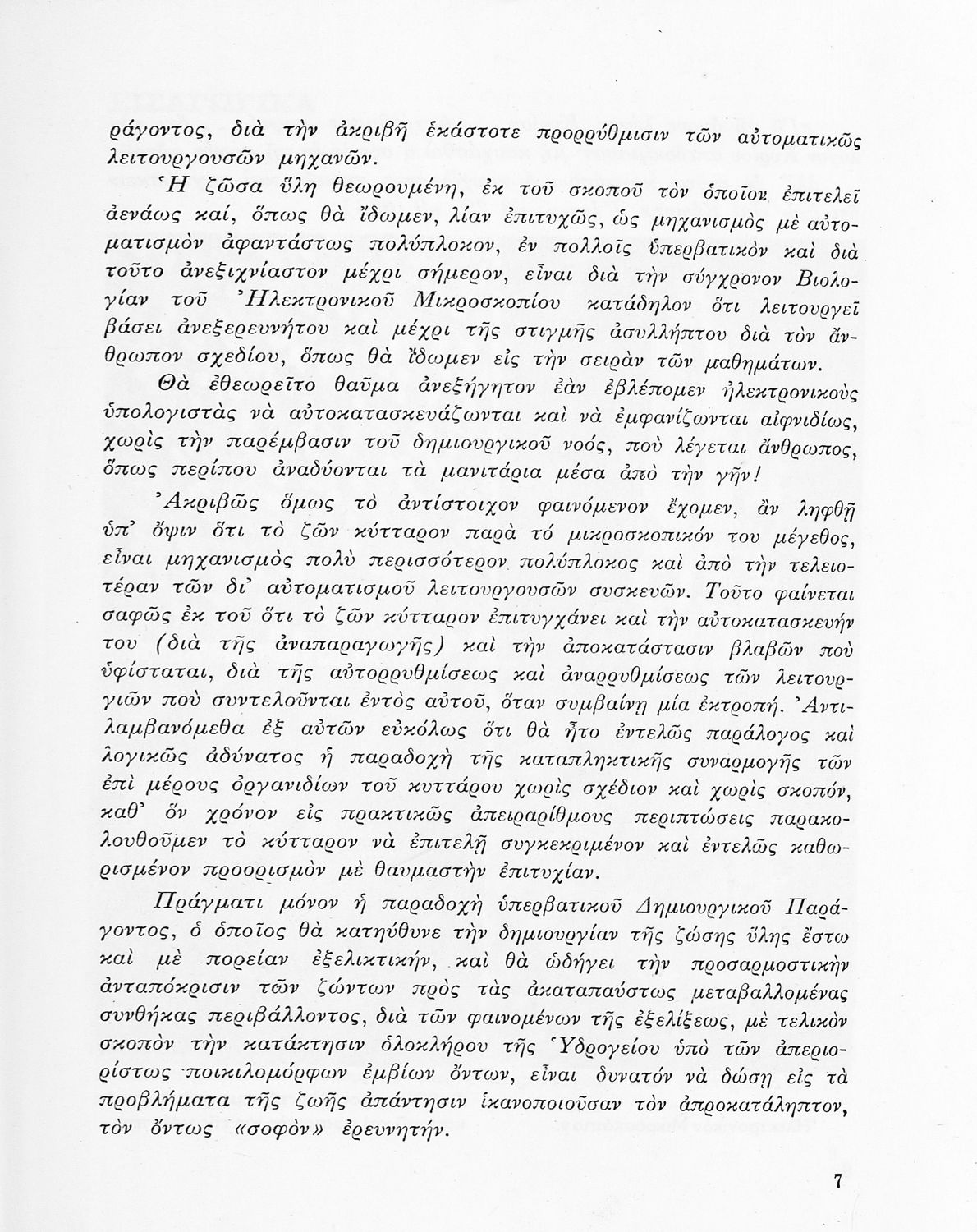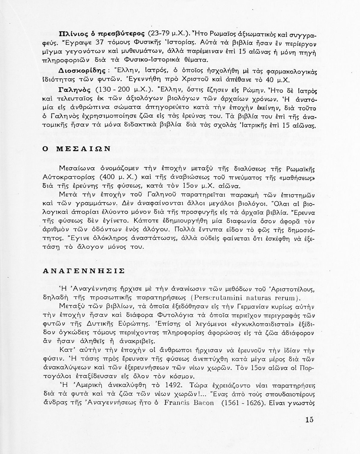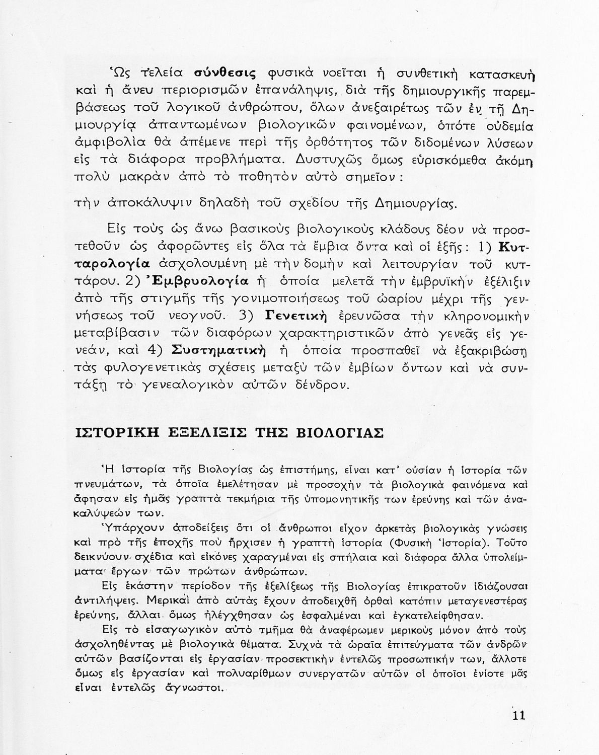 Σχολικό εγχειρίδιο Βιολογίας ΣΤ΄ Γυμνασίου που εστιάζει στις συνθήκες γέννησης, μεταβολής και θανάτου των έμβιων οργανισμών. Φέρει το σύμβολο της δικτατορίας. Ο συγγραφέας ήταν υφηγητής του Πανεπιστημίου Αθηνών.
