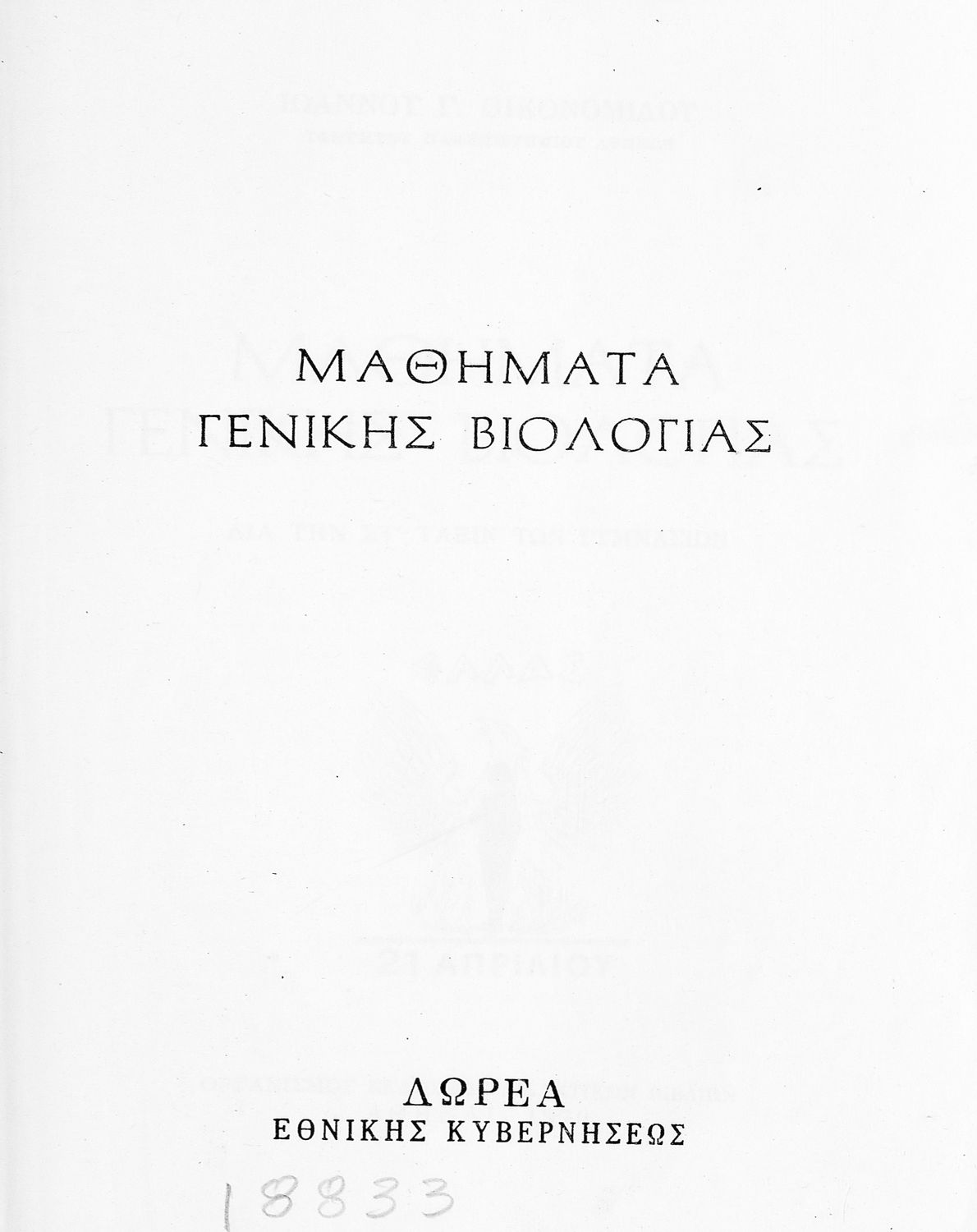 Τίτλος: Μαθήματα Γενικής Βιολογίας δια την ΣΤ΄ τάξιν των Γυμνασίων