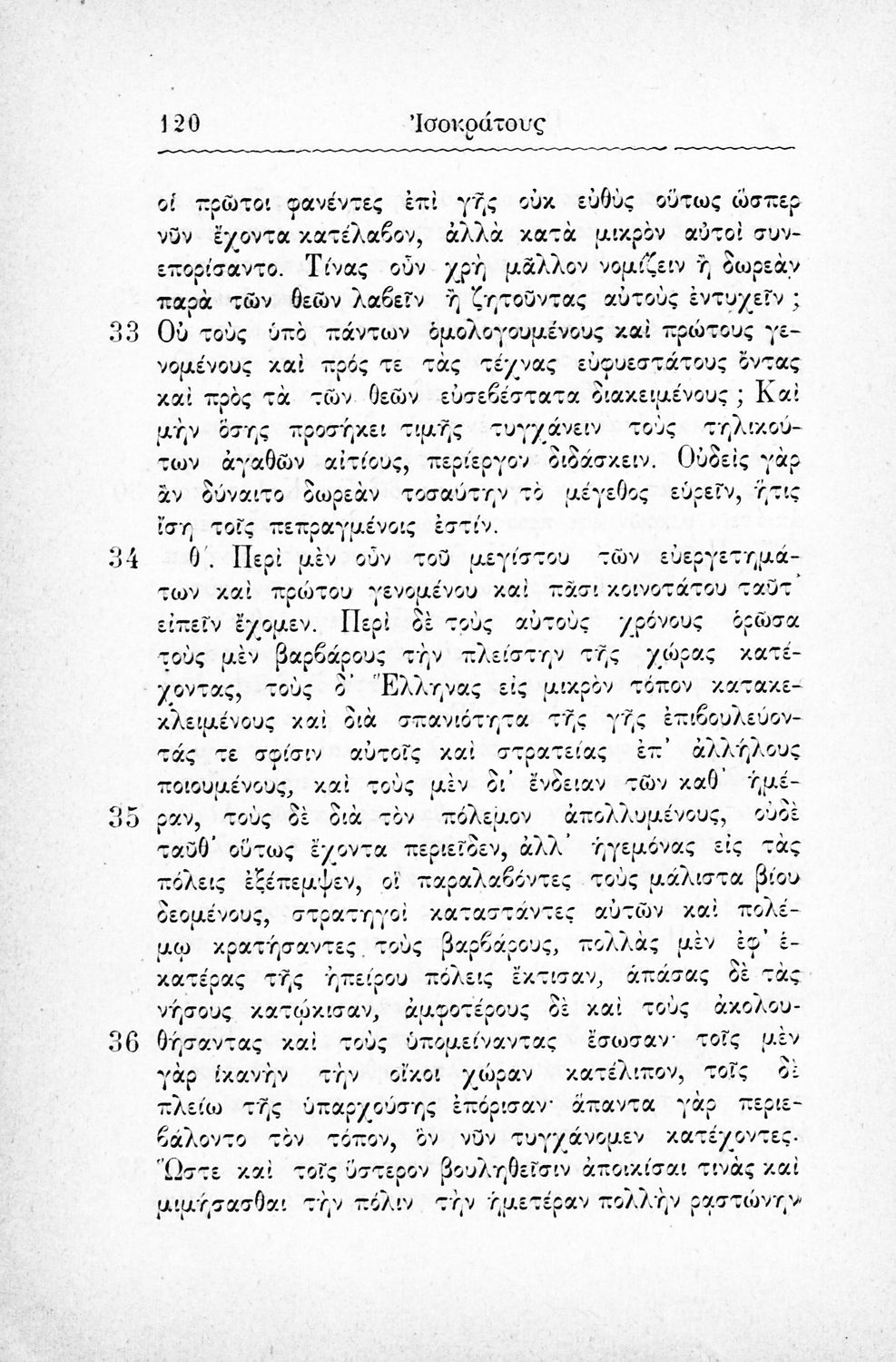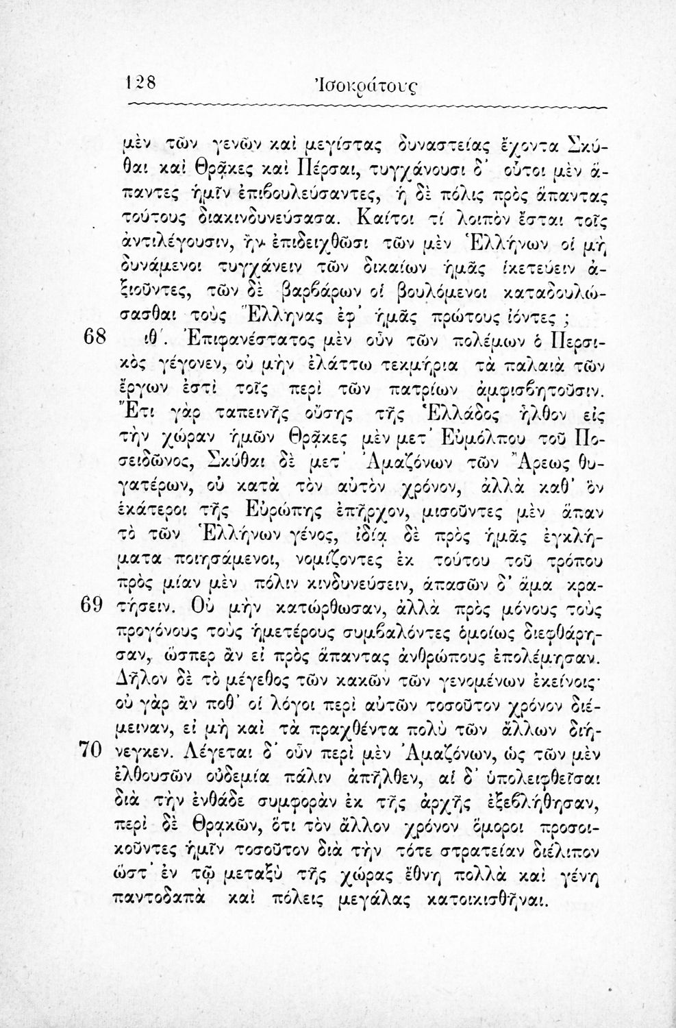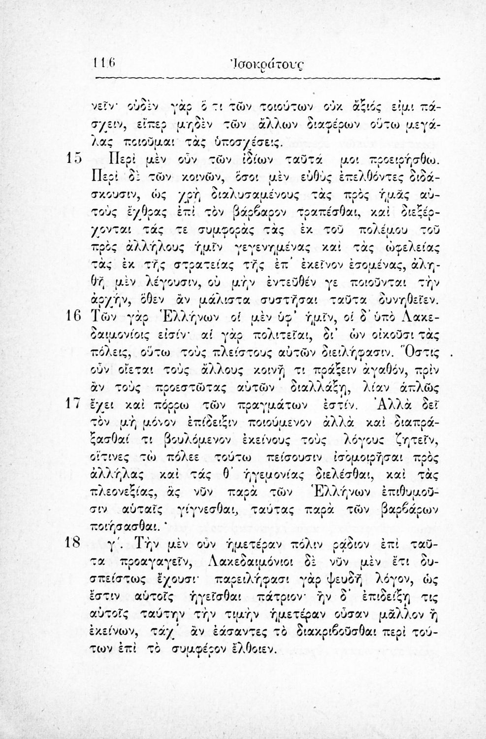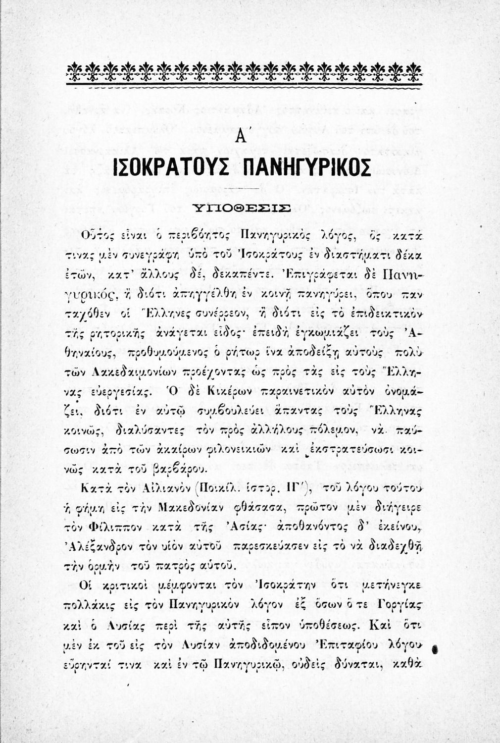 Σχολικό εγχειρίδιο Αρχαίων Ελληνικών για τα Ιερατικά Σχολεία. Ο τόμος περιέχει : «Ισοκράτους, το εις Ευαγόρα εγκώμιον, και τον Πανηγυρικόν- Πλουτάρχου, εκ των Παραλλήλων βίων τινάς- Ηροδότου, εκ των Ιστοριών ...
