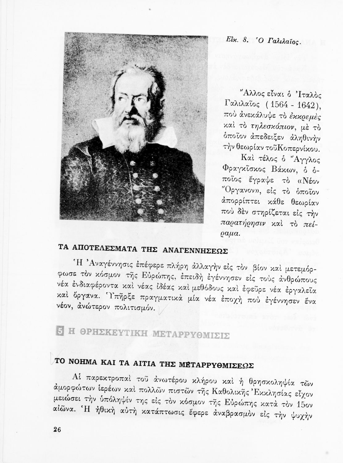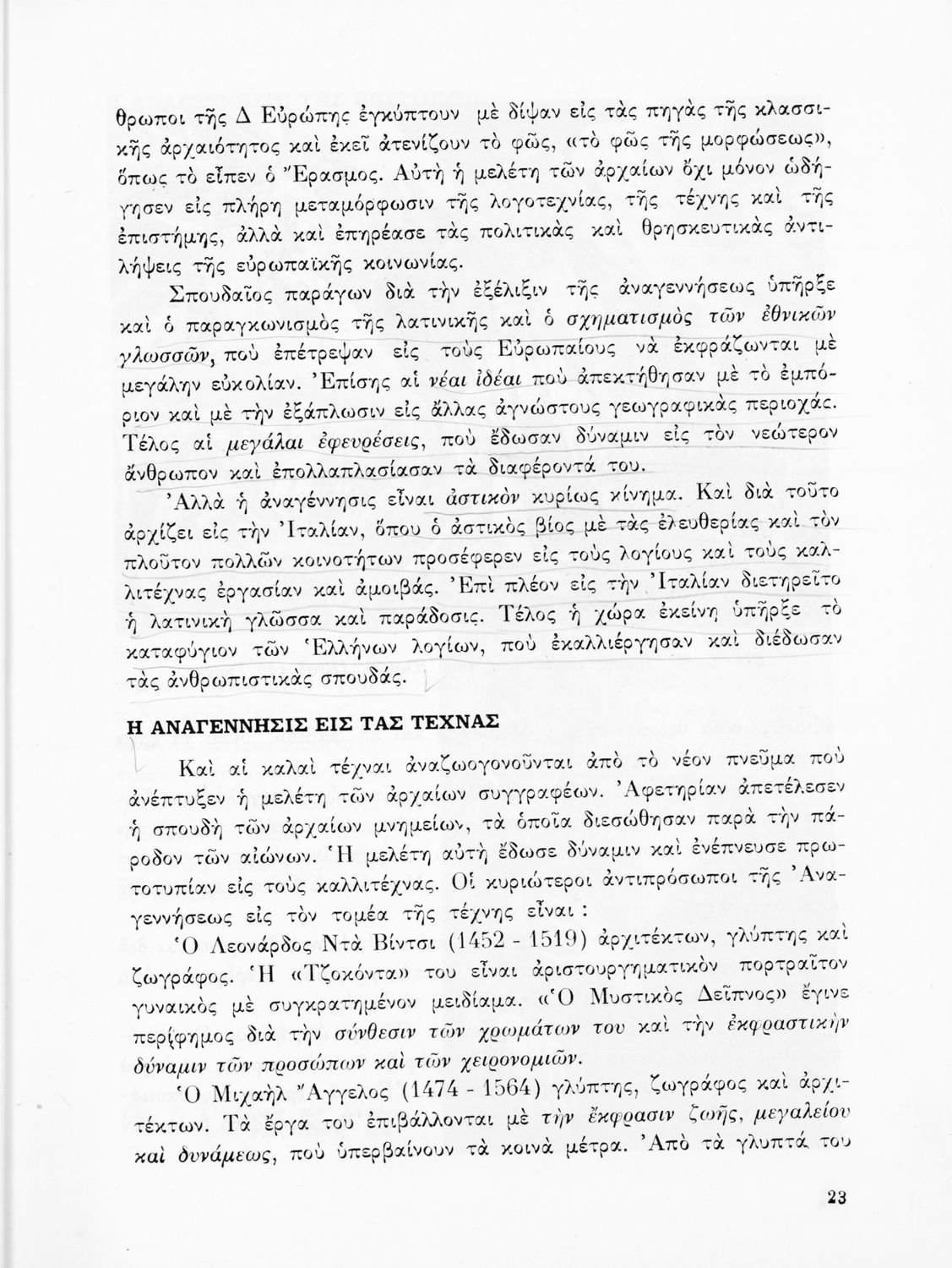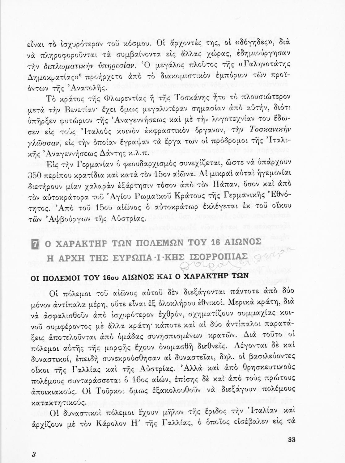 Σχολικό εγχειρίδιο Ιστορίας Γ΄ και ΣΤ΄ Γυμνασίου που καλύπτει την περίοδο της Αναγέννησης και του Διαφωτισμού στην Ευρώπη και την προετοιμασία της Ελληνικής Επανάστασης. Συνοπτικά αναφέρεται στο διάστημα από τη βασίλεια του 'Όθωνα ως τους δύο Παγκόσμιους Πολέμους και τον Ψυχρό Πόλεμο. Παρουσιάζει και την πνευματική κίνηση κατά τον 19ο και 20ο αιώνα. Φέρει το σύμβολο της δικτατορίας.
