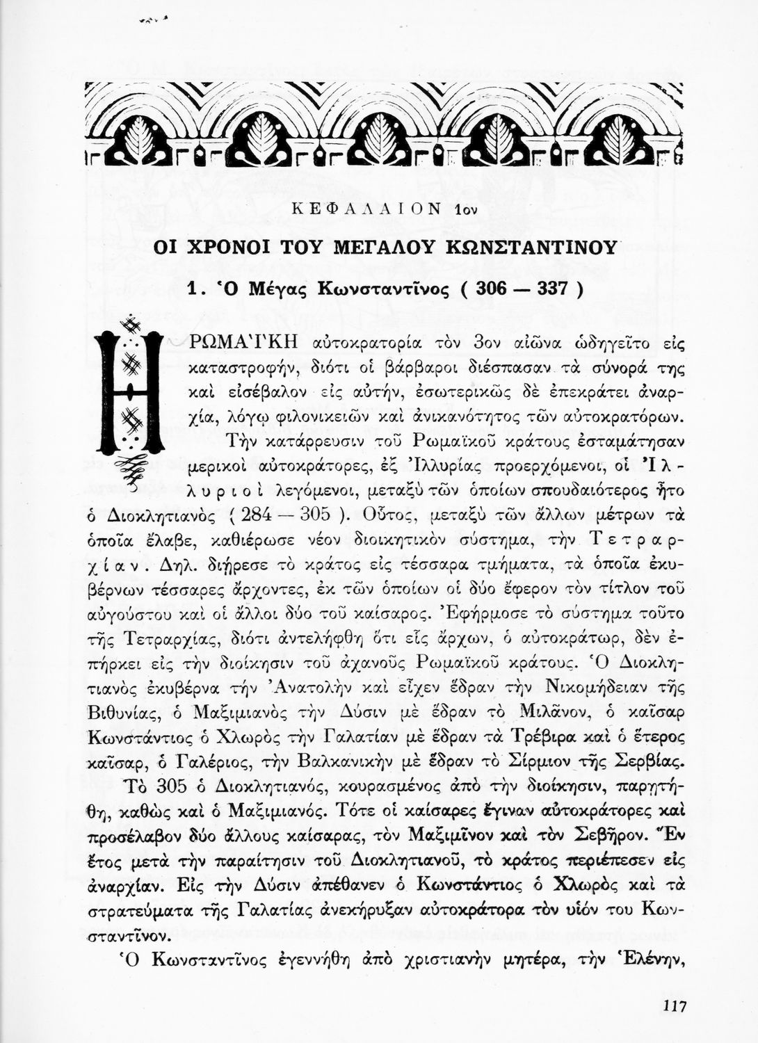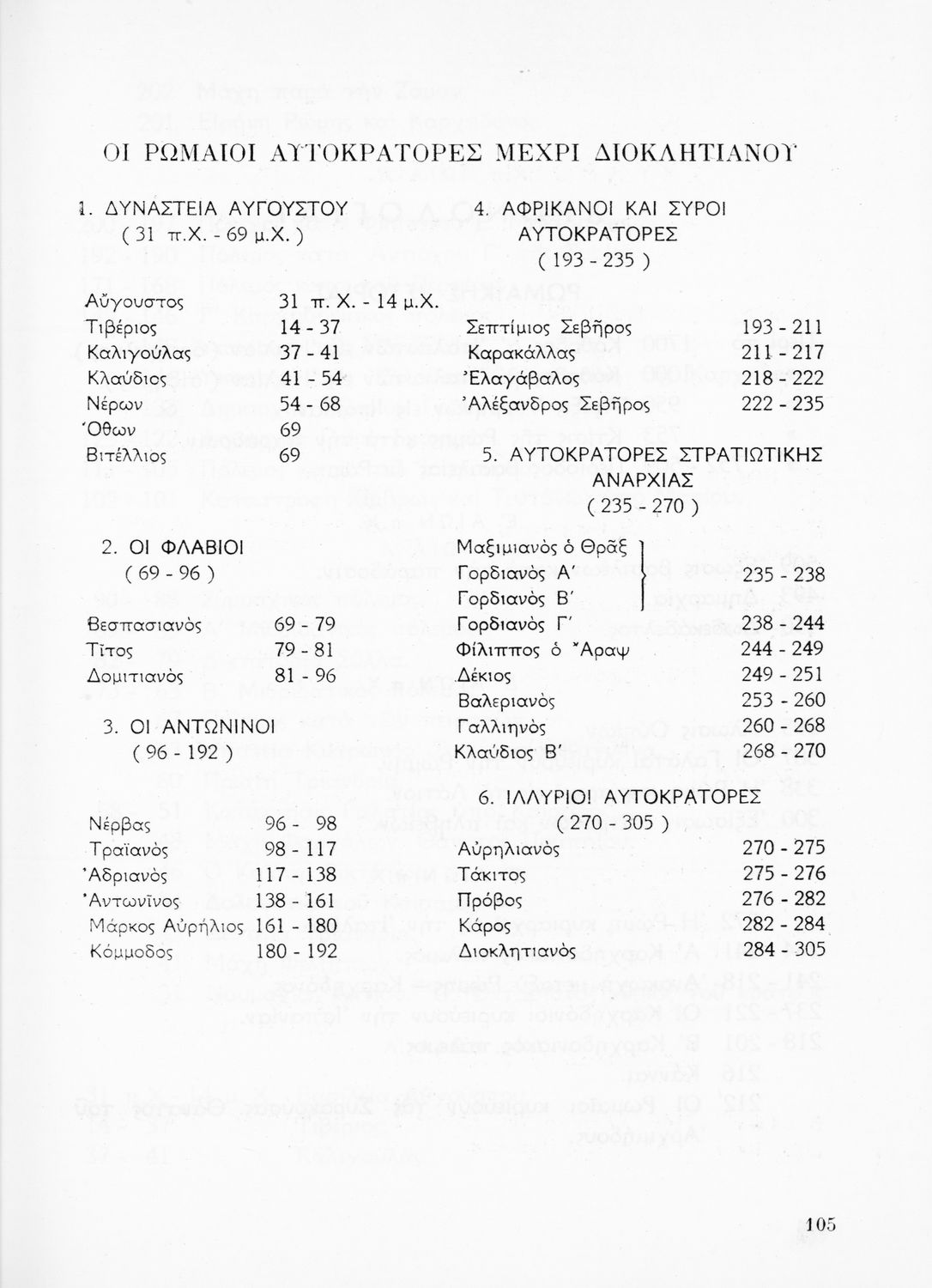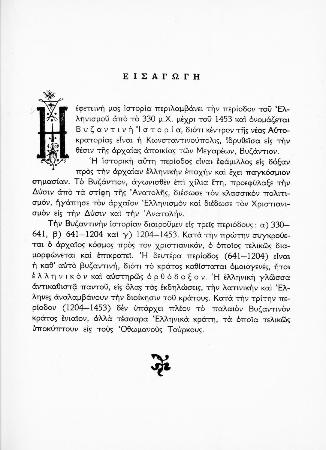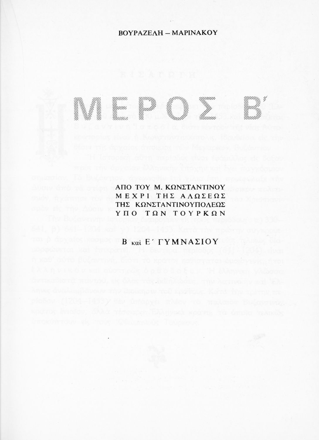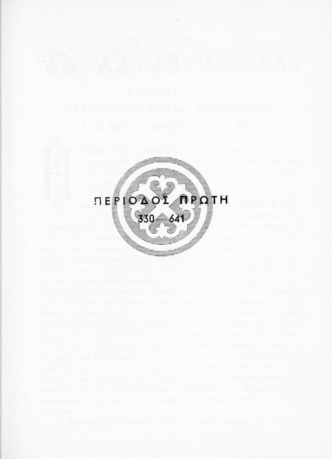 Σχολικό εγχειρίδιο Ιστορίας Β΄ και Ε΄ Γυμνασίου που καλύπτει την περίοδο από την άνοδο του Μ. Κωνσταντίνου στο θρόνο μέχρι και την άλωση της Κωνσταντινούπολης. Παρουσιάζει και τα πνευματικά και καλλιτεχνικά ρεύματα της περιόδου. Φέρει το σύμβολο της δικτατορίας.