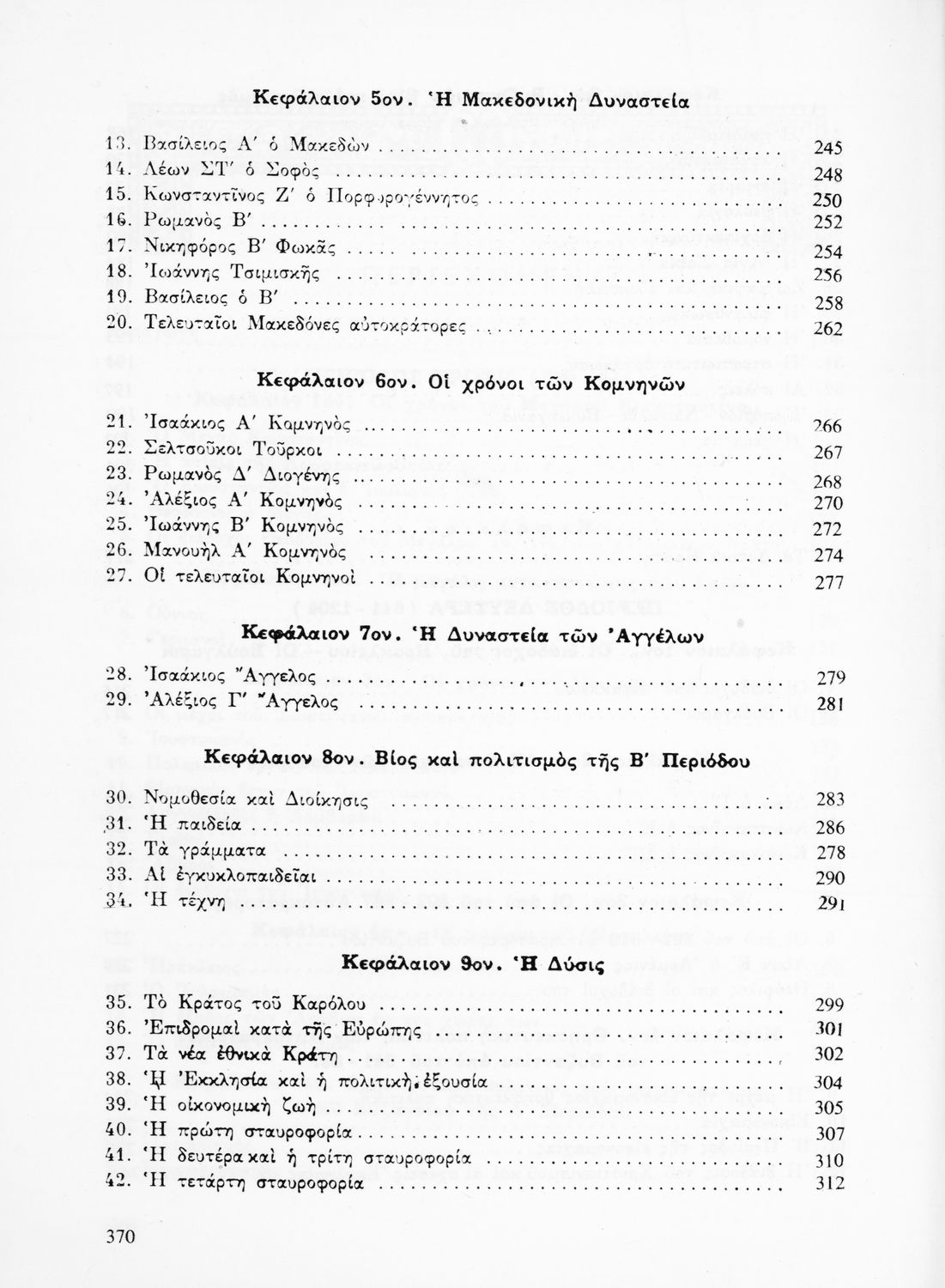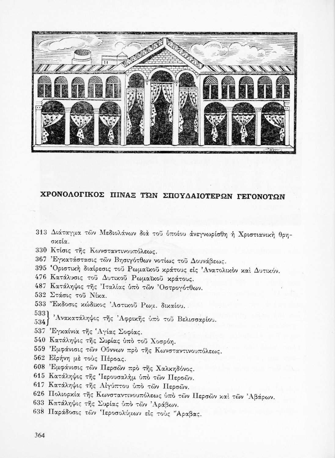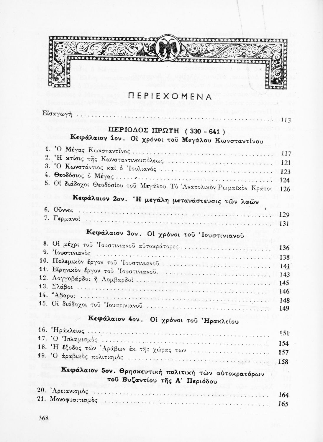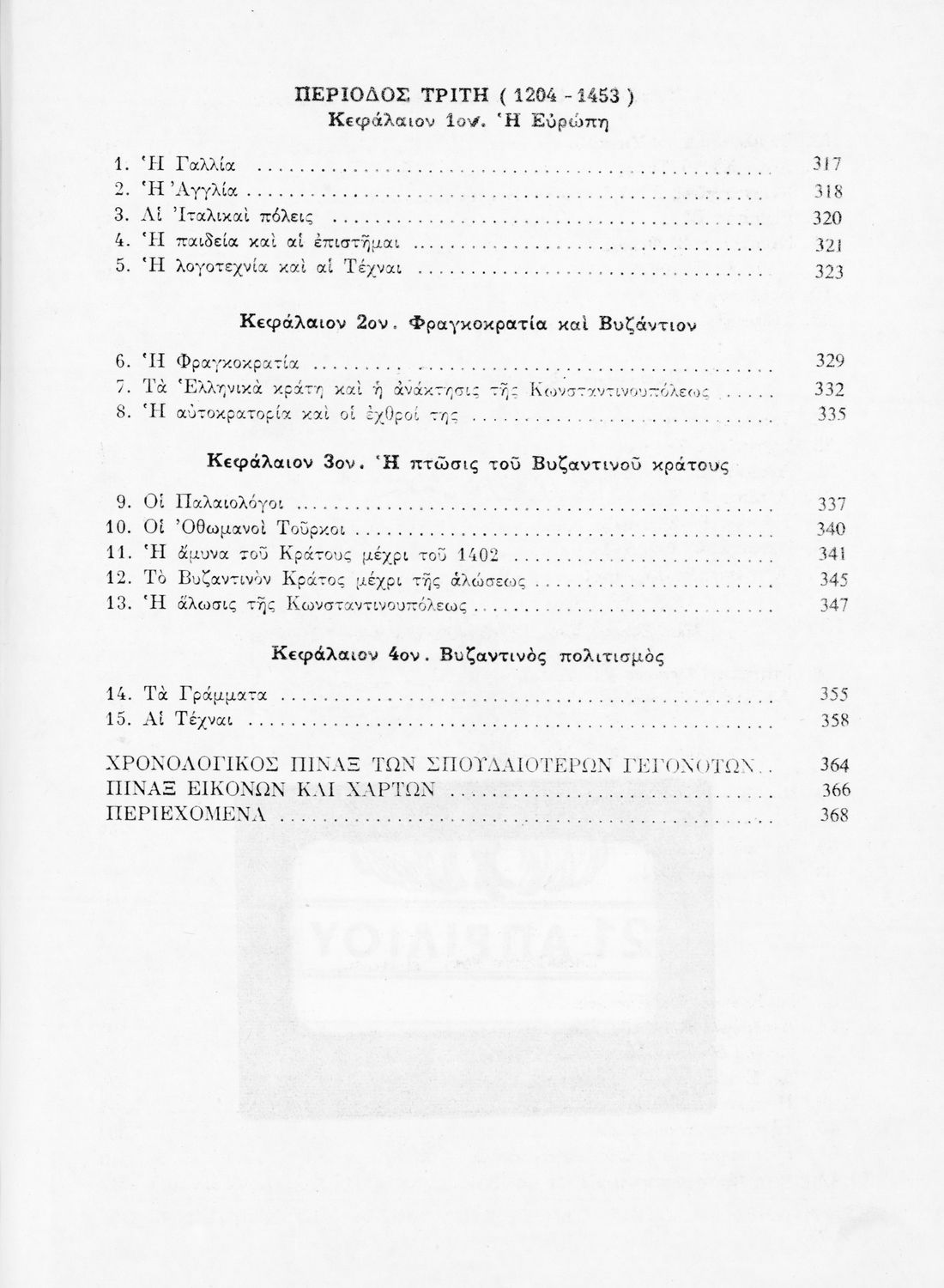 Σχολικό εγχειρίδιο Ιστορίας Β΄ και Ε΄ Γυμνασίου που καλύπτει την περίοδο από την άνοδο του Μ. Κωνσταντίνου στο θρόνο μέχρι και την άλωση της Κωνσταντινούπολης. Παρουσιάζει και τα πνευματικά και καλλιτεχνικά ρεύματα της περιόδου. Φέρει το σύμβολο της δικτατορίας.