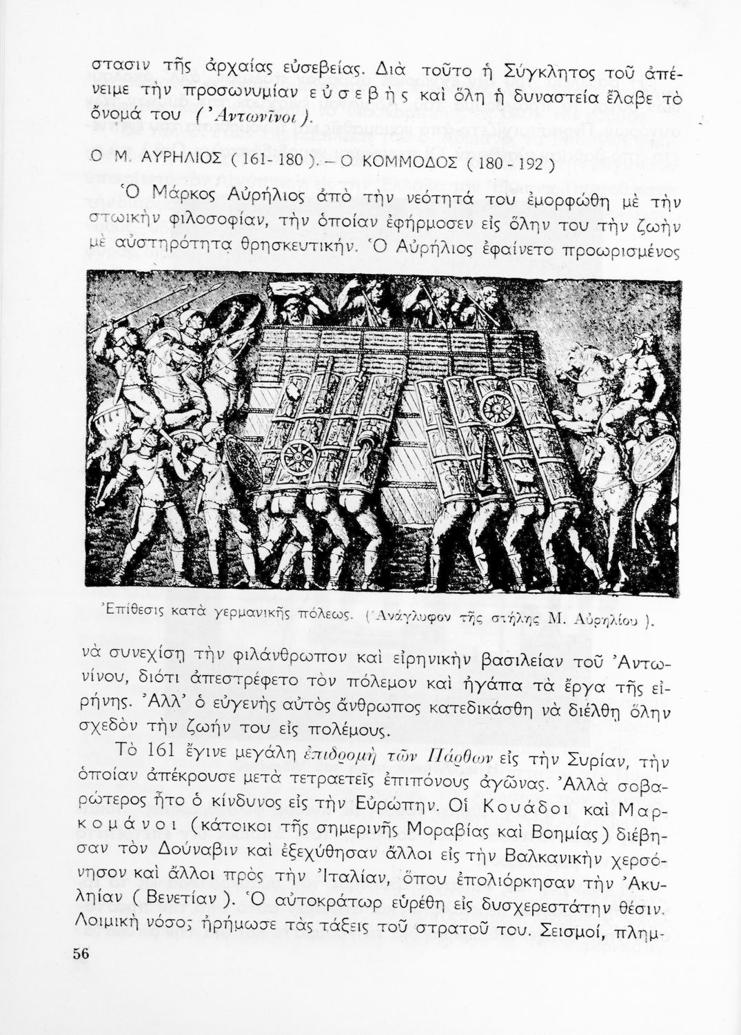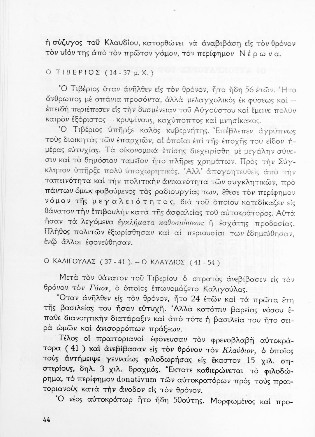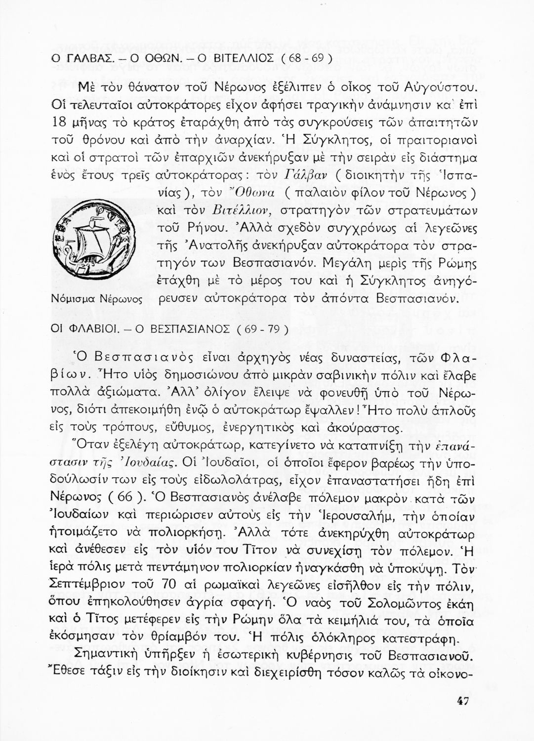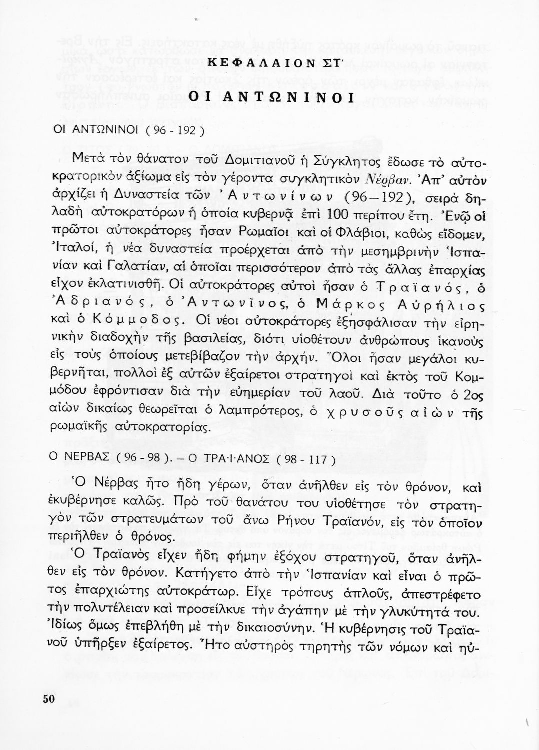 Σχολικό εγχειρίδιο Ιστορίας Β΄ και Ε΄ Γυμνασίου που καλύπτει την περίοδο από την άνοδο του Μ. Κωνσταντίνου στο θρόνο μέχρι και την άλωση της Κωνσταντινούπολης. Παρουσιάζει και τα πνευματικά και καλλιτεχνικά ρεύματα της περιόδου. Φέρει το σύμβολο της δικτατορίας.