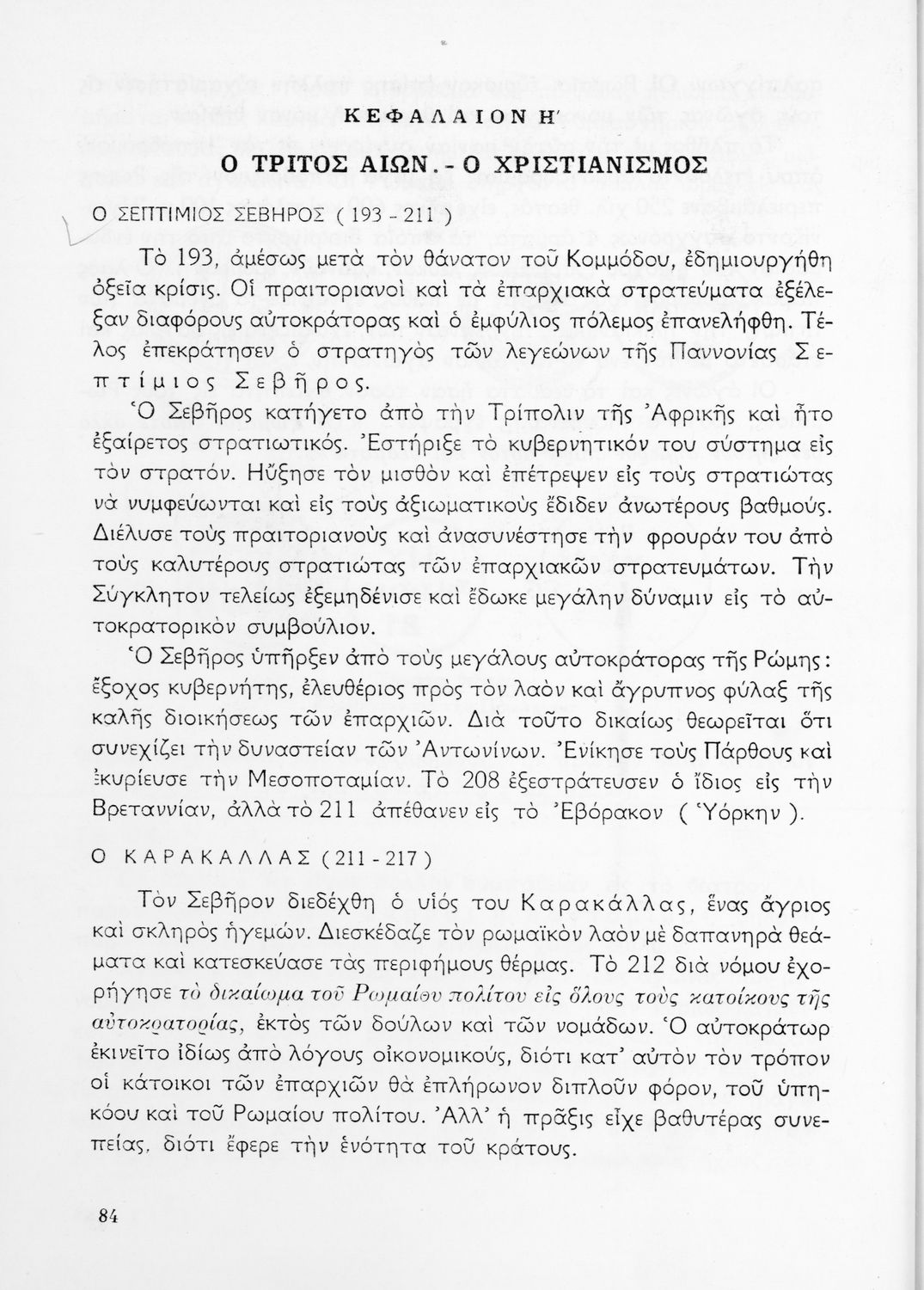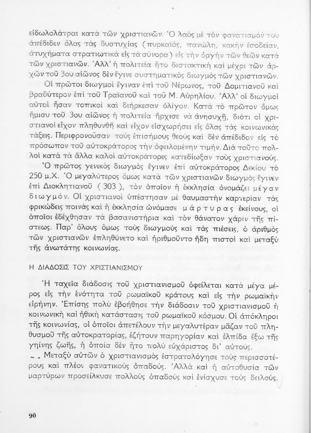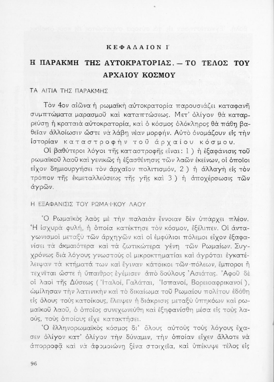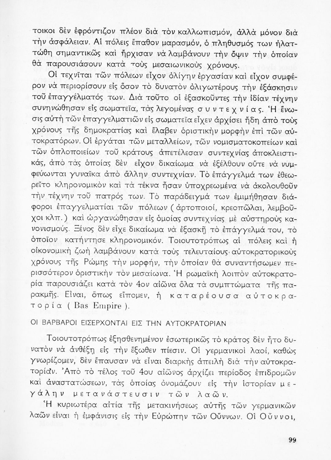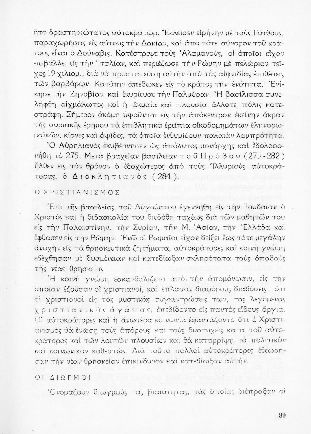 Σχολικό εγχειρίδιο Ιστορίας Β΄ και Ε΄ Γυμνασίου που καλύπτει την περίοδο από την άνοδο του Μ. Κωνσταντίνου στο θρόνο μέχρι και την άλωση της Κωνσταντινούπολης. Παρουσιάζει και τα πνευματικά και καλλιτεχνικά ρεύματα της περιόδου. Φέρει το σύμβολο της δικτατορίας.