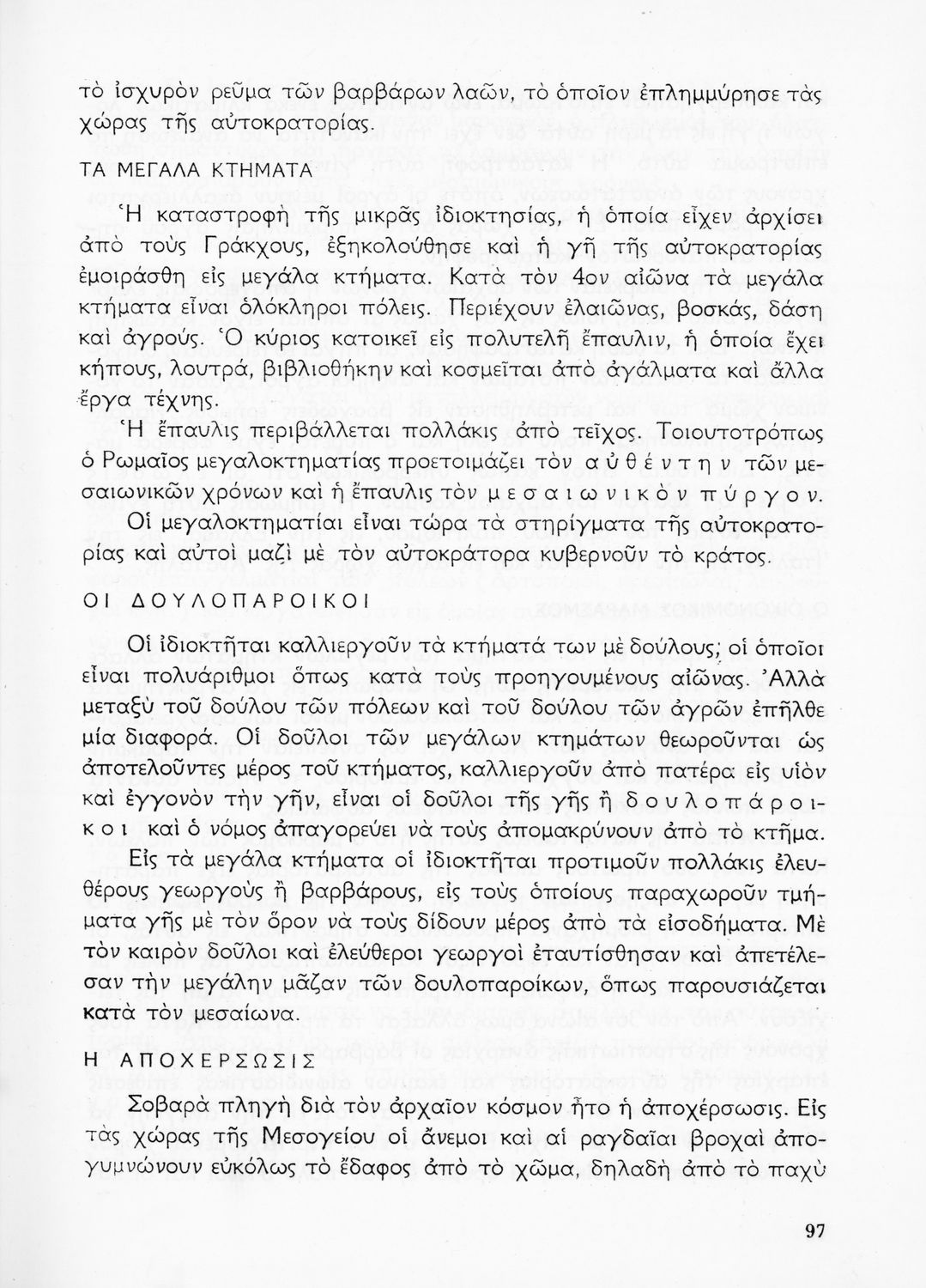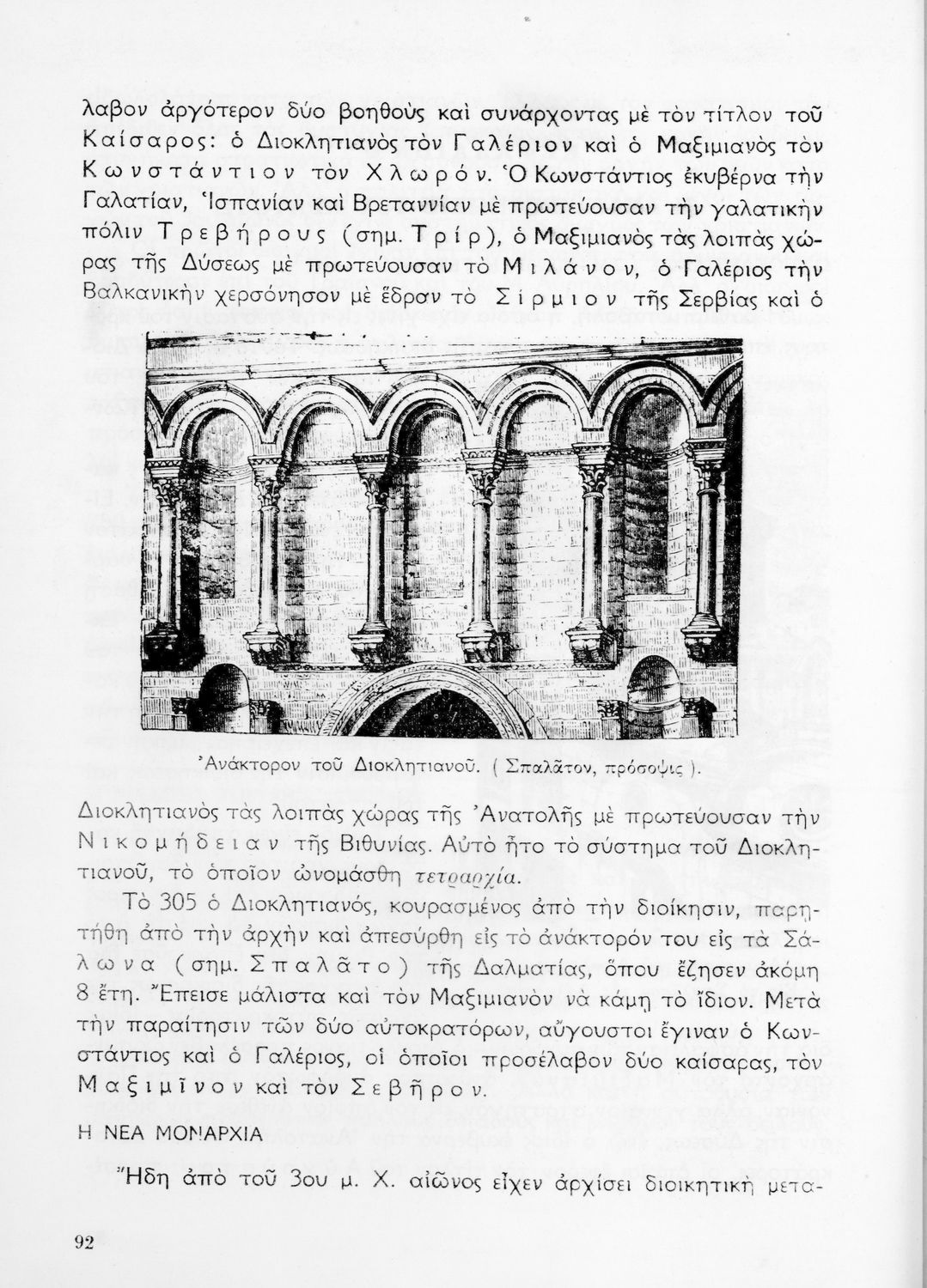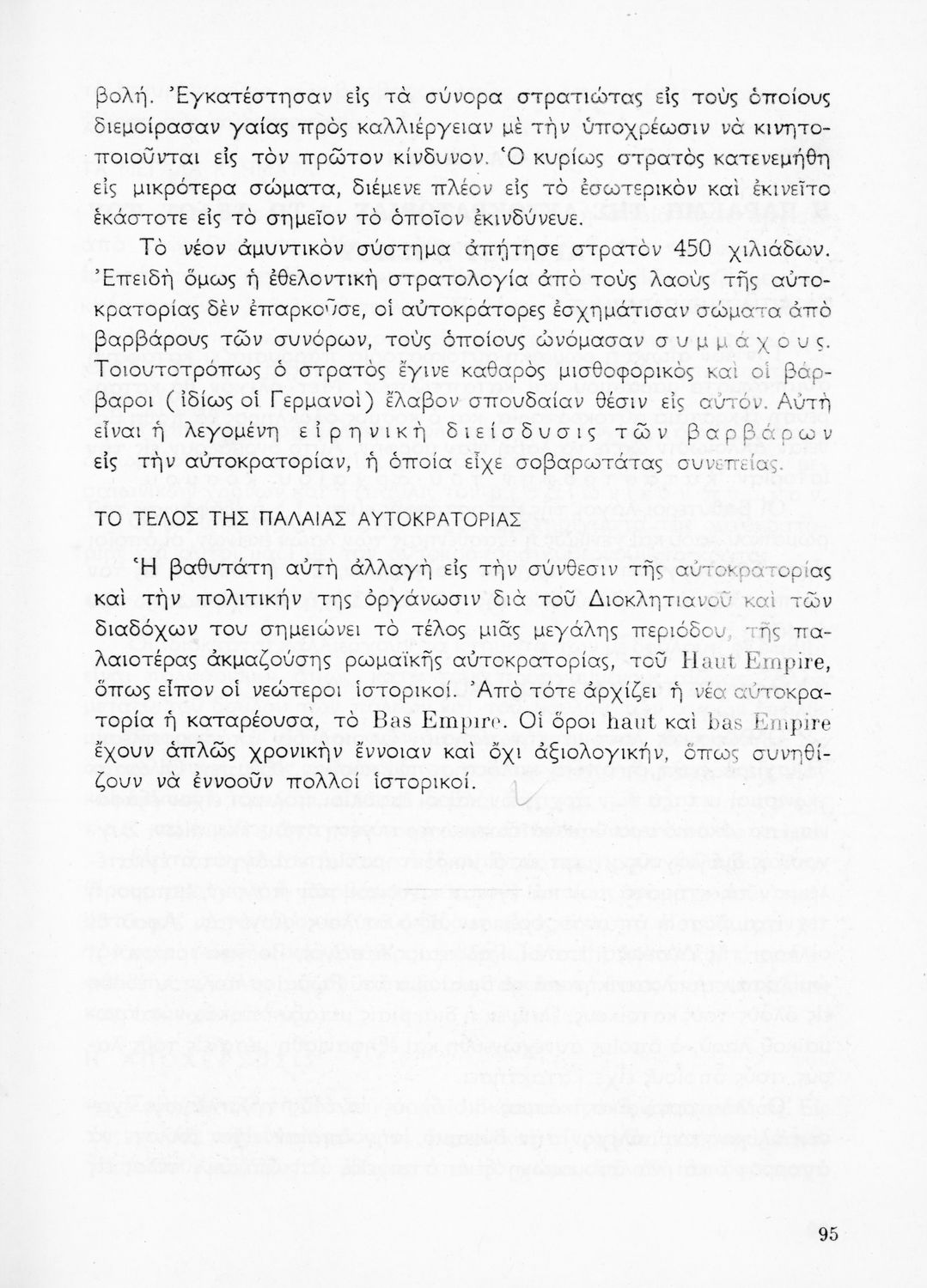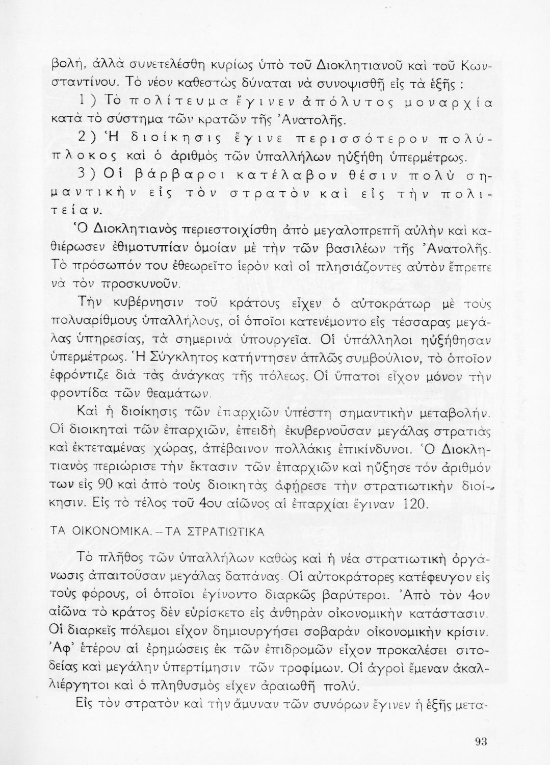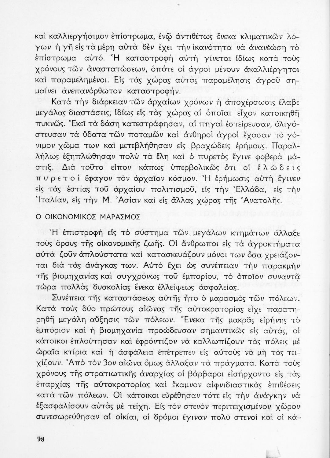Σχολικό εγχειρίδιο Ιστορίας Β΄ και Ε΄ Γυμνασίου που καλύπτει την περίοδο από την άνοδο του Μ. Κωνσταντίνου στο θρόνο μέχρι και την άλωση της Κωνσταντινούπολης. Παρουσιάζει και τα πνευματικά και καλλιτεχνικά ρεύματα της περιόδου. Φέρει το σύμβολο της δικτατορίας.
