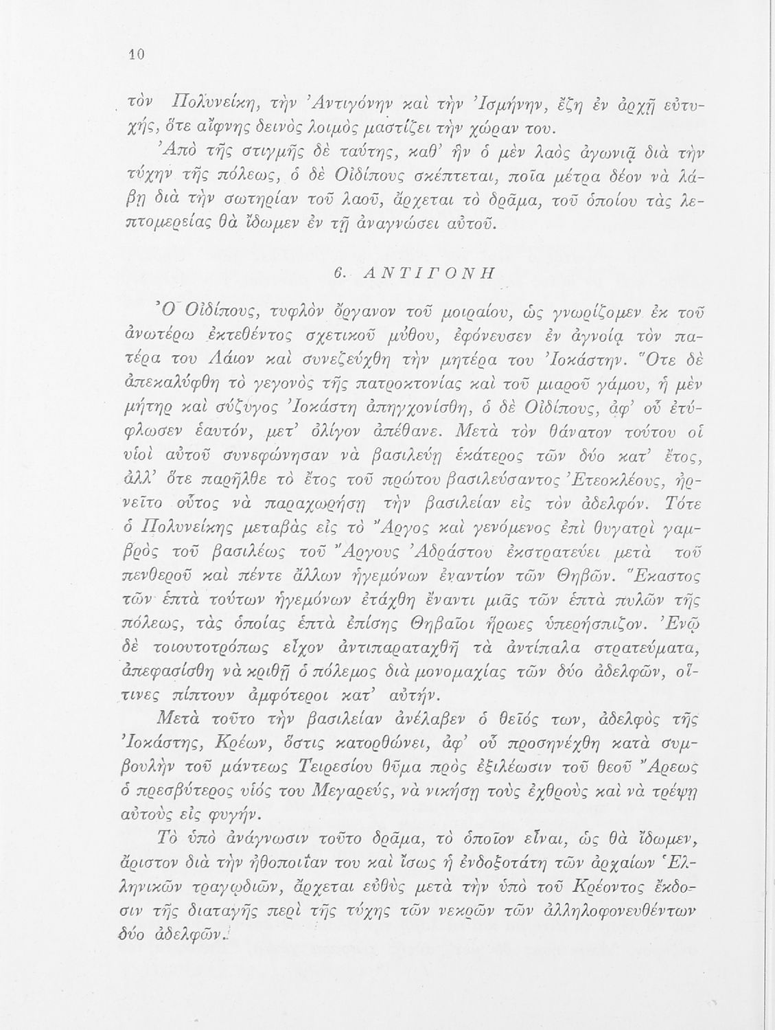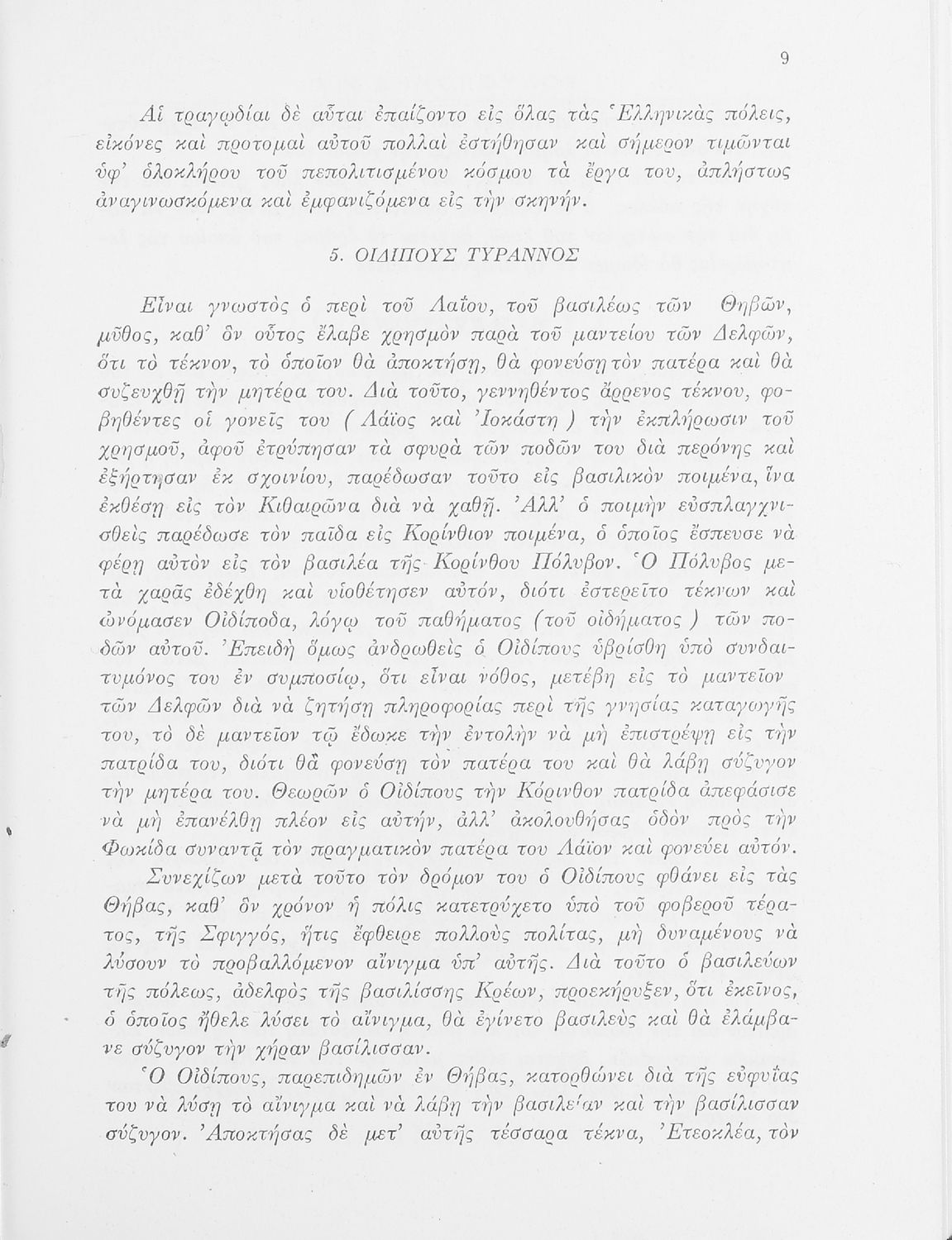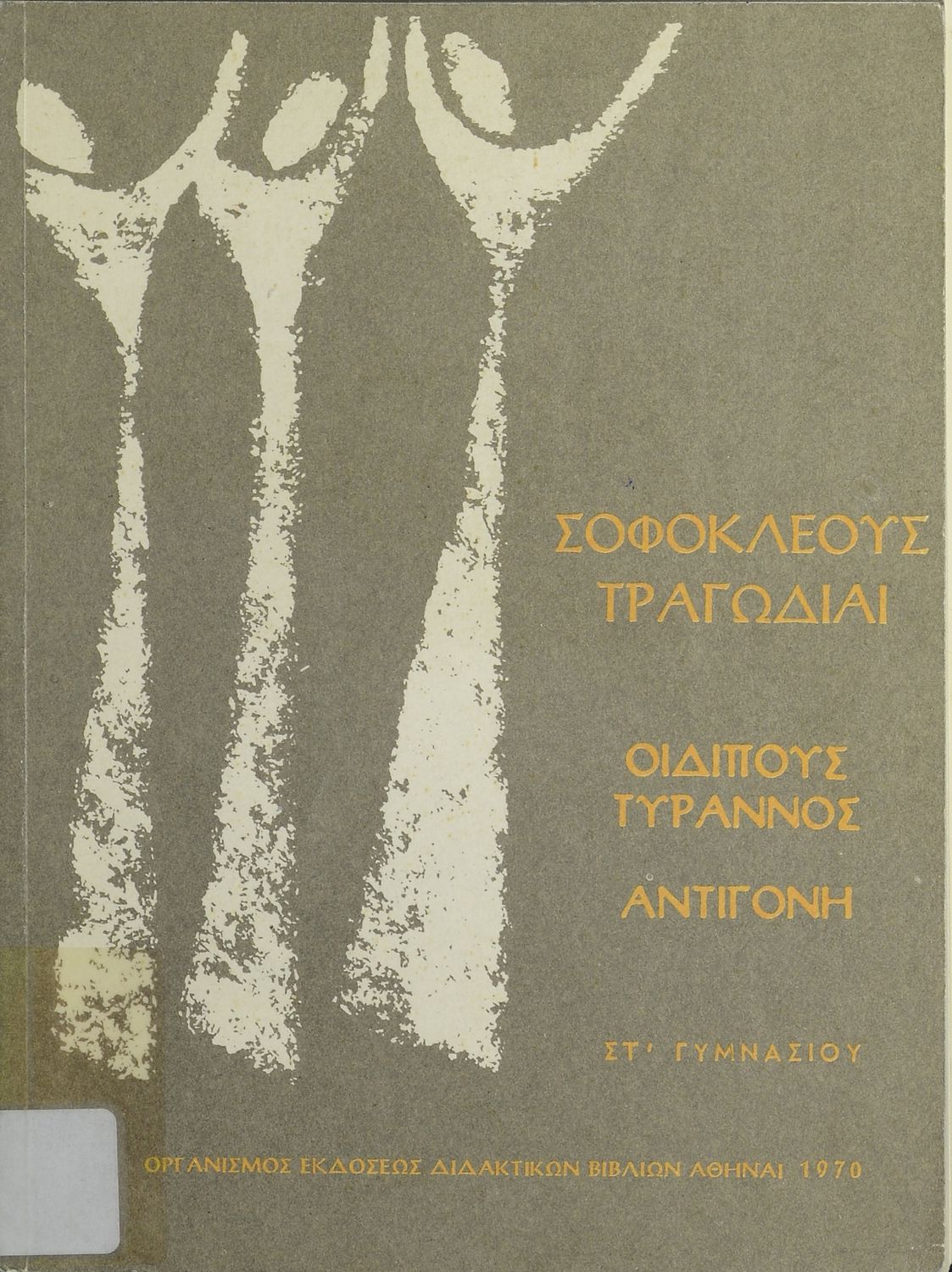 Σχολικό εγχειρίδιο της ΣΤ΄ Γυμνασίου για το μάθημα των Αρχαίων Ελληνικών. Περιέχει τις τραγωδίες του Σοφοκλή Οιδίπους Τύραννος και Αντιγόνη. Τα κείμενα συνοδεύονται από ερμηνευτικές και λεξιλογικές παρατηρήσεις. Φέρει το σύμβολο της δικτατορίας.