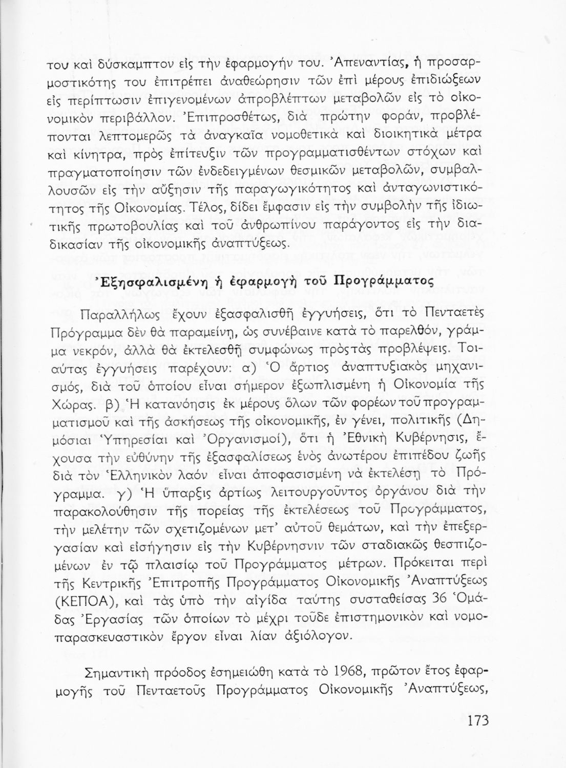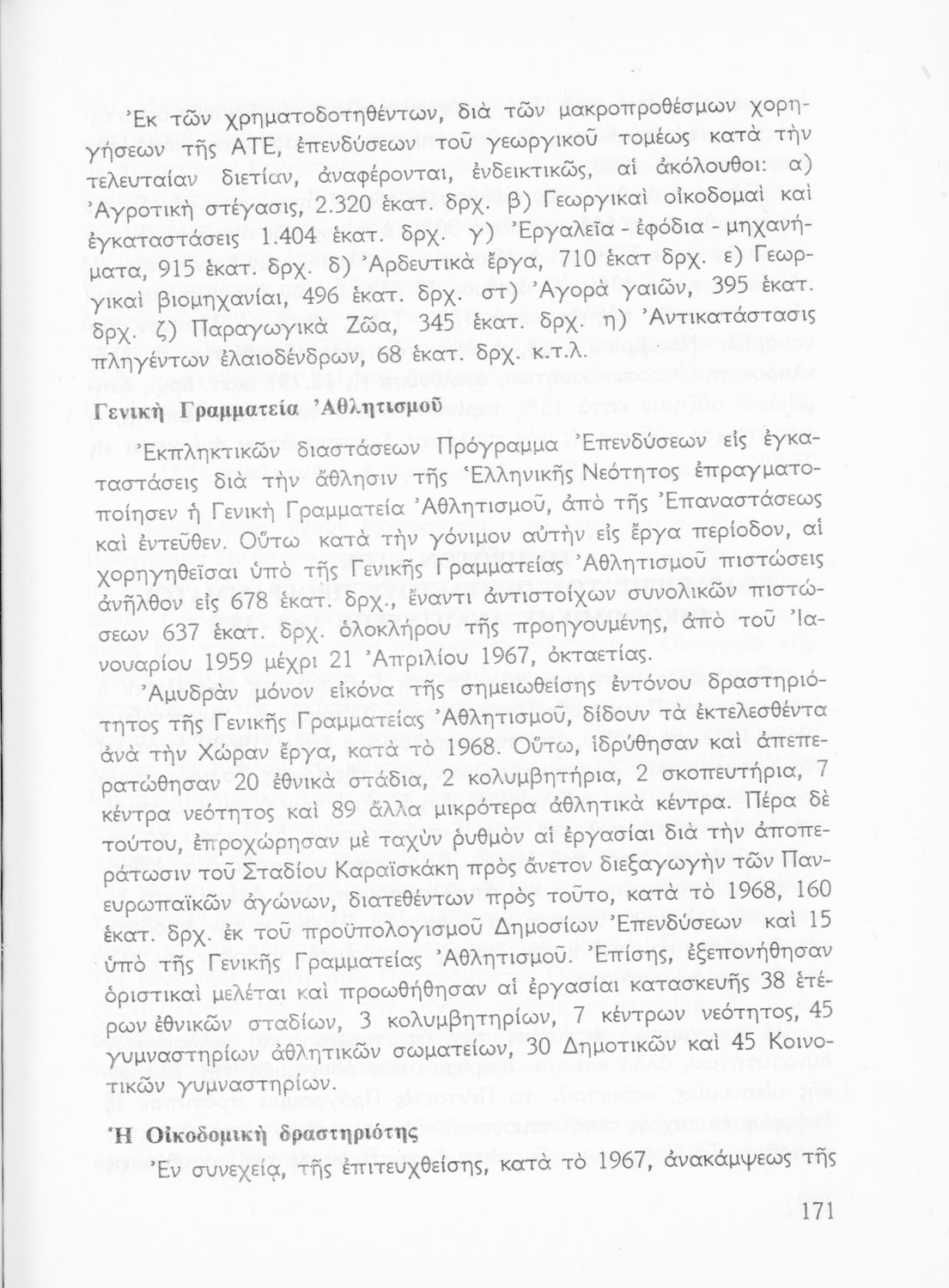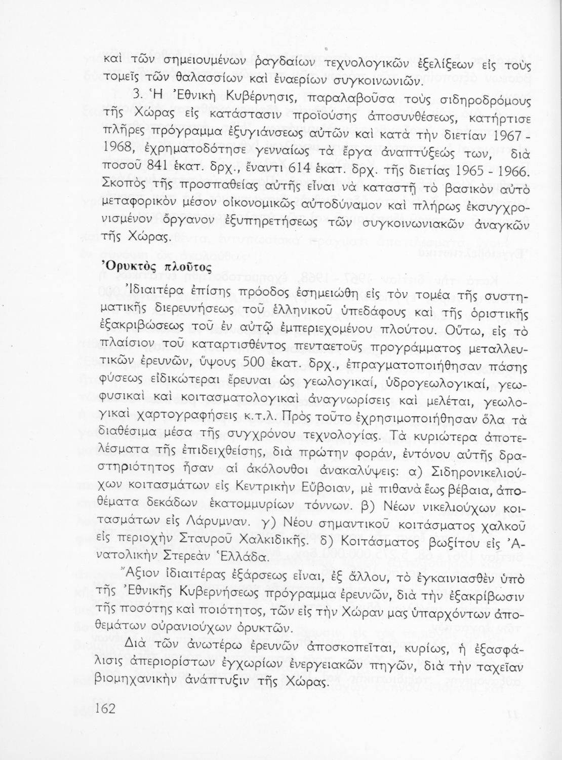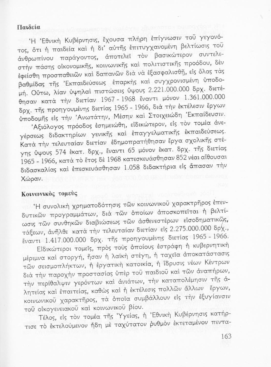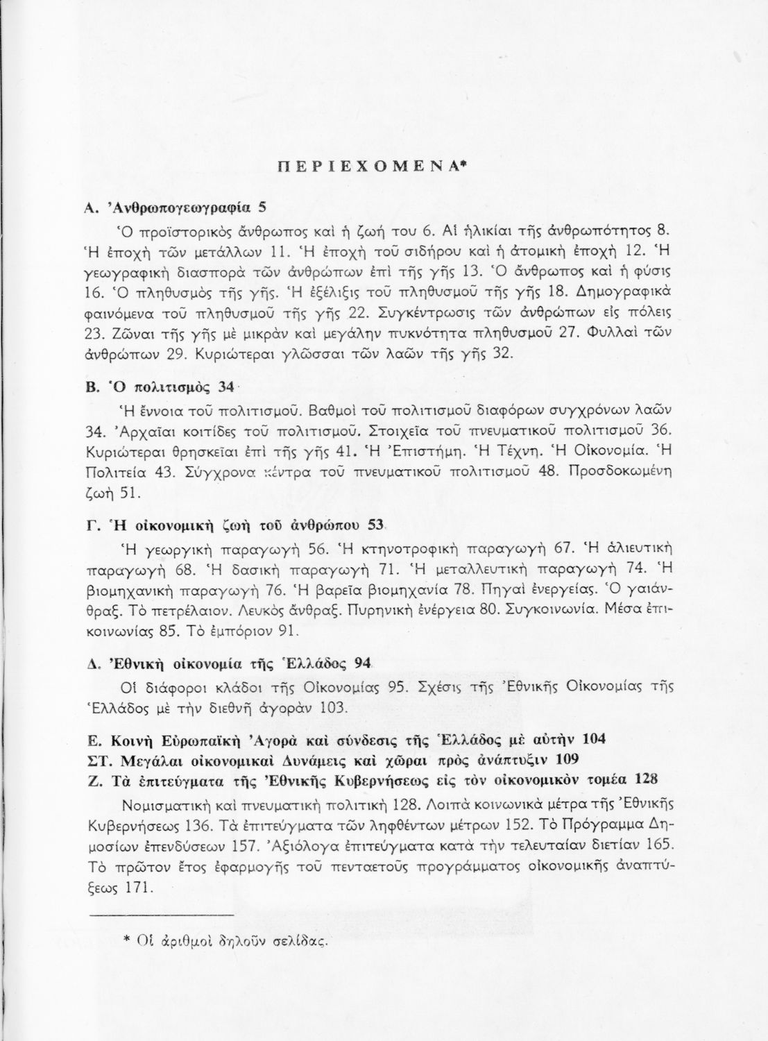 Σχολικό εγχειρίδιο Γεωγραφίας Ε' Γυμνασίου που περιλαμβάνει εισαγωγή στην ανθρωπογεωγραφία και εστιάζει στην οικονομική παραγωγή της Ελλάδας και τη σχέση της με την ΕΟΚ. Περιέχει ειδική αναφορά στα "οικονομικά και κοινωνικά επιτεύγματα της Εθνικής Κυβερνήσεως". Φέρει το σύμβολο της δικτατορίας.
