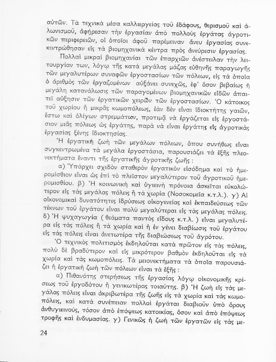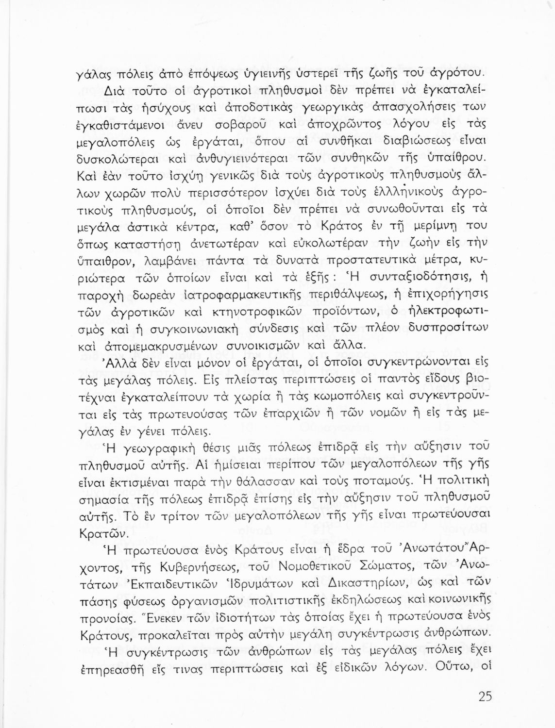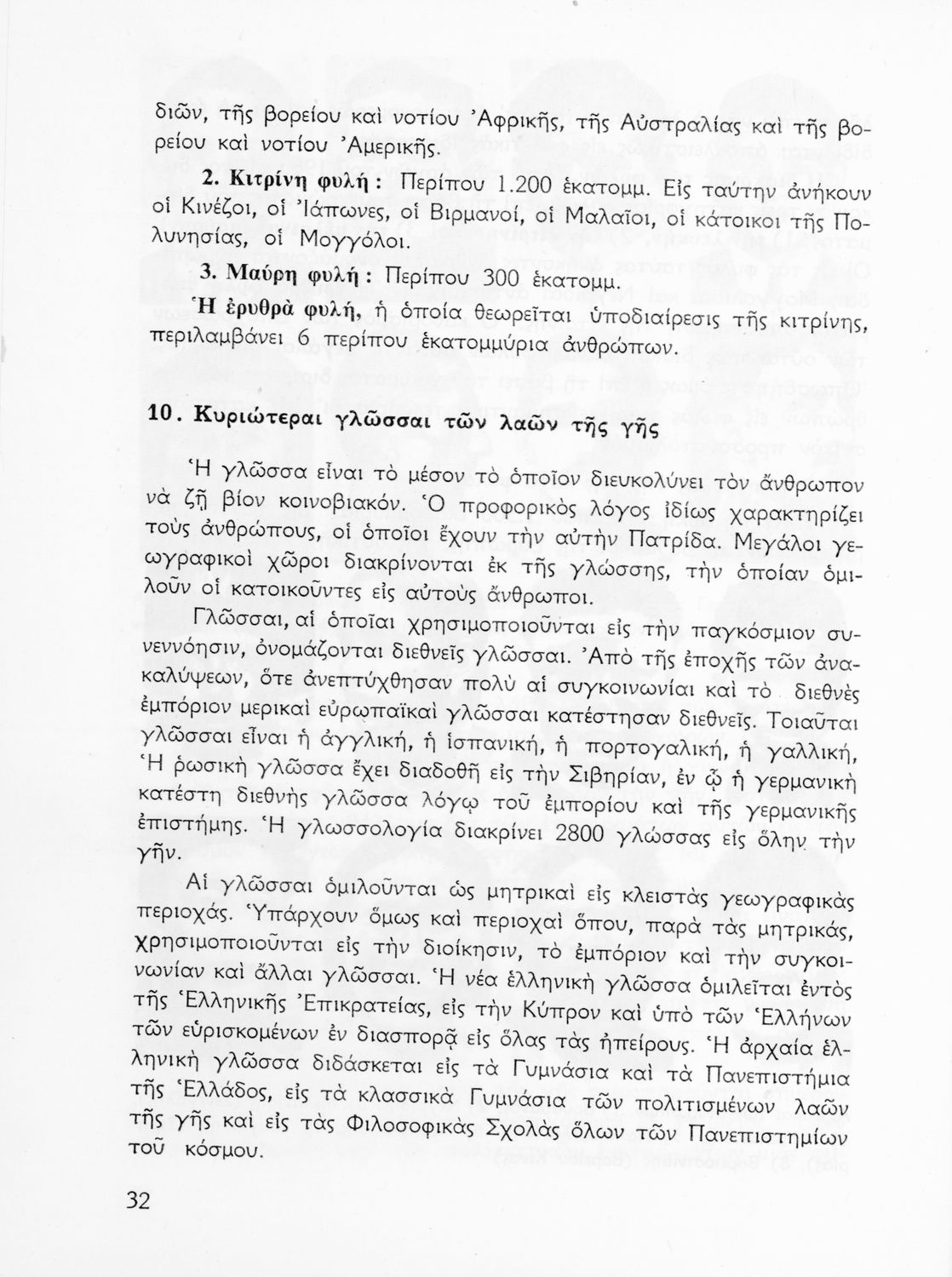 Σχολικό εγχειρίδιο Γεωγραφίας Ε' Γυμνασίου που περιλαμβάνει εισαγωγή στην ανθρωπογεωγραφία και εστιάζει στην οικονομική παραγωγή της Ελλάδας και τη σχέση της με την ΕΟΚ. Περιέχει ειδική αναφορά στα "οικονομικά και κοινωνικά επιτεύγματα της Εθνικής Κυβερνήσεως". Φέρει το σύμβολο της δικτατορίας.