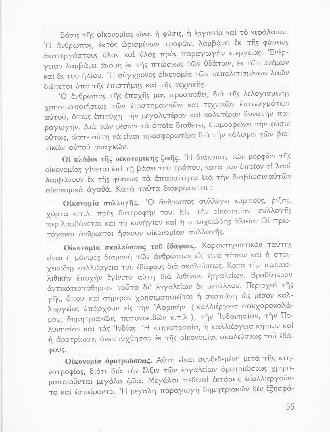 Σχολικό εγχειρίδιο Γεωγραφίας Ε' Γυμνασίου που περιλαμβάνει εισαγωγή στην ανθρωπογεωγραφία και εστιάζει στην οικονομική παραγωγή της Ελλάδας και τη σχέση της με την ΕΟΚ. Περιέχει ειδική αναφορά στα "οικονομικά και κοινωνικά επιτεύγματα της Εθνικής Κυβερνήσεως". Φέρει το σύμβολο της δικτατορίας.