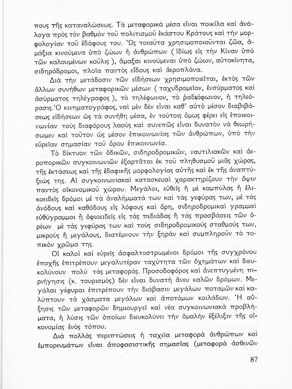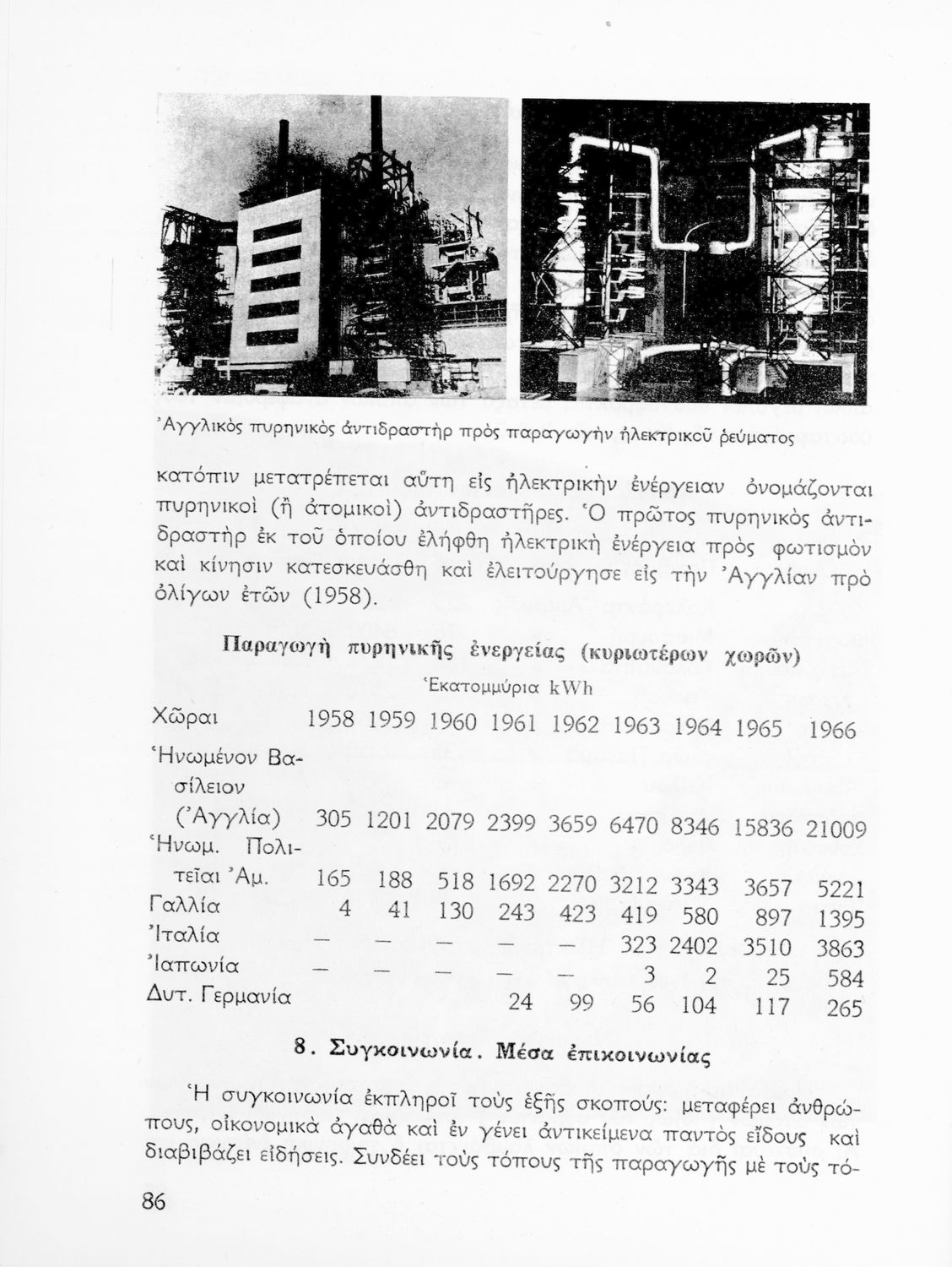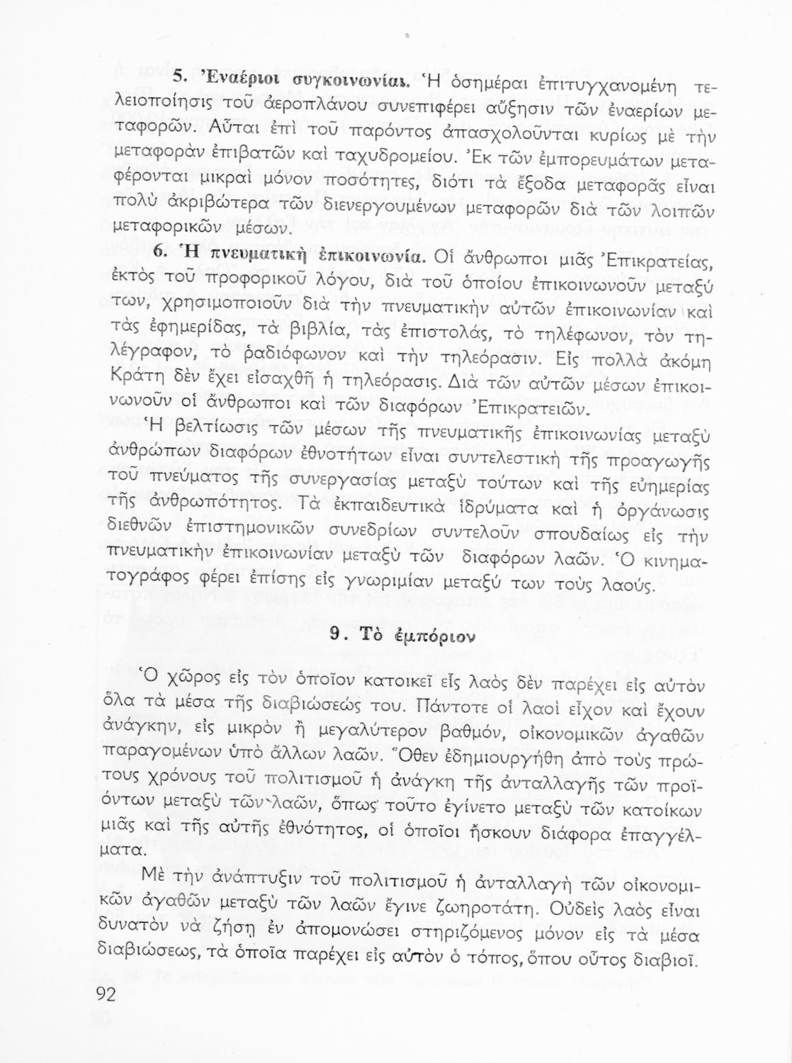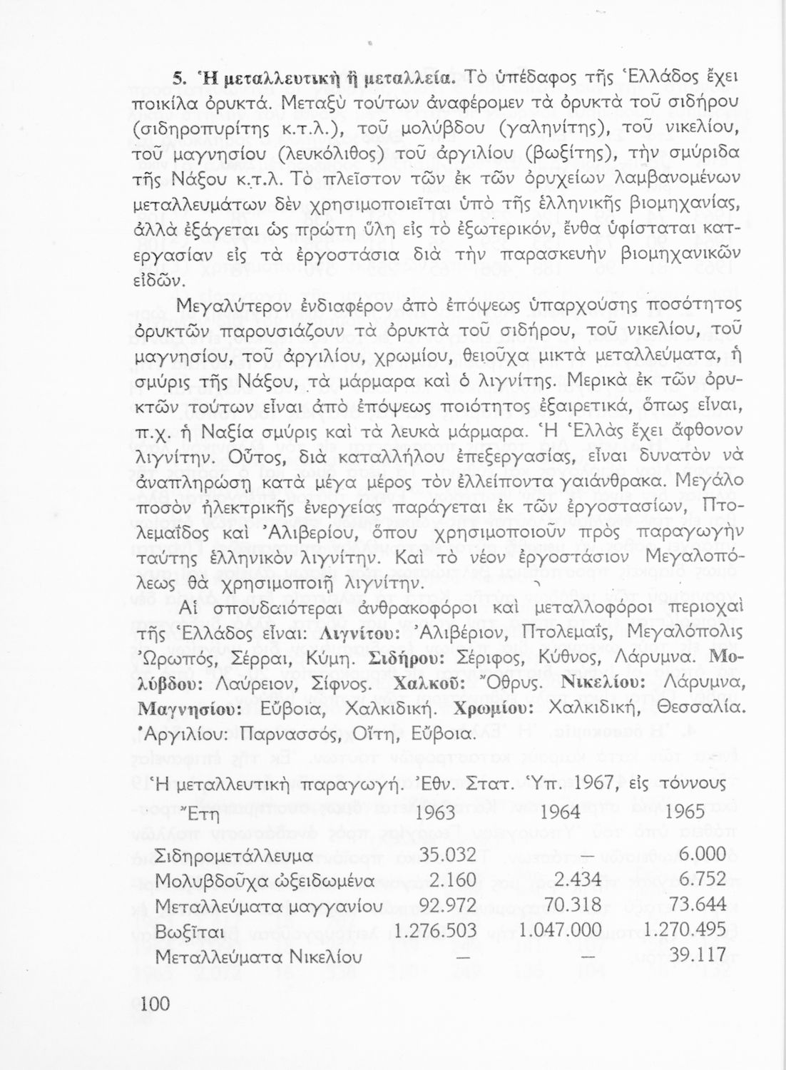 Σχολικό εγχειρίδιο Γεωγραφίας Ε' Γυμνασίου που περιλαμβάνει εισαγωγή στην ανθρωπογεωγραφία και εστιάζει στην οικονομική παραγωγή της Ελλάδας και τη σχέση της με την ΕΟΚ. Περιέχει ειδική αναφορά στα "οικονομικά και κοινωνικά επιτεύγματα της Εθνικής Κυβερνήσεως". Φέρει το σύμβολο της δικτατορίας.