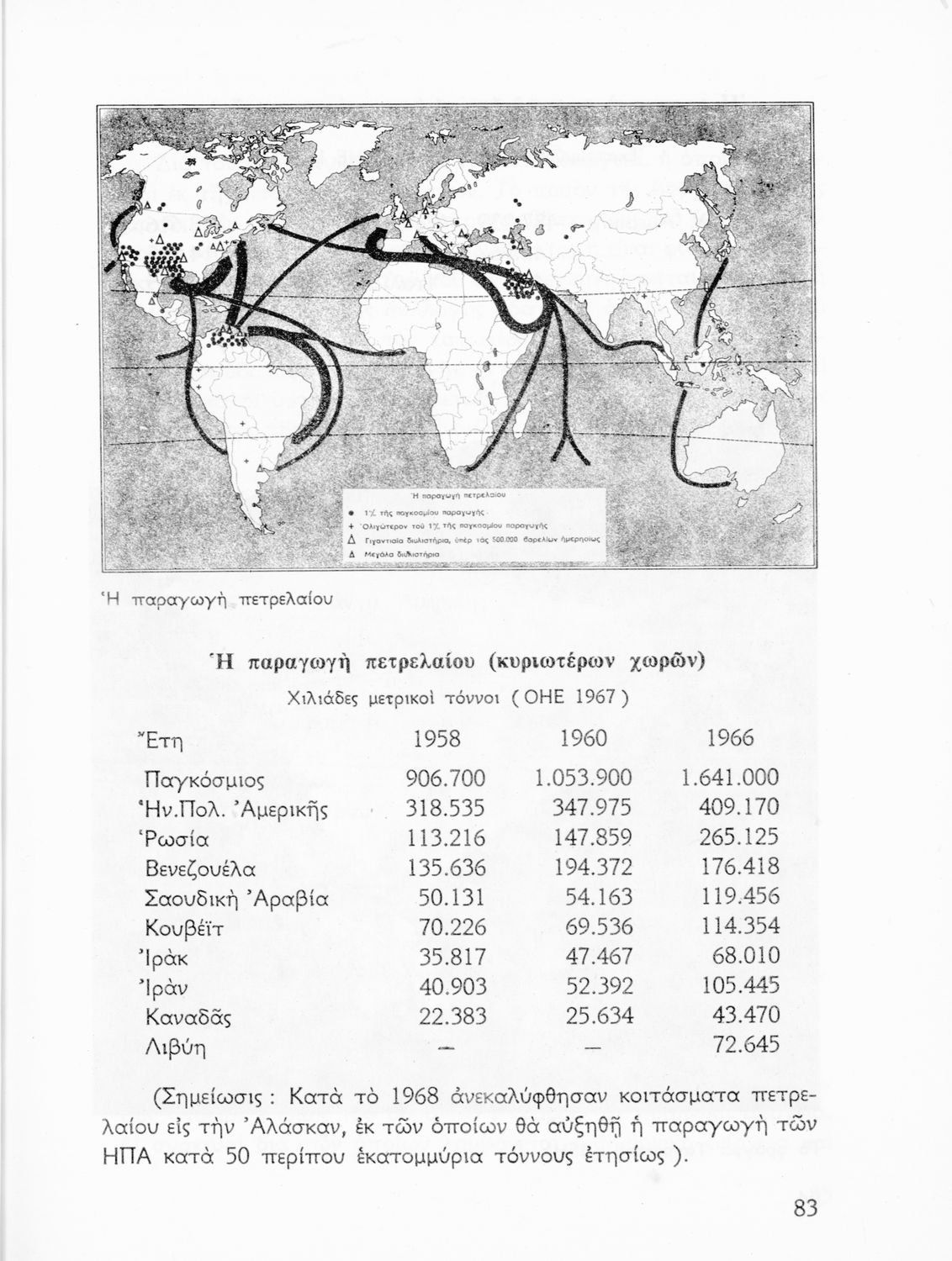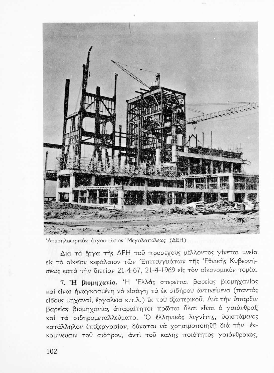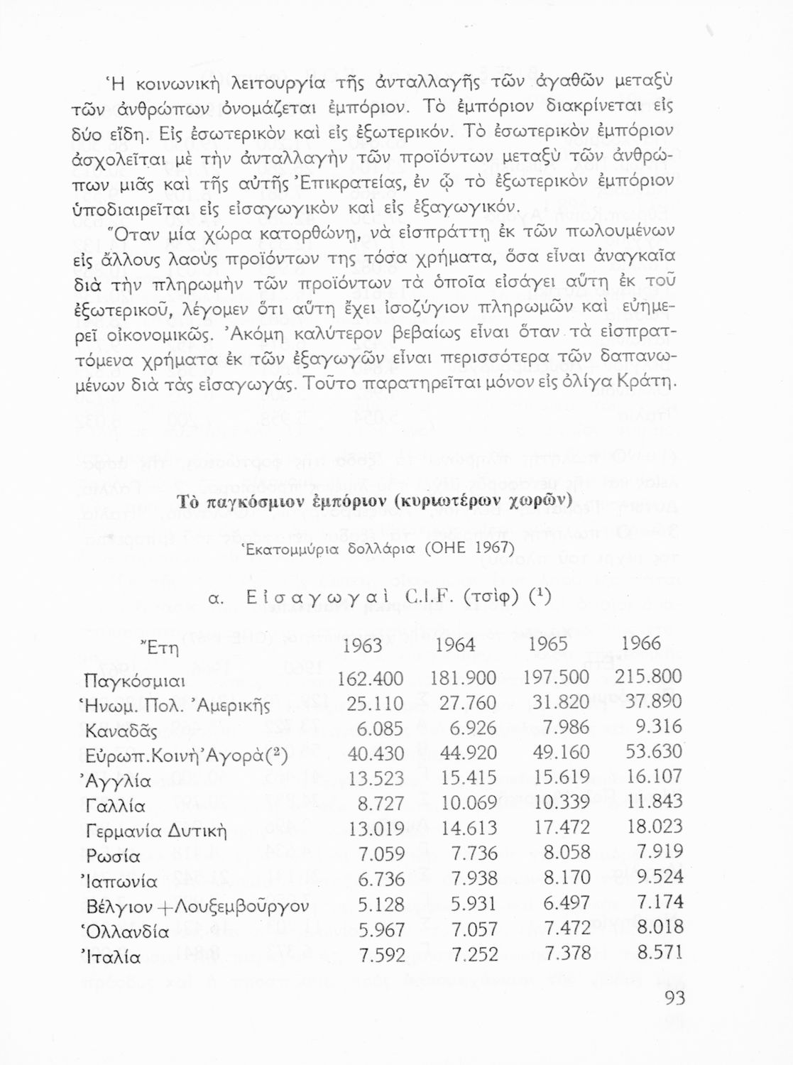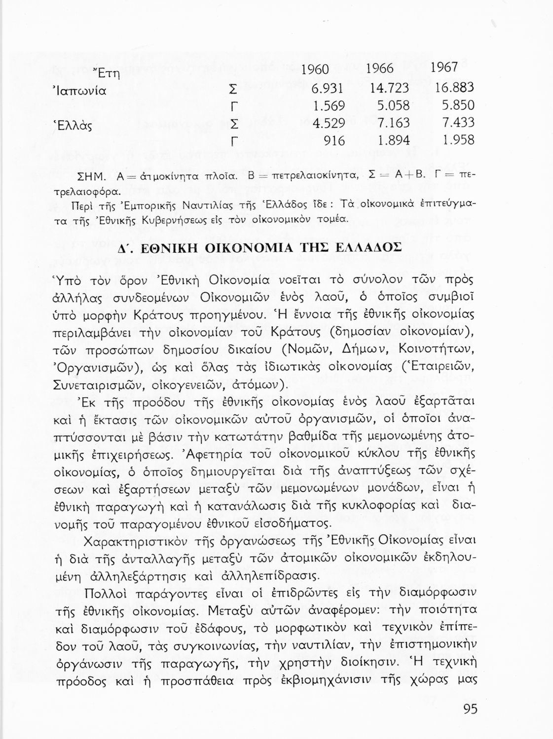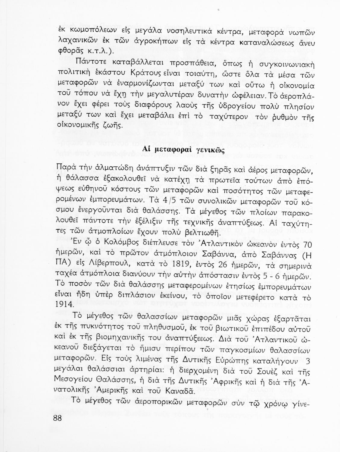 Σχολικό εγχειρίδιο Γεωγραφίας Ε' Γυμνασίου που περιλαμβάνει εισαγωγή στην ανθρωπογεωγραφία και εστιάζει στην οικονομική παραγωγή της Ελλάδας και τη σχέση της με την ΕΟΚ. Περιέχει ειδική αναφορά στα "οικονομικά και κοινωνικά επιτεύγματα της Εθνικής Κυβερνήσεως". Φέρει το σύμβολο της δικτατορίας.