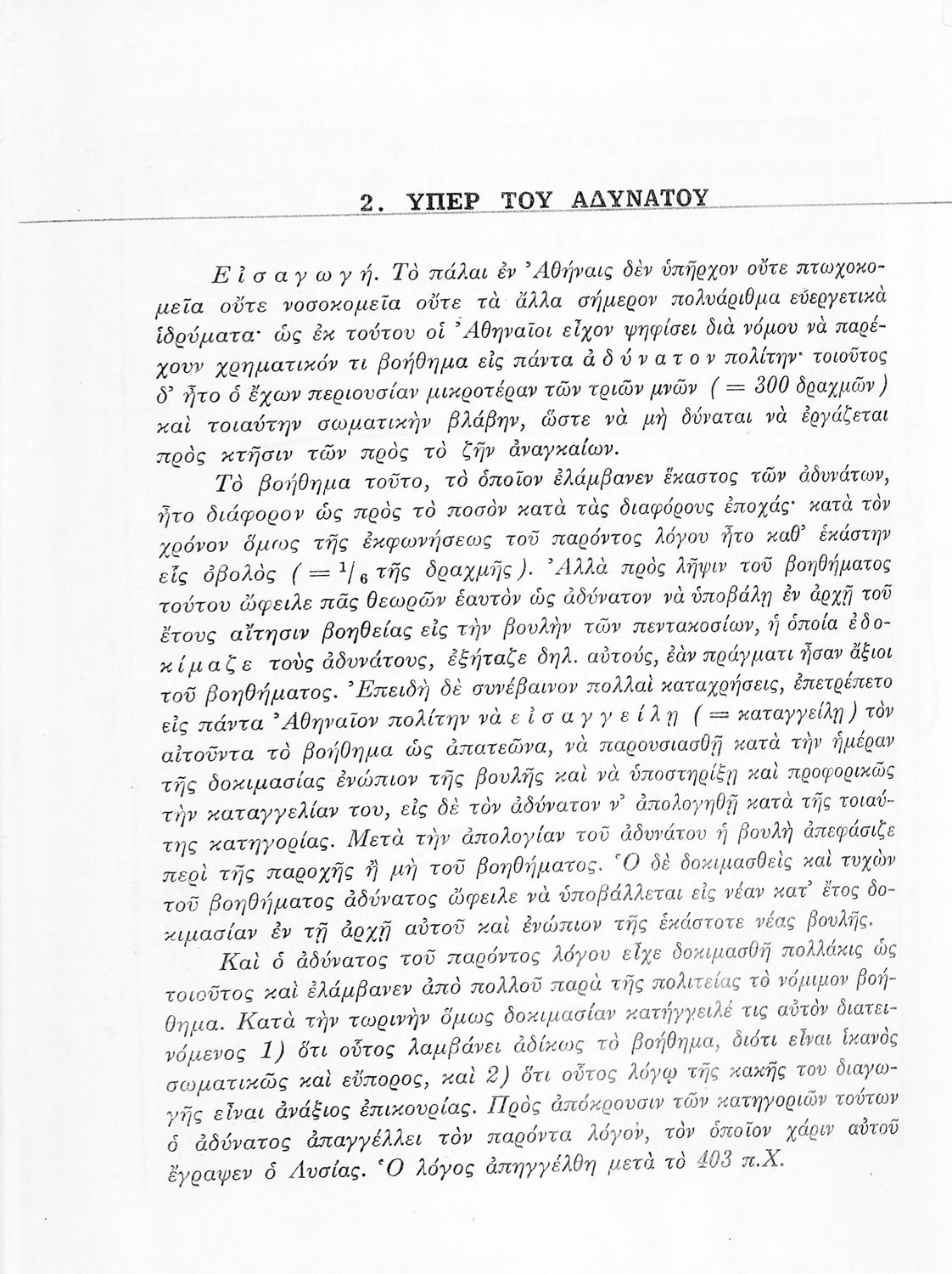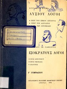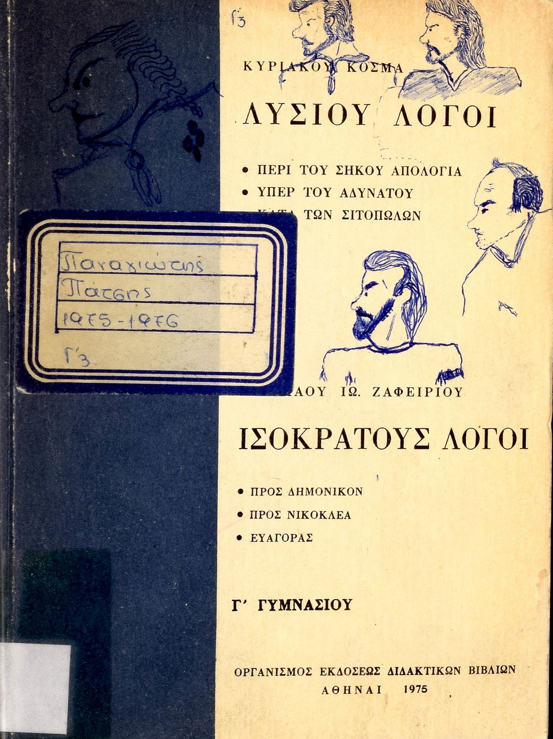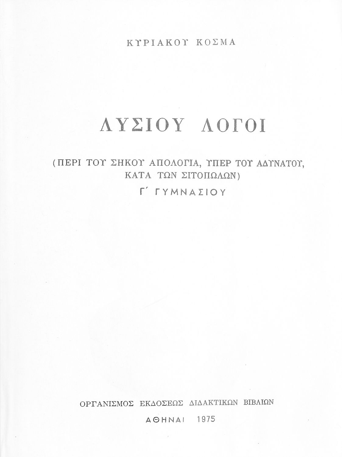 Σχολικό εγχειρίδιο Αρχαίων Ελληνικών Γ΄ Γυμνασίου που περιλαμβάνει τους Λόγους του Λυσία Περί του σηκού απολογία, Υπέρ του αδυνάτου, και Κατά των σιτοπωλών και του Ισοκράτη Προς Δημόνικον, Προς Νικοκλέα και Ευαγόρας, εισαγωγή στους Λόγους και ερμηνευτικά σχόλια.