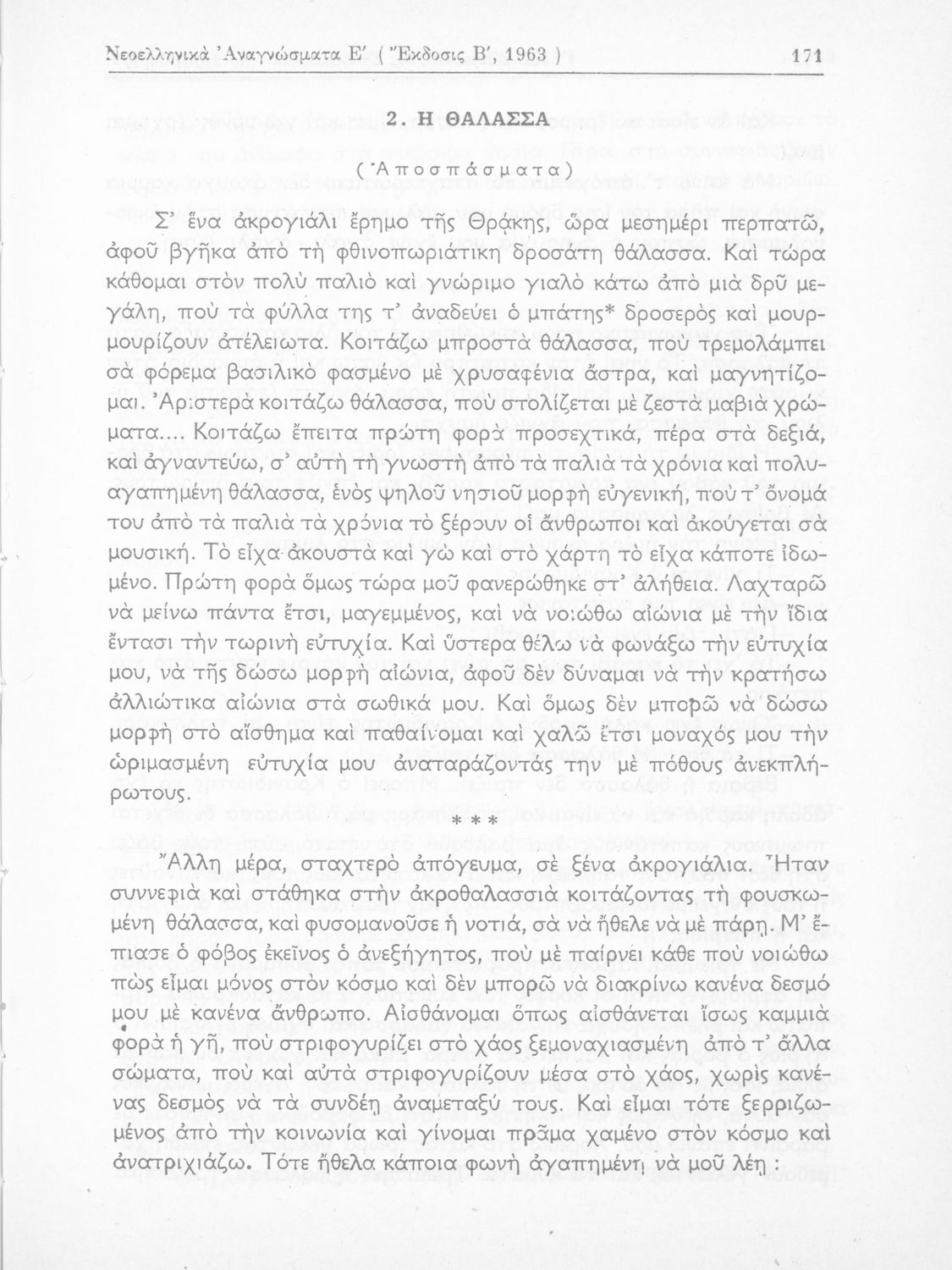 Σχολικό εγχειρίδιο Νέων Ελληνικών Β΄ Εξαταξίου Γυμνασίου που περιλαμβάνει που περιλαμβάνει ποιήματα και πεζά Ελλήνων συγγραφέων εμπνευσμένα από την αρχαία και σύγχρονη ελληνική ιστορία, την ελληνική φύση και ...
