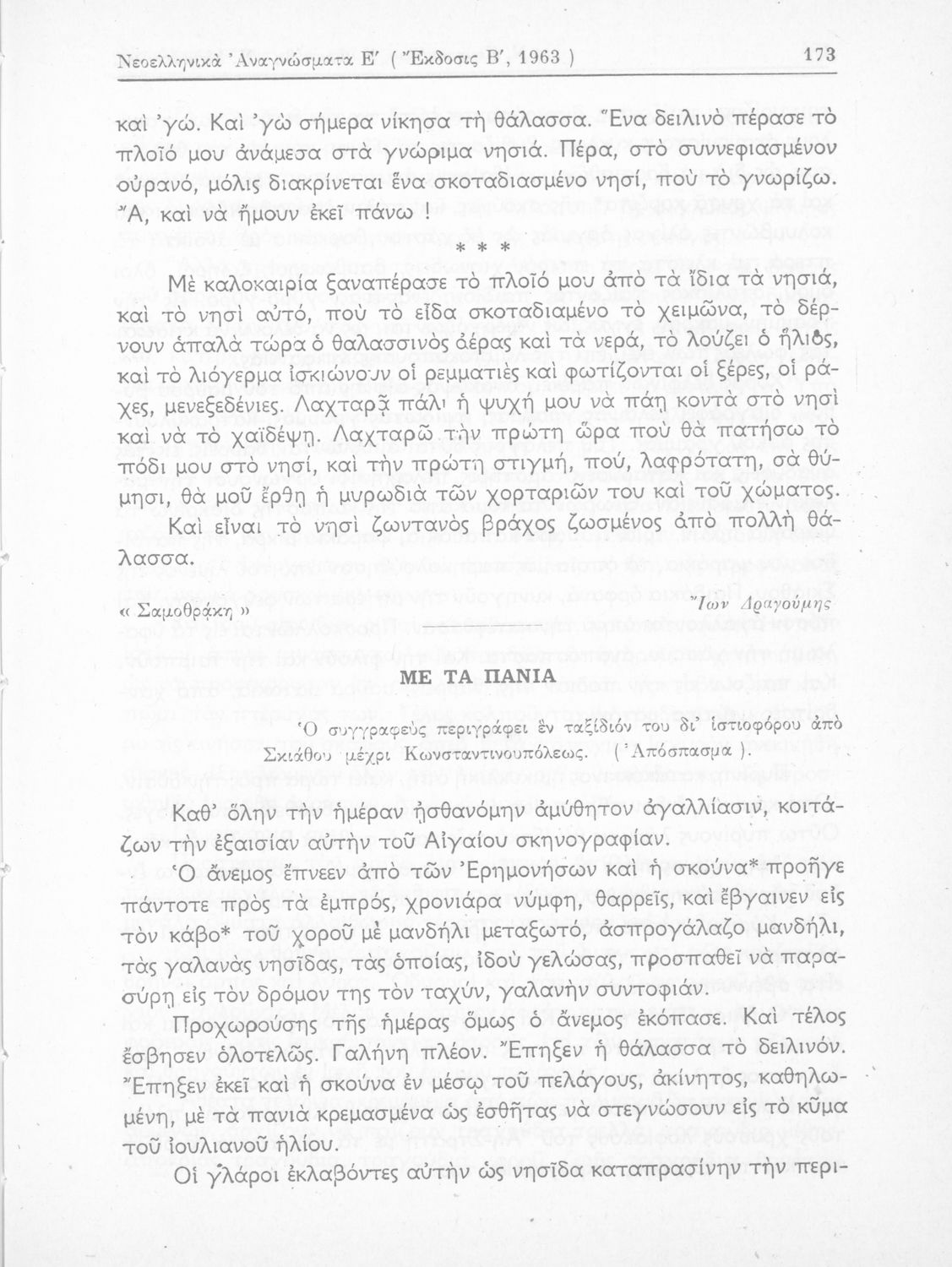Σχολικό εγχειρίδιο Νέων Ελληνικών Ε΄ Γυμνασίου που περιέχει πεζά και ποιήματα Ελλήνων και ξένων συγγραφέων εμπνευσμένα από την αρχαία και σύγχρονη ελληνική ιστορία, τη βυζαντινή ιστορία, τη θρησκευτική παράδοση και την καθημερινή ζωή. Περιέχει παράρτημα με βιογραφίες των συγγραφέων και λεξιλόγιο.