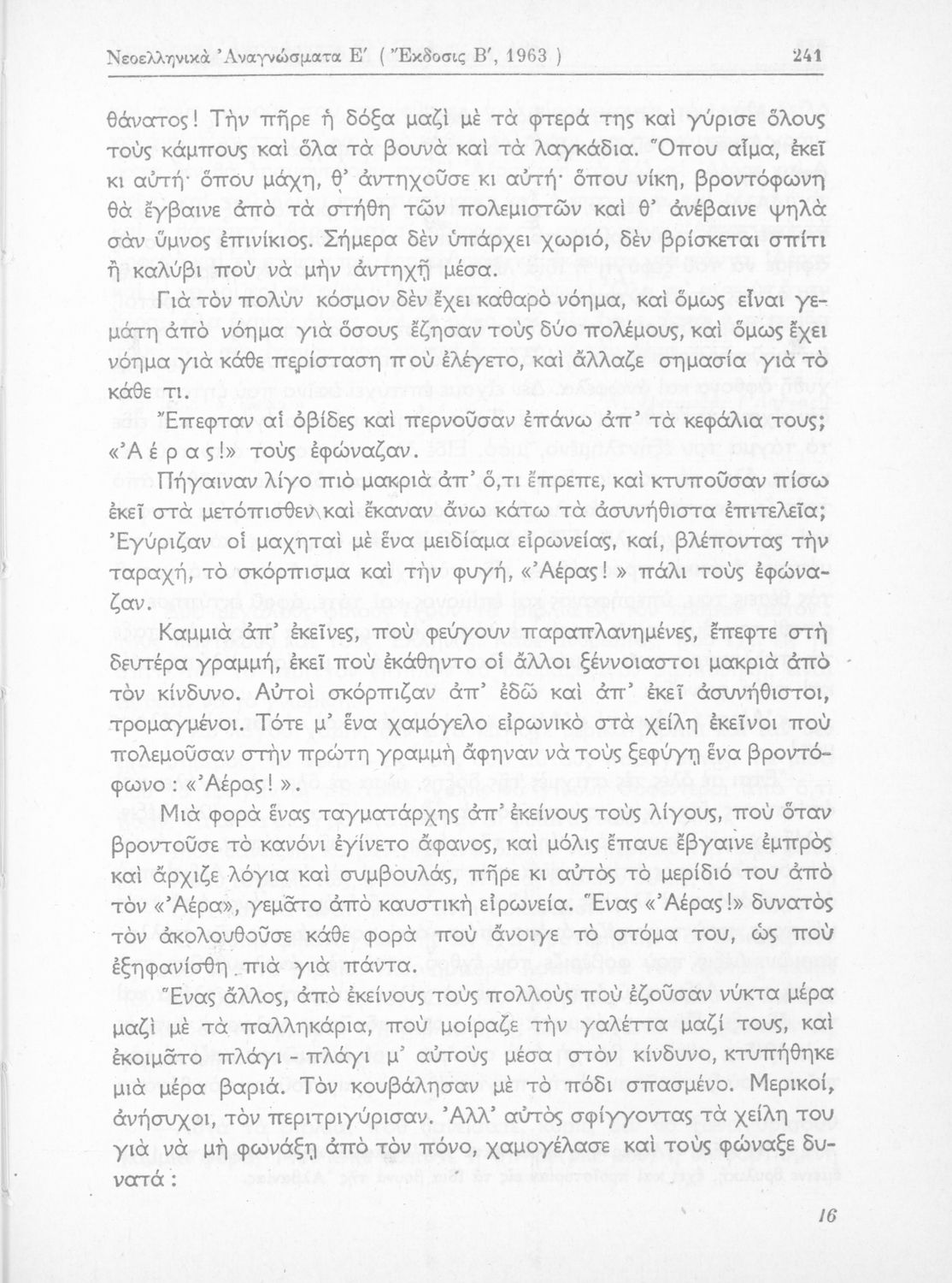 Σχολικό εγχειρίδιο Νέων Ελληνικών Ε΄ Γυμνασίου που περιέχει πεζά και ποιήματα Ελλήνων και ξένων συγγραφέων εμπνευσμένα από την αρχαία και σύγχρονη ελληνική ιστορία, τη βυζαντινή ιστορία, τη θρησκευτική παράδοση και την καθημερινή ζωή. Περιέχει παράρτημα με βιογραφίες των συγγραφέων και λεξιλόγιο.