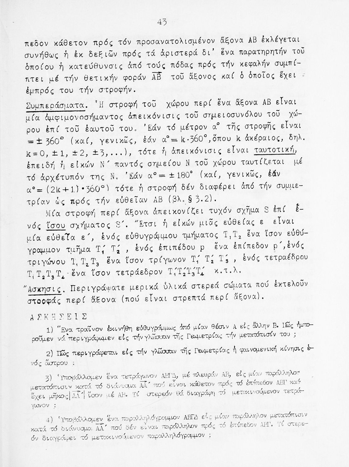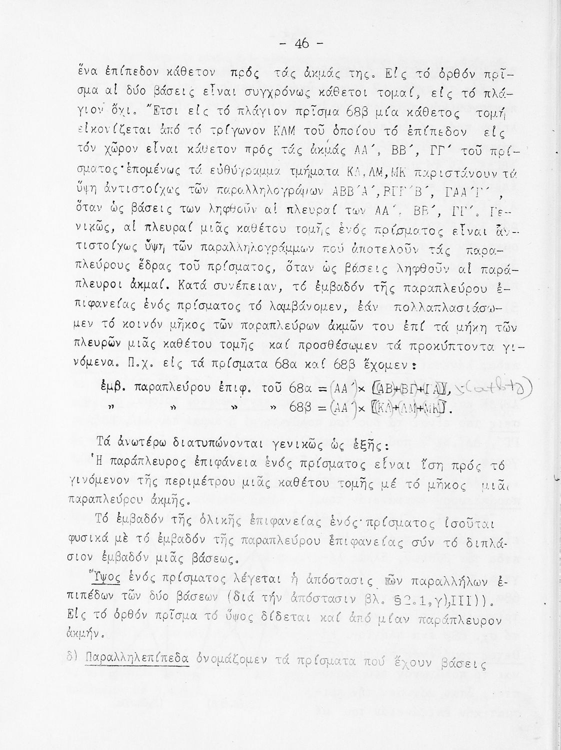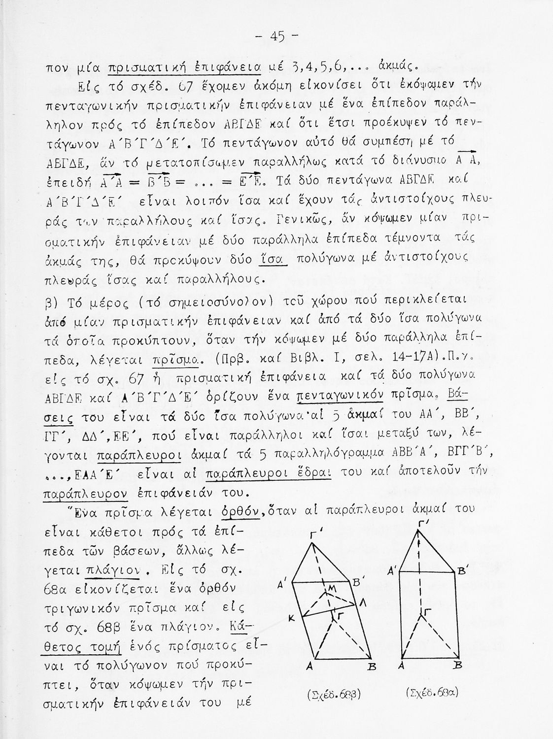 Σχολικό εγχειρίδιο Γεωμετρίας για τις Α΄, Β΄, Γ΄ Γυμνασίου που είναι χωρισμένο σε Επιπεδομετρία και Στερεομετρία και περιλαμβάνει θεωρία και ασκήσεις.
