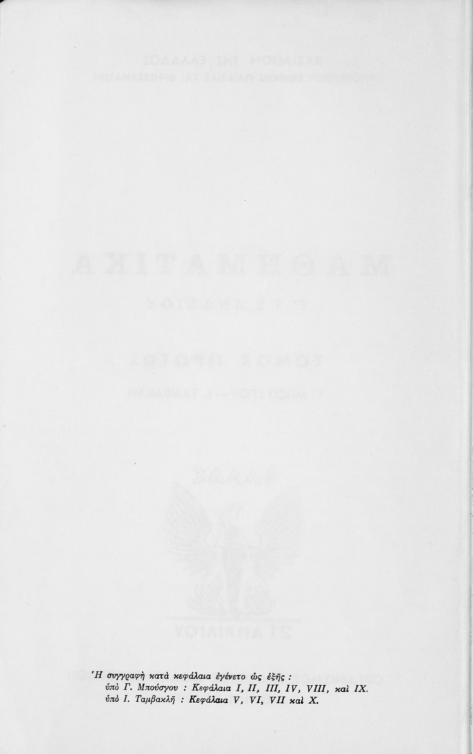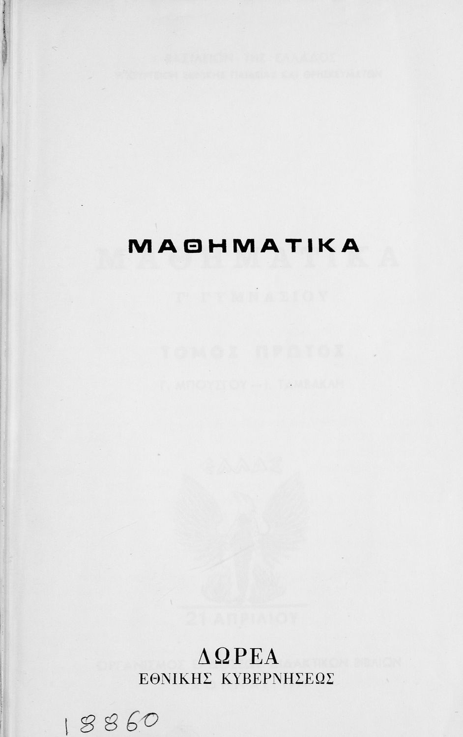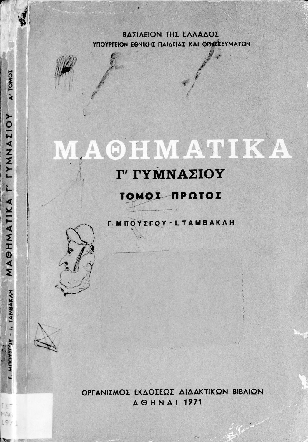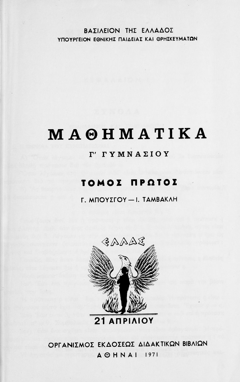 Σχολικό εγχειρίδιο μαθηματικών Γ΄ Γυμνασίου που περιλαμβάνει θεωρία, παραδείγματα και ασκήσεις. Φέρει το σύμβολο της δικτατορίας.
