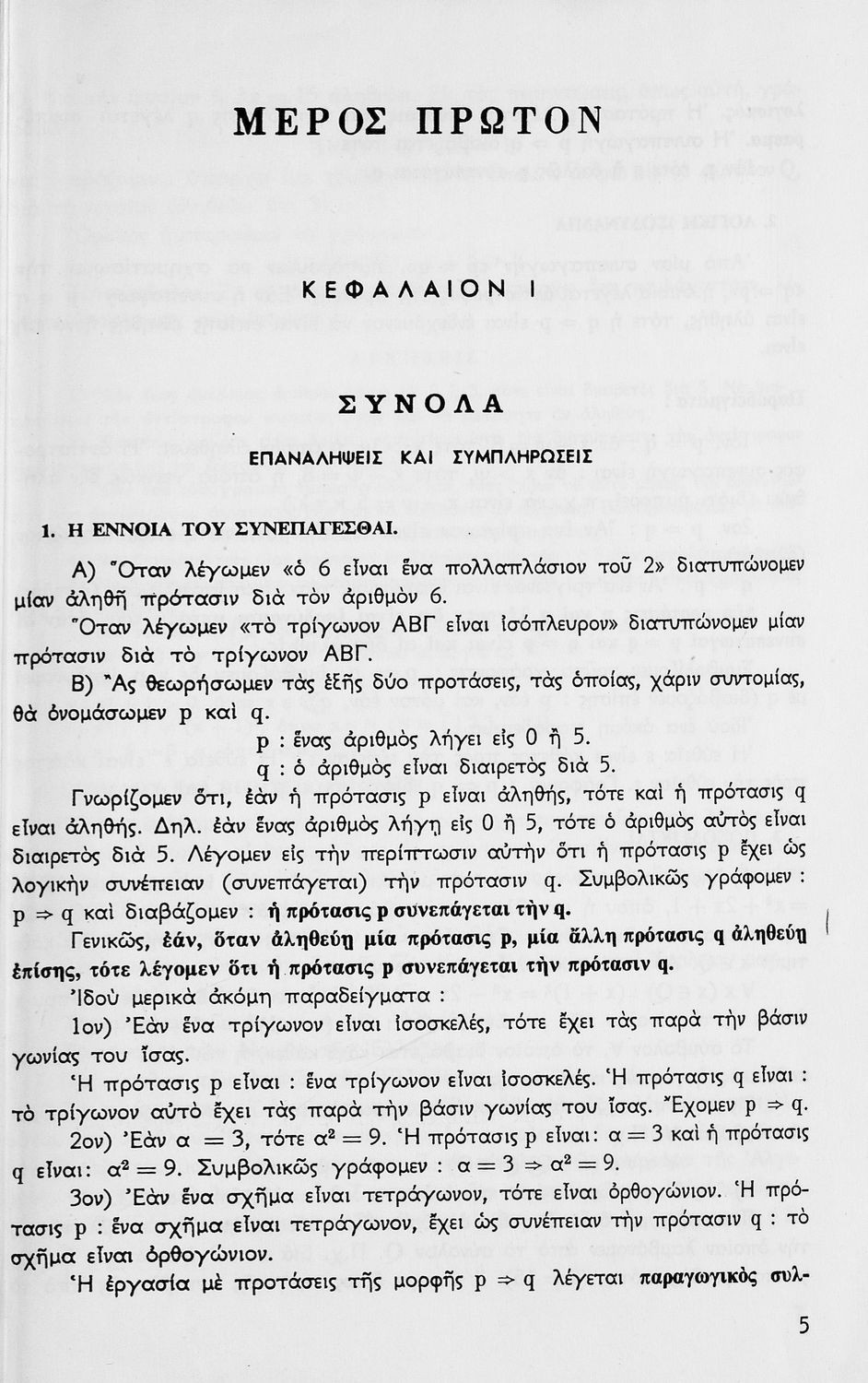 Σχολικό εγχειρίδιο Μαθηματικών για την Ε΄ Γυμνασίου, χωρισμένο σε προβλήματα, εφαρμογές και ασκήσεις, που εστιάζει στην Τριγωνομετρία. Φέρει το σύμβολο της δικτατορίας.