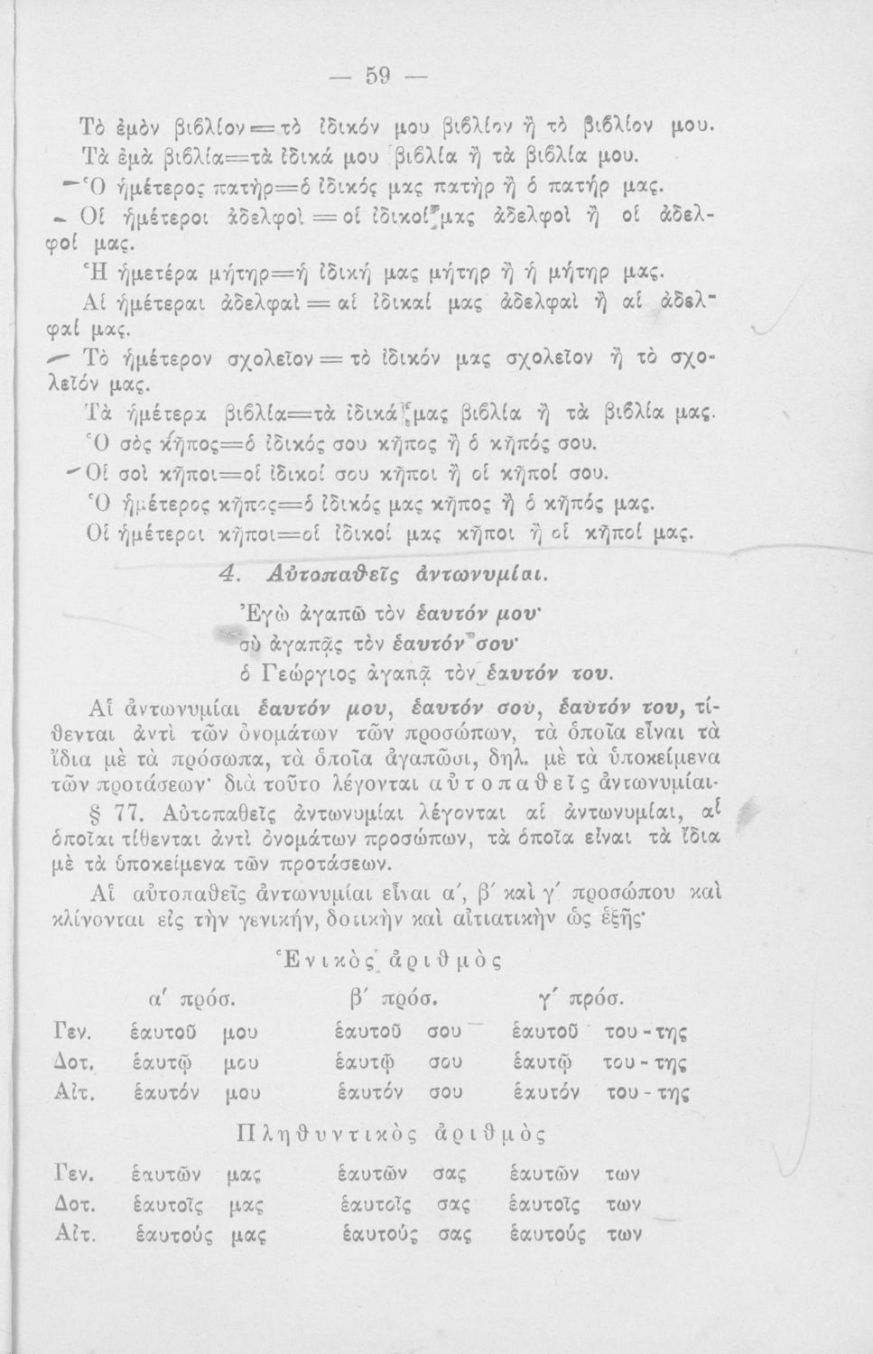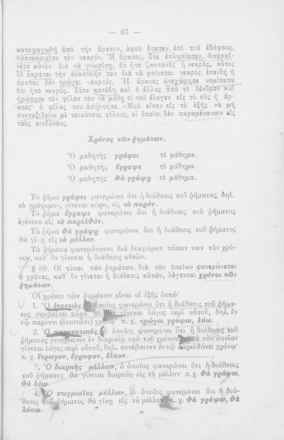 Σχολικό εγχειρίδιο Γ΄ και Δ΄ Δημοτικού που περιέχει τη γραμματικής της νέας ελληνικής. Την έκδοση επιμελήθηκε ο Γ. Λογοθέτης, τέως διευθυντής του επταταξίου δημ. Τμήμ.της Ευαγγελικής Σχολής.