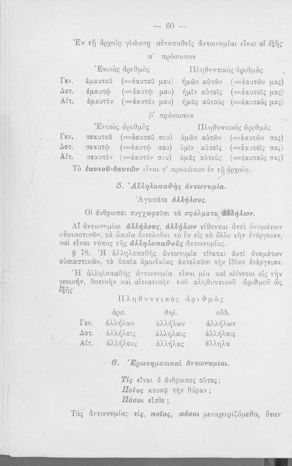 Μαθητικό βοήθημα Αρχαίων Ελληνικών που περιλαμβάνει τη γραμματική της αρχαίας ελληνικής και είναι χωρισμένο σε φθογγολογικό και τυπολογικό μέρος Περιέχει και κατάλογο ανωμάλων ρημάτων, ασκήσεις και σημειώσεις.