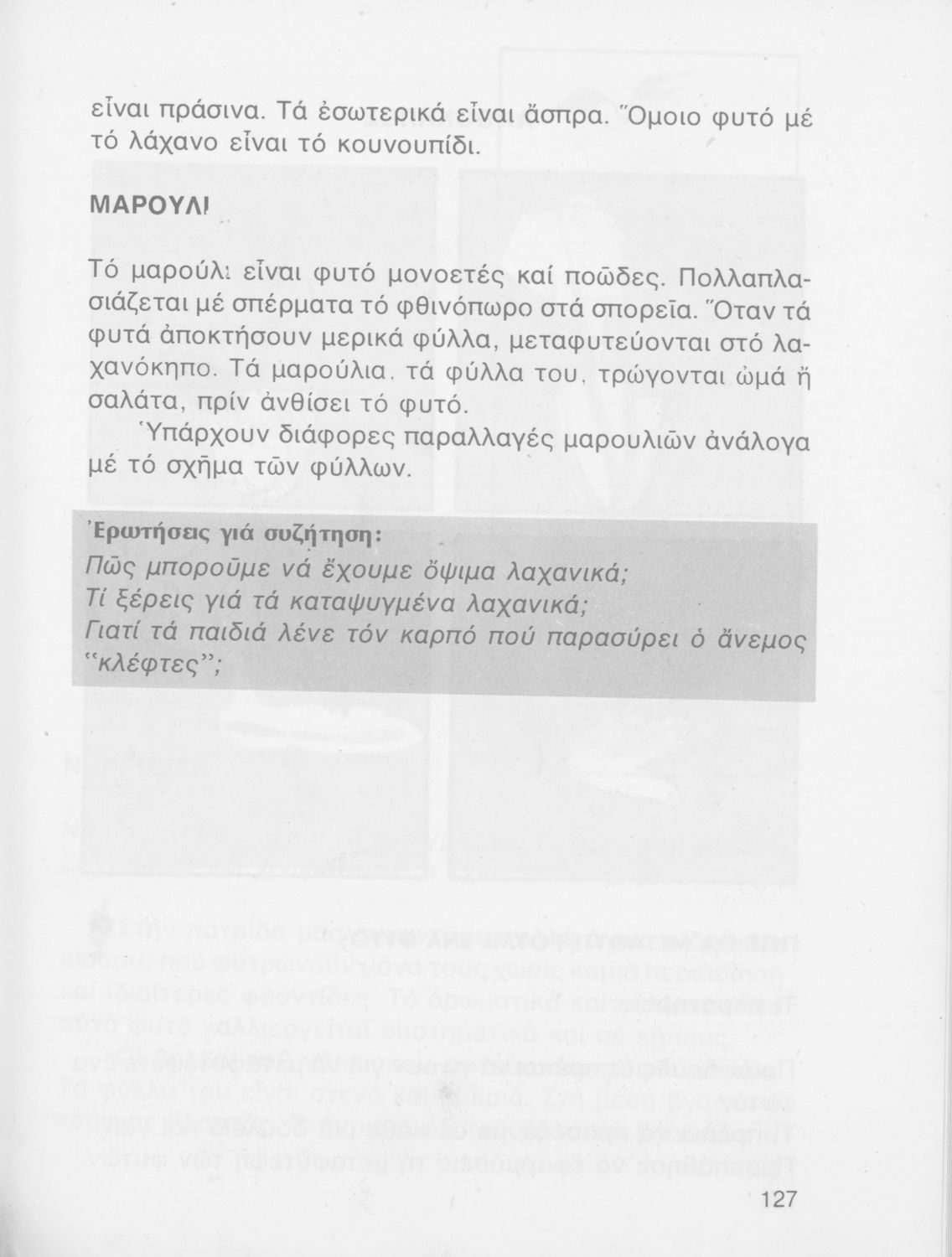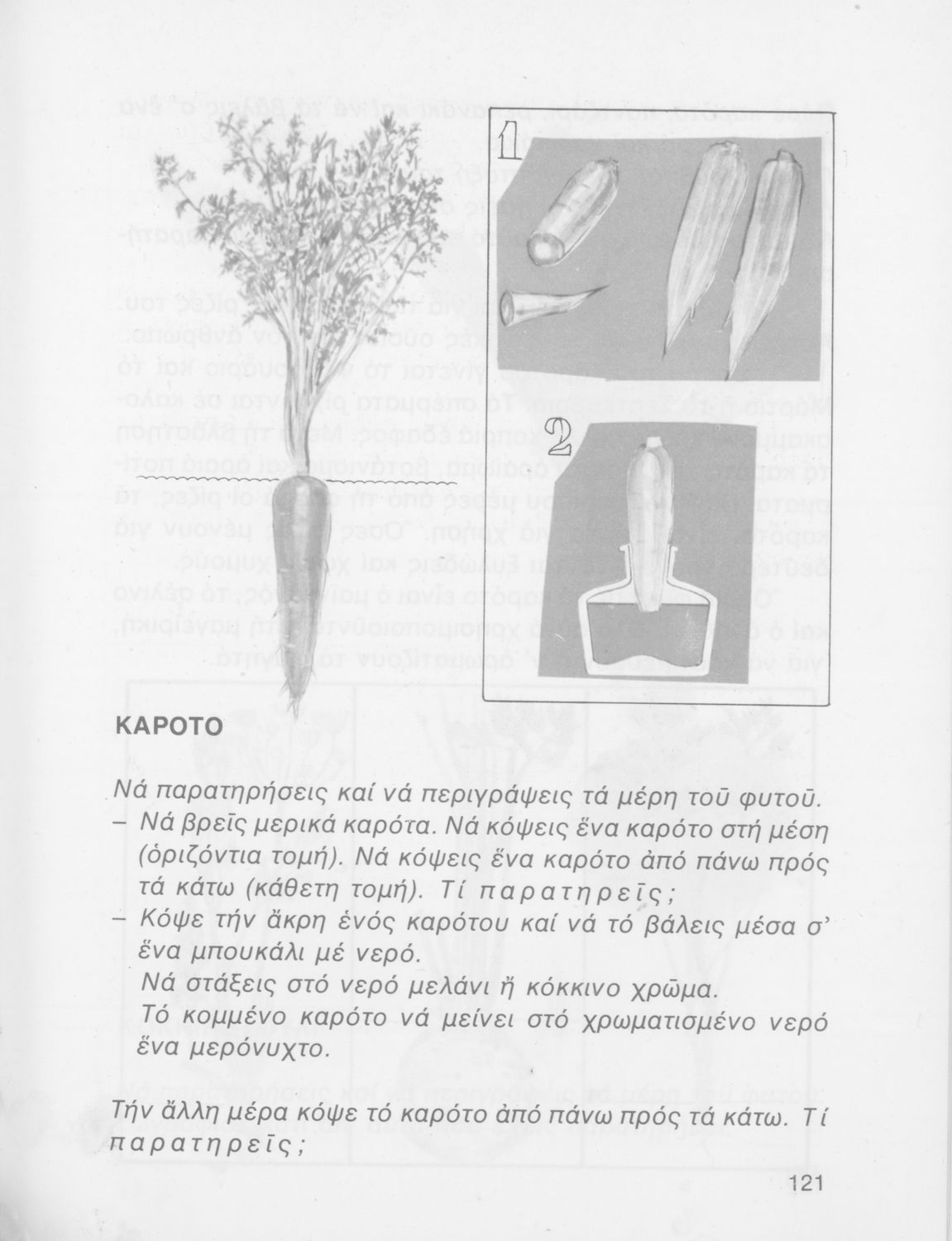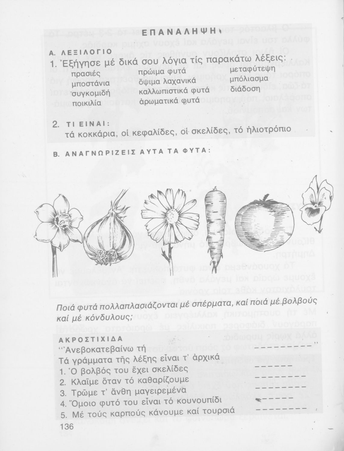 Βαθμίδα εκπαίδευσης: Πρωτοβάθμια Τάξη: Γ΄ Δημοτικού Γλώσσα: Δημοτική Παρουσίαση περιεχομένου: Πρόκειται για βιβλίο Φυτολογίας και Ζωολογίας για την Γ΄ Δημοτικού. Περιέχει στοιχεία για τα μέρη του φυτού, για φυτά και ζώα που υπάρχουν στον κήπο, τον ανθόκηπο και τον λαχανόκηπο. |