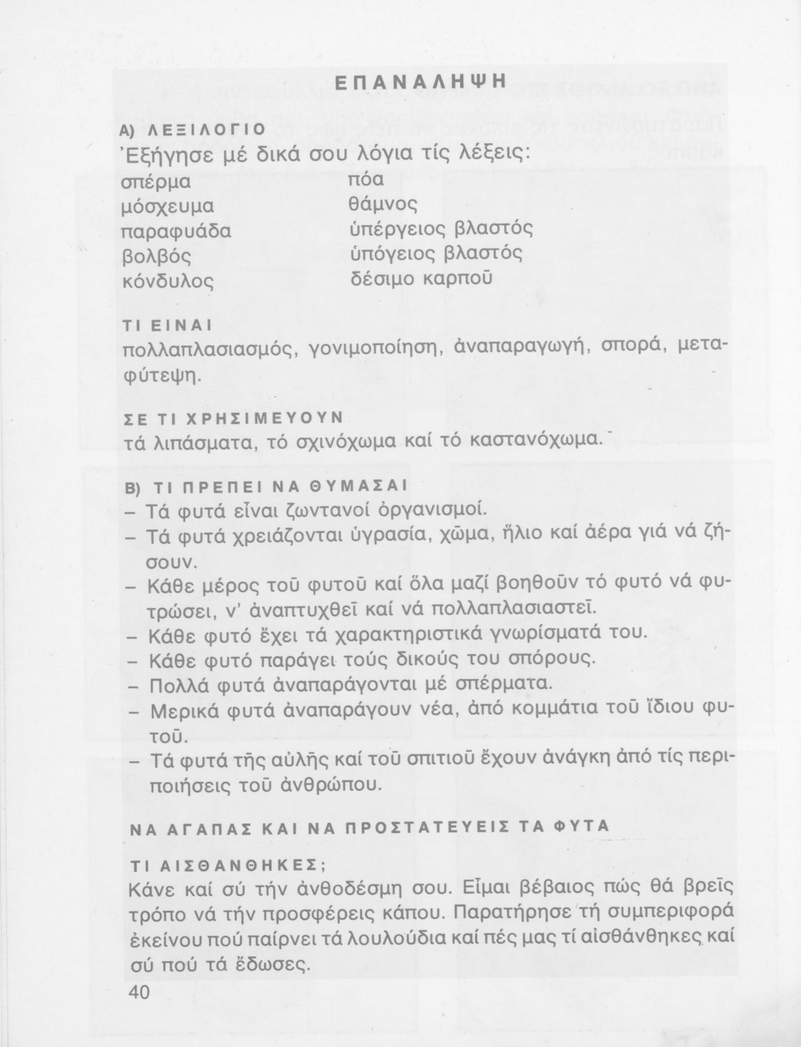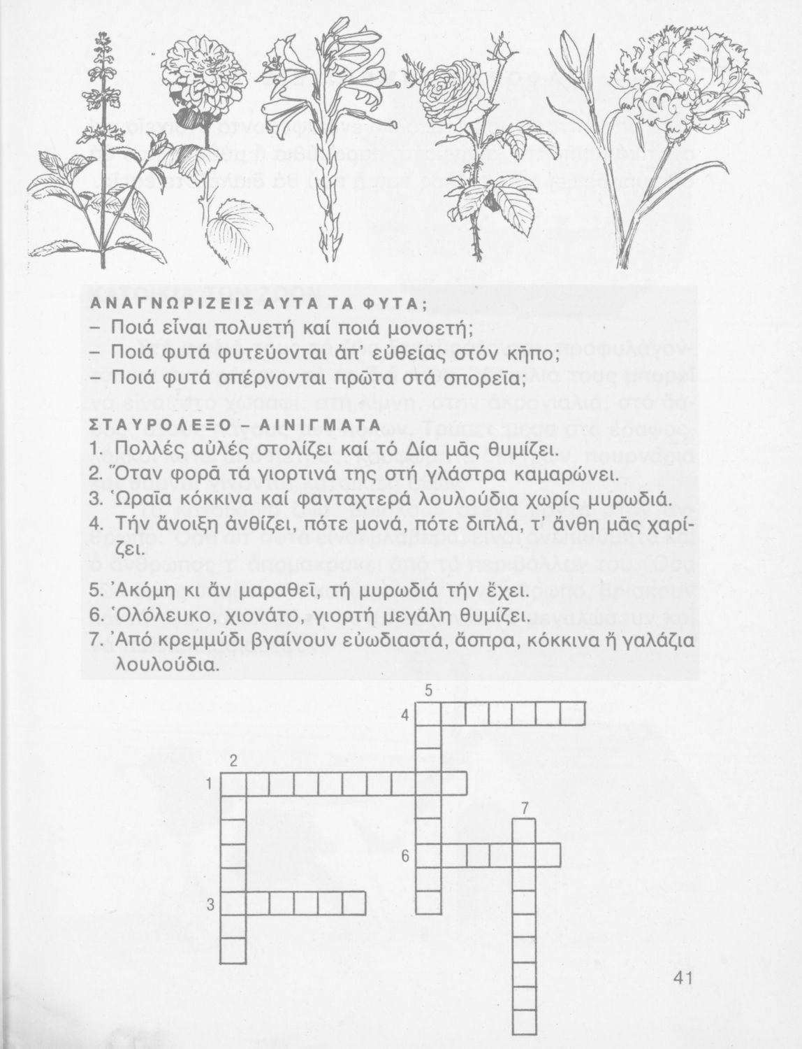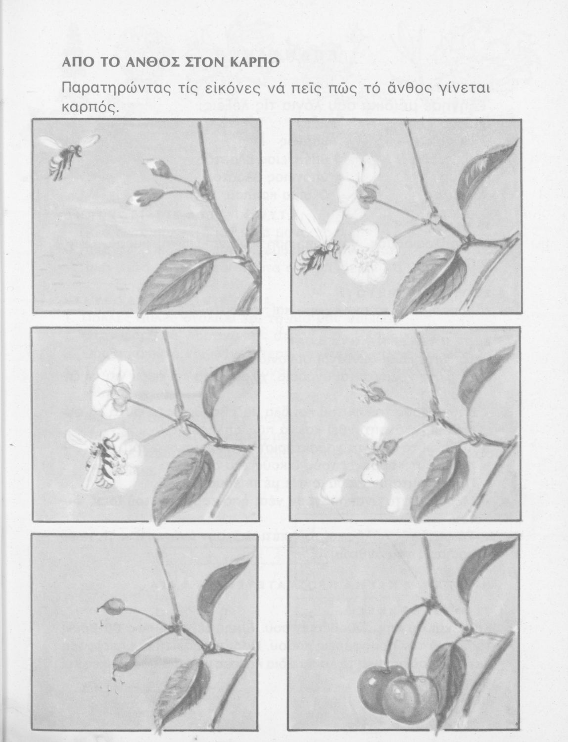 Σχολικό εγχειρίδιο της Γ ΄ Δημοτικού. Στο βιβλίο παρουσιάζονται τα διαφορετικά μέρη των φυτών και τις ιδιότητες του καθενός. Μέσα από παραδείγματα περιγράφεται ο τρόπος γονιμοποίησης και αποθήκευσης τροφής των