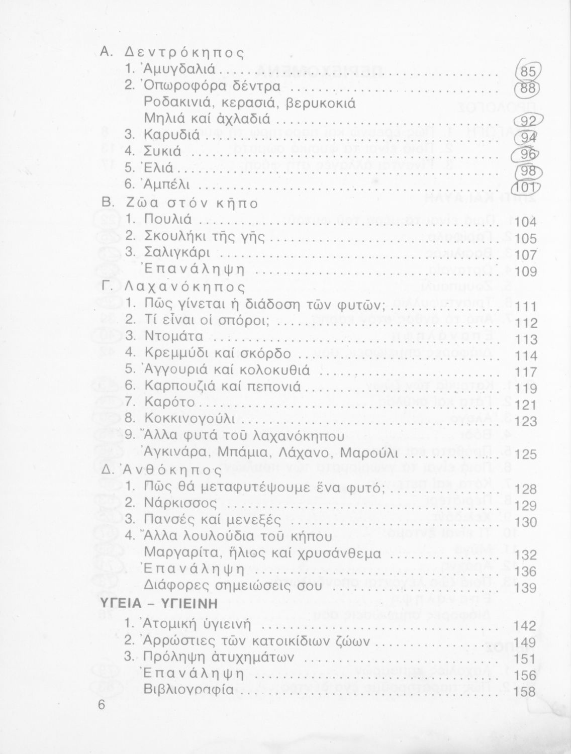 Βαθμίδα εκπαίδευσης: Πρωτοβάθμια Τάξη: Γ΄ Δημοτικού Γλώσσα: Δημοτική Παρουσίαση περιεχομένου: Πρόκειται για βιβλίο Φυτολογίας και Ζωολογίας για την Γ΄ Δημοτικού. Περιέχει στοιχεία για τα μέρη του φυτού, για φυτά και ζώα που υπάρχουν στον κήπο, τον ανθόκηπο και τον λαχανόκηπο. |