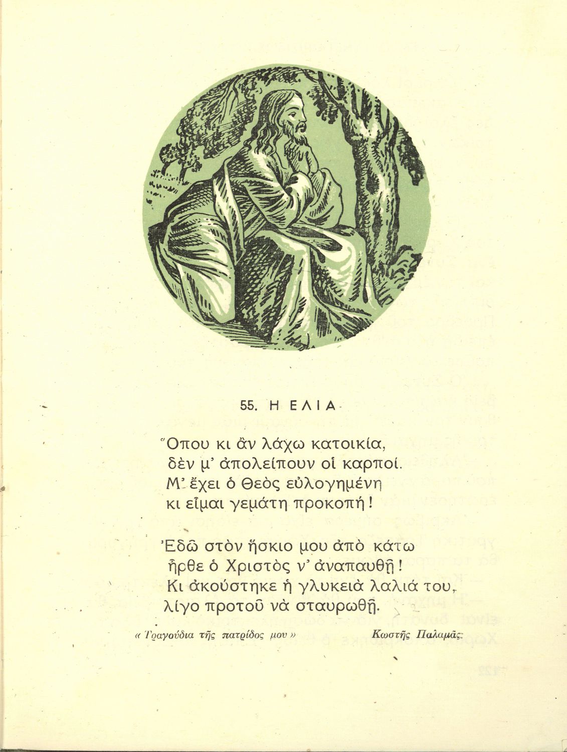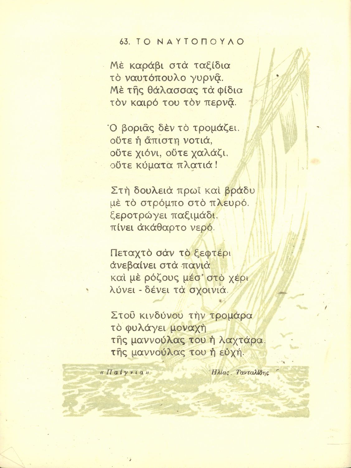 Αναγνωστικό Γ΄ Δημοτικού που περιλαμβάνει ποιήματα και πεζά εμπνευσμένα από την ελληνική φύση, τις ασχολίες των κατοίκων, την σύγχρονη ελληνική ιστορία, την ελληνική μυθολογία και τις θρησκευτικές γιορτές.