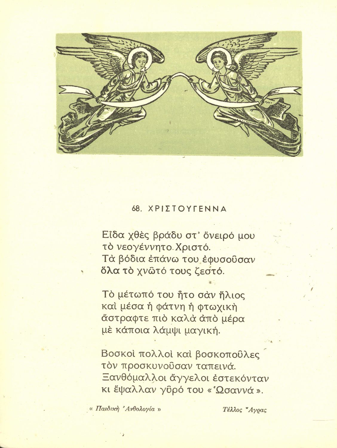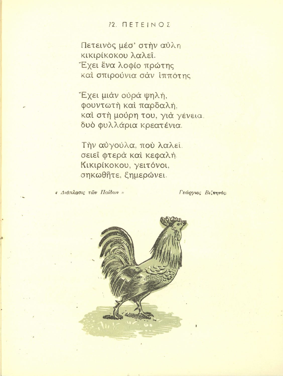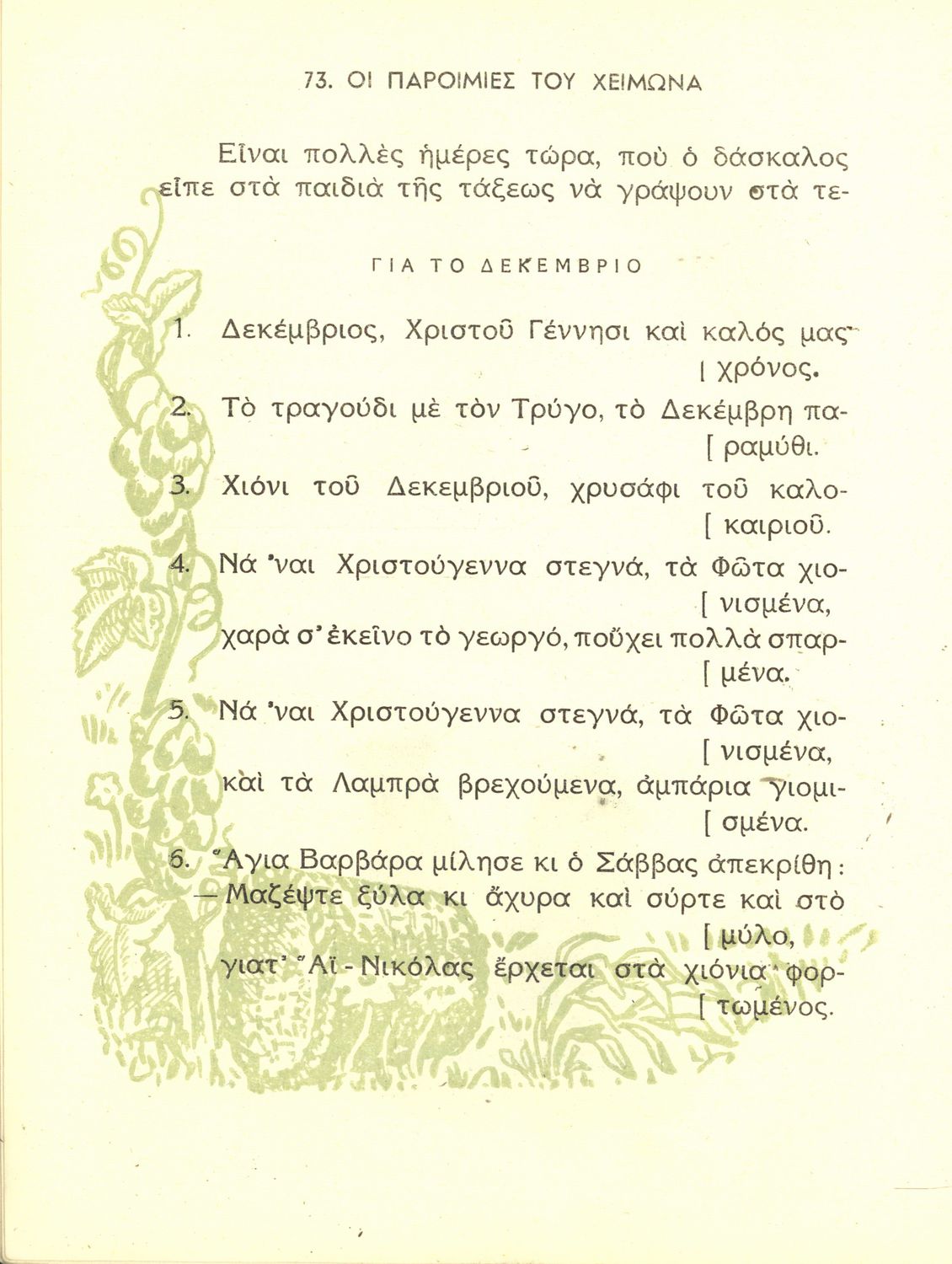 Αναγνωστικό Γ΄ Δημοτικού που περιλαμβάνει ποιήματα και πεζά εμπνευσμένα από την ελληνική φύση, τις ασχολίες των κατοίκων, την σύγχρονη ελληνική ιστορία, την ελληνική μυθολογία και τις θρησκευτικές γιορτές.