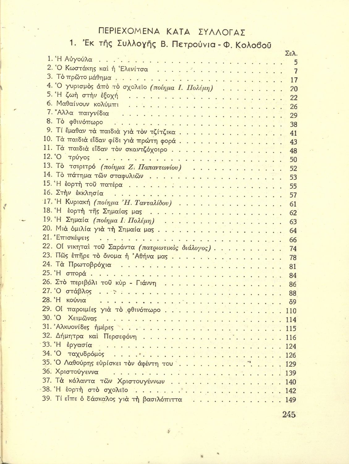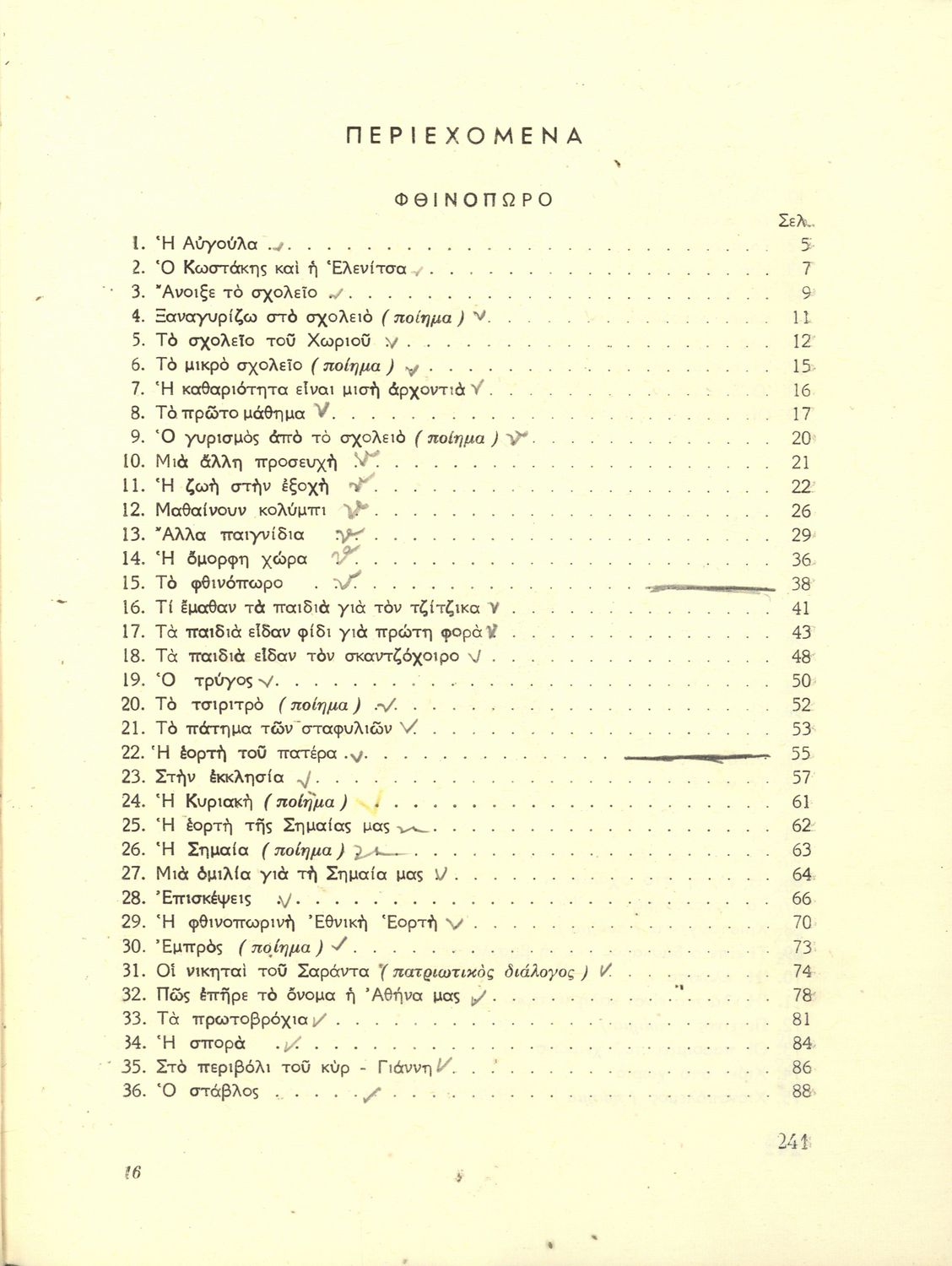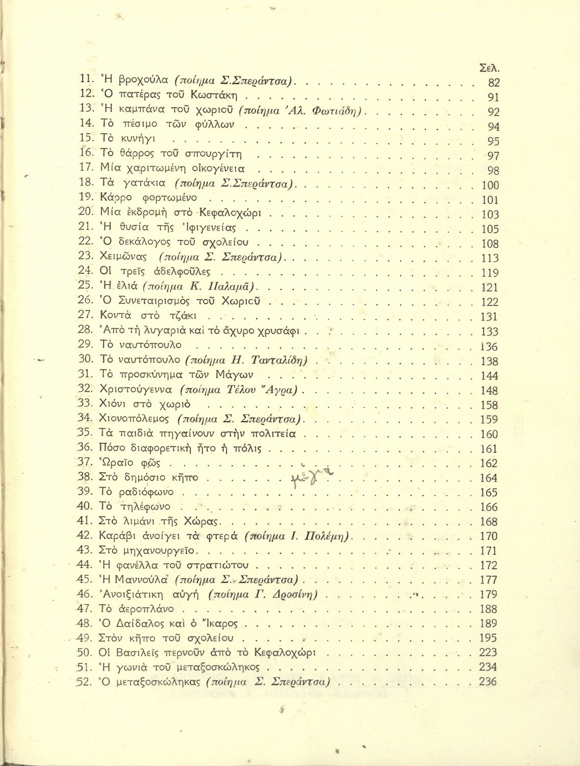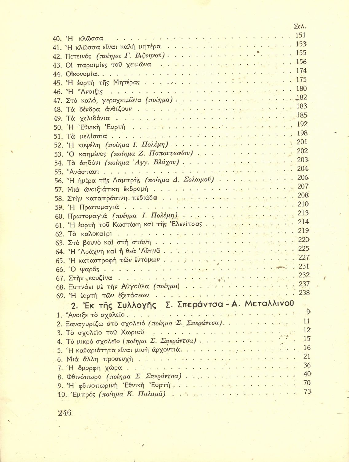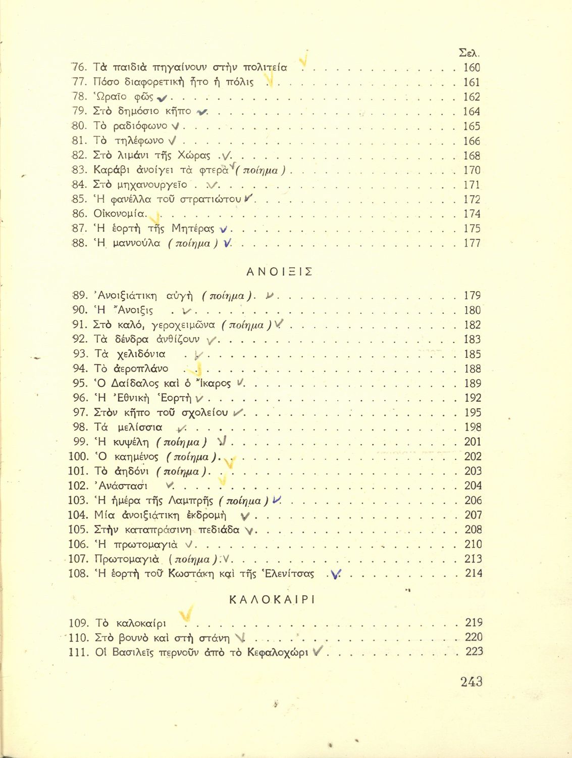 Αναγνωστικό Γ΄ Δημοτικού που περιλαμβάνει ποιήματα και πεζά εμπνευσμένα από την ελληνική φύση, τις ασχολίες των κατοίκων, την σύγχρονη ελληνική ιστορία, την ελληνική μυθολογία και τις θρησκευτικές γιορτές.