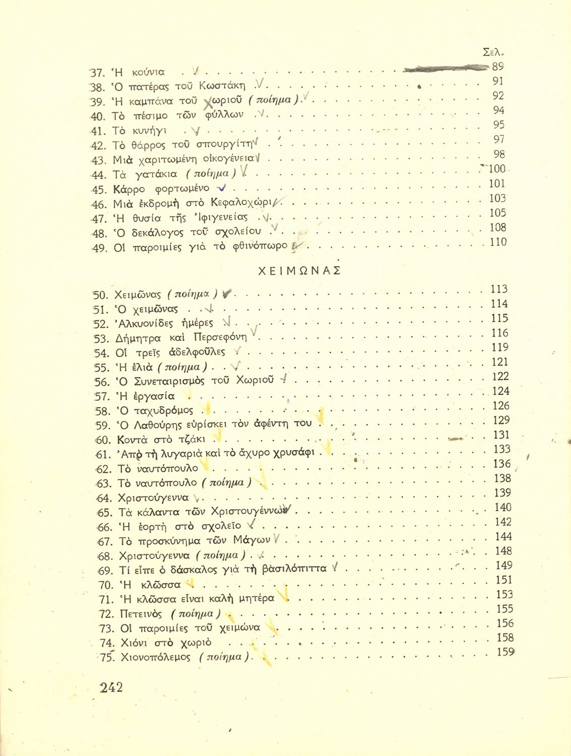 Αναγνωστικό Γ' Δημοτικού που είναι χωρισμένο σύμφωνα με τις εποχές του χρόνου και περιλαμβάνει ποιήματα και πεζά εμπνευσμένα από τη ζωή στην ύπαιθρο, την εθνική, οικογενειακή και κοινωνική ζωή, τη θρησκευτική παράδοση, τις ασχολίες των ανθρώπων, και την ελληνική φύση.