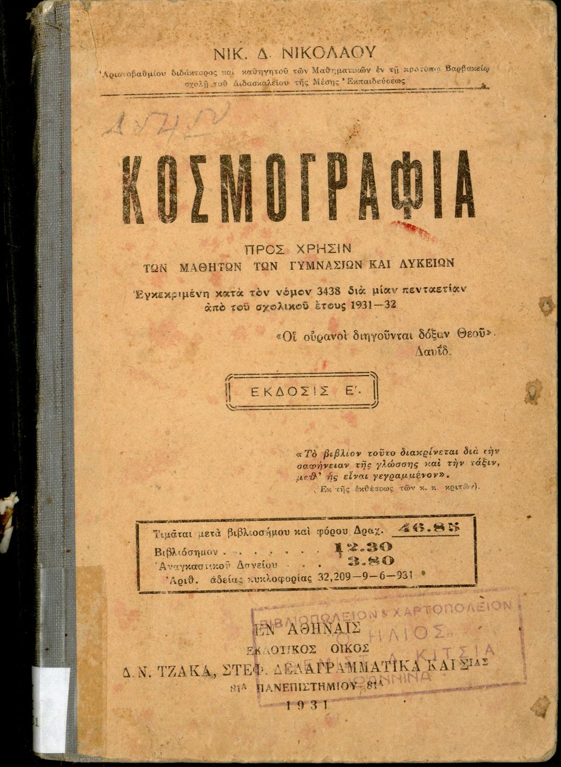 Τίτλος: Κοσμογραφία προς χρήσιν των μαθητών των Γυμνασίων και Λυκείων