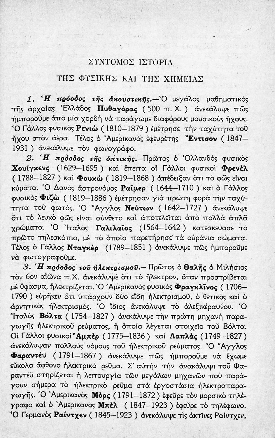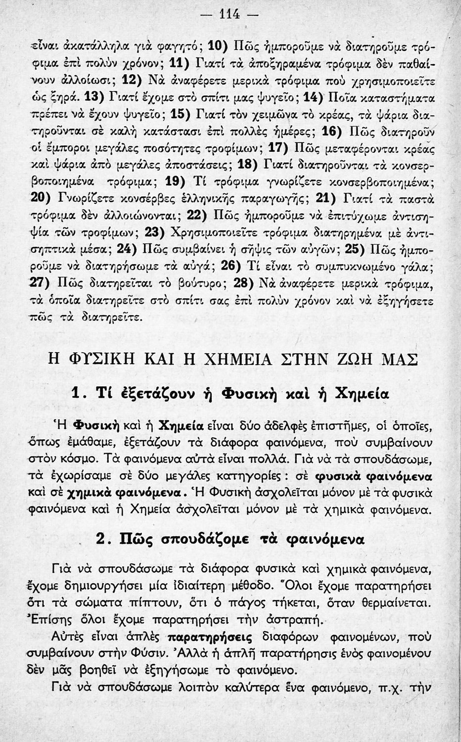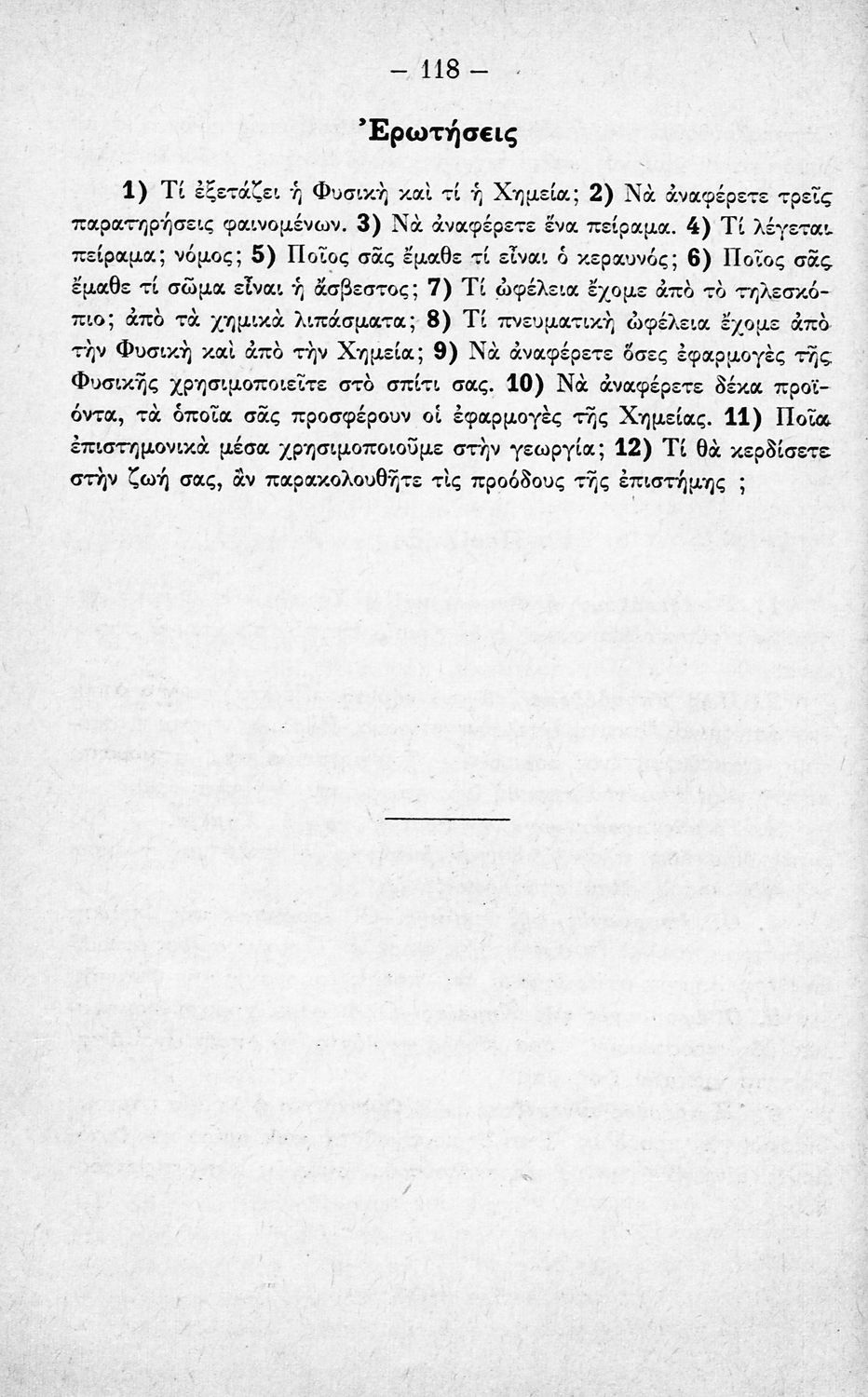 Βαθμίδα εκπαίδευσης: Πρωτοβάθμια Τάξη: ΣΤ' Δημοτικού Μάθημα: Φυσική Γλώσσα: Απλή καθαρεύουσα Παρουσίαση περιεχομένου: Μαθητικό βοήθημα της ΣΤ΄ Δημοτικού για το μάθημα της Φυσικής. Παρέχει βασικές γνώσεις της φυσικής επιστήμης και της χημείας. Αναλύει τις ιδιότητες των σωμάτων, καθώς και του ήχου, του ηλεκτρισμού και του φωτός. Σχετικά με τη χημεία αναφέρεται στα μέταλλα, στα οξέα, τις βάσεις, τα άλατα. Αναφέρεται στην πρακτική εφαρμογή της φυσικής και της χημείας στην καθημερινότητά. Επίσης, περιλαμβάνει πολλά από τα όργανα, που χρησιμοποιούνται στη φυσική, και τη χημεία. Περιέχει εικόνες και σχεδιαγράμματα τα οποία βοηθούν τη διδασκαλία. Προτείνεται μια συγκεκριμένη δομή για τη διδασκαλία σύμφωνα με την οποία το μάθημα διαρθρώνεται αρχικά με την ανάγνωση, που αναφέρεται στη θεωρία, στην περίληψη των σημαντικότερων σημείων, στις ερωτήσεις κατανόησης και τέλος στο γύμνασμα, το οποίο είναι η πρακτική εφαρμογή για την εμπέδωση της θεωρίας. |