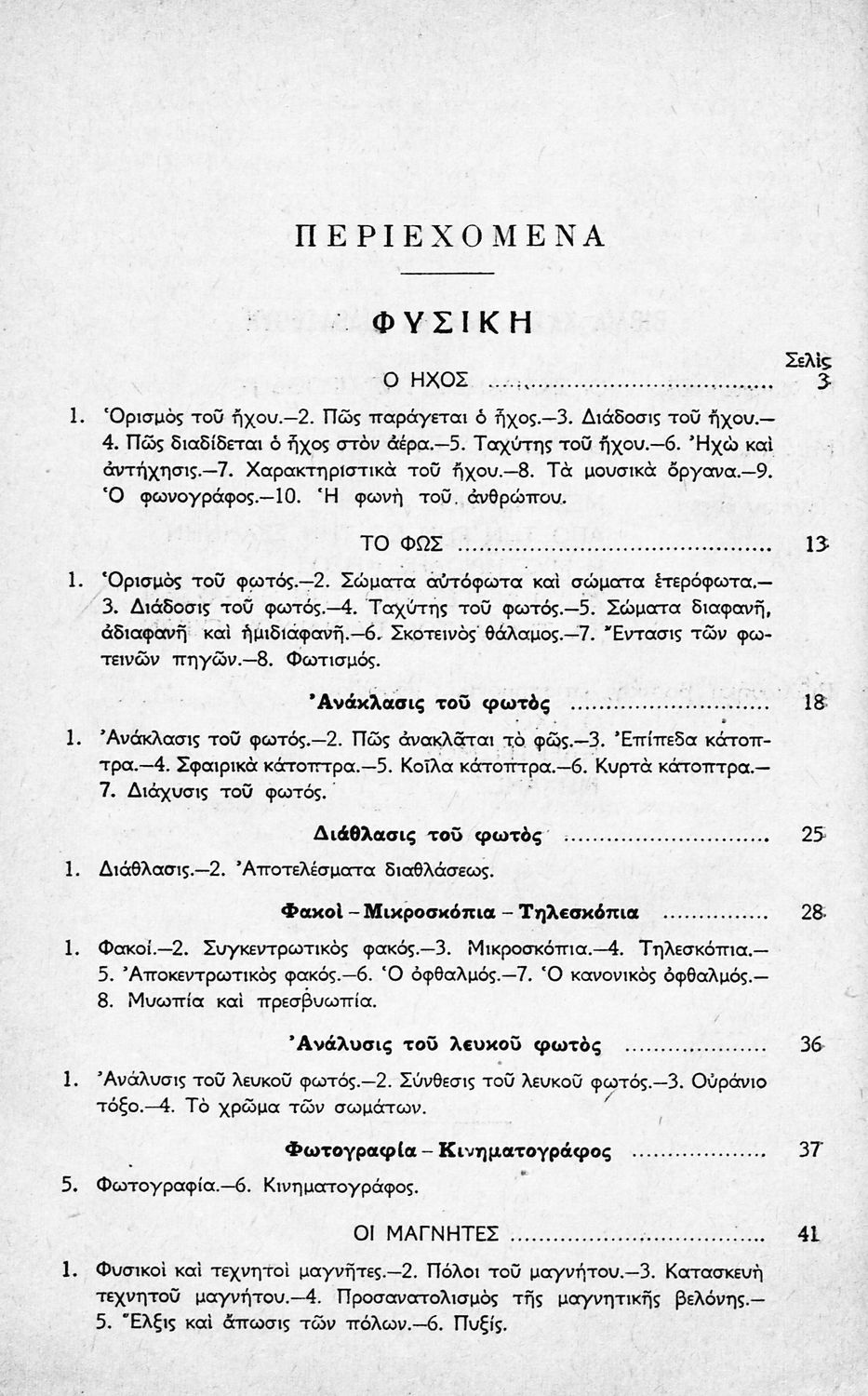 Μαθητικό βοήθημα της ΣΤ΄ Δημοτικού για το μάθημα της Φυσικής. Παρέχει βασικές γνώσεις της φυσικής επιστήμης και της χημείας. Αναλύει τις ιδιότητες των σωμάτων, καθώς και του ήχου, του ηλεκτρισμού και του φωτός. Σχετικά με τη χημεία αναφέρεται στα μέταλλα, στα οξέα, τις βάσεις, τα άλατα. Αναφέρεται στην πρακτική εφαρμογή της φυσικής και της χημείας στην καθημερινότητά. Επίσης, περιλαμβάνει πολλά από τα όργανα, που χρησιμοποιούνται στη φυσική, και τη χημεία. Περιέχει εικόνες και σχεδιαγράμματα τα οποία βοηθούν τη διδασκαλία. Προτείνεται μια συγκεκριμένη δομή για τη διδασκαλία σύμφωνα με την οποία το μάθημα διαρθρώνεται αρχικά με την ανάγνωση, που αναφέρεται στη θεωρία, στην περίληψη των σημαντικότερων σημείων, στις ερωτήσεις κατανόησης και τέλος στο γύμνασμα, το οποίο είναι η πρακτική εφαρμογή για την εμπέδωση της θεωρίας.