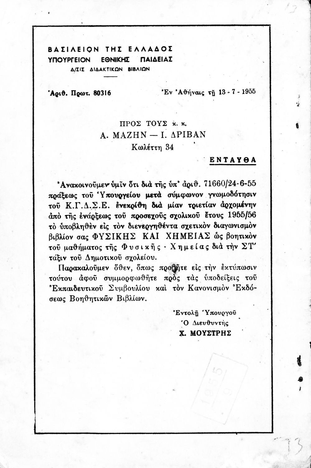 Κωδικός αναγνώρισης: 01-18874 Τίτλος: Φυσική και Χημεία δια την ΣΤ΄ τάξιν του Δημοτικού Σχολείου Συγγραφέας: Αλκ. Ε Μάζης, Ιωαν. Γ. Δρίβας Μέγεθος και υπόστρωμα: Μαθητικό βοήθημα, μαλακό εξώφυλλο, 124 σελίδες. Σκίτσα, σχεδιαγράμματα (ασπρόμαυρα). |