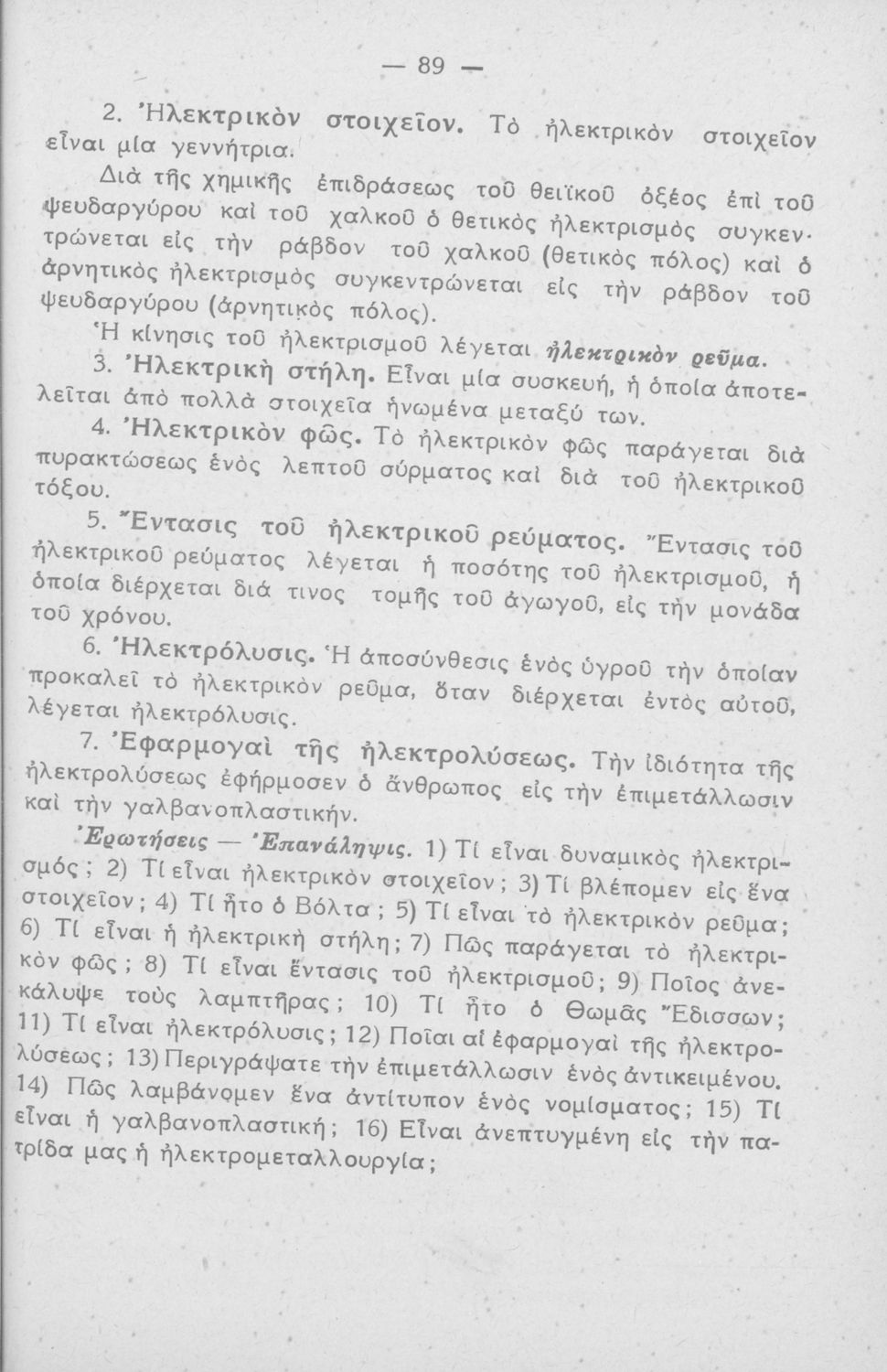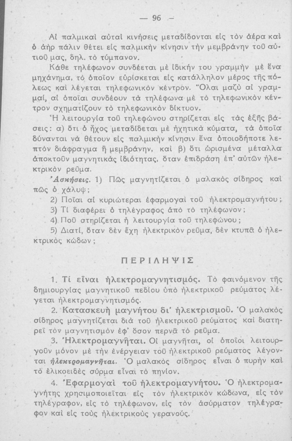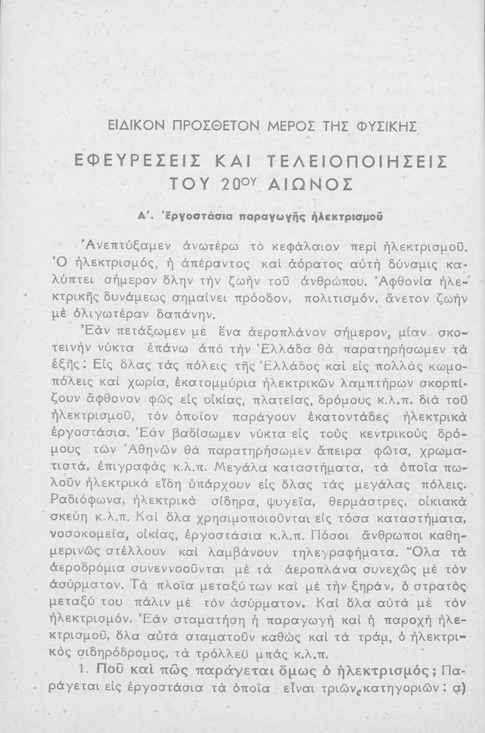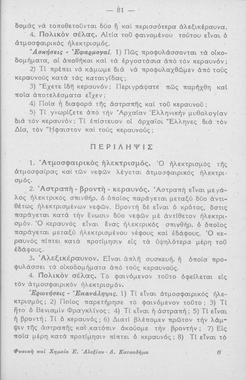 Βαθμίδα εκπαίδευσης: Πρωτοβάθμια Τάξη: ΣΤ' Δημοτικού Μάθημα: Φυσική Γλώσσα: Απλή καθαρεύουσα Παρουσίαση περιεχομένου: Μαθητικό βοήθημα της ΣΤ΄ Δημοτικού για το μάθημα της Φυσικής στο Δημοτικό . Παρέχει βασικές γνώσεις της φυσικής επιστήμης και της χημείας. Αναλύει τις ιδιότητες των σωμάτων, καθώς και του ήχου, του ηλεκτρισμού και του φωτός. Σχετικά με τη χημεία αναφέρεται στα μέταλλα, στα οξέα, τις βάσεις, τα άλατα. Αναφέρεται στην πρακτική εφαρμογή της φυσικής και της χημείας στην καθημερινότητά. Επίσης, περιλαμβάνει πολλά από τα όργανα, που χρησιμοποιούνται στη φυσική, και τη χημεία. Περιέχει εικόνες και σχεδιαγράμματα τα οποία βοηθούν τη διδασκαλία. |