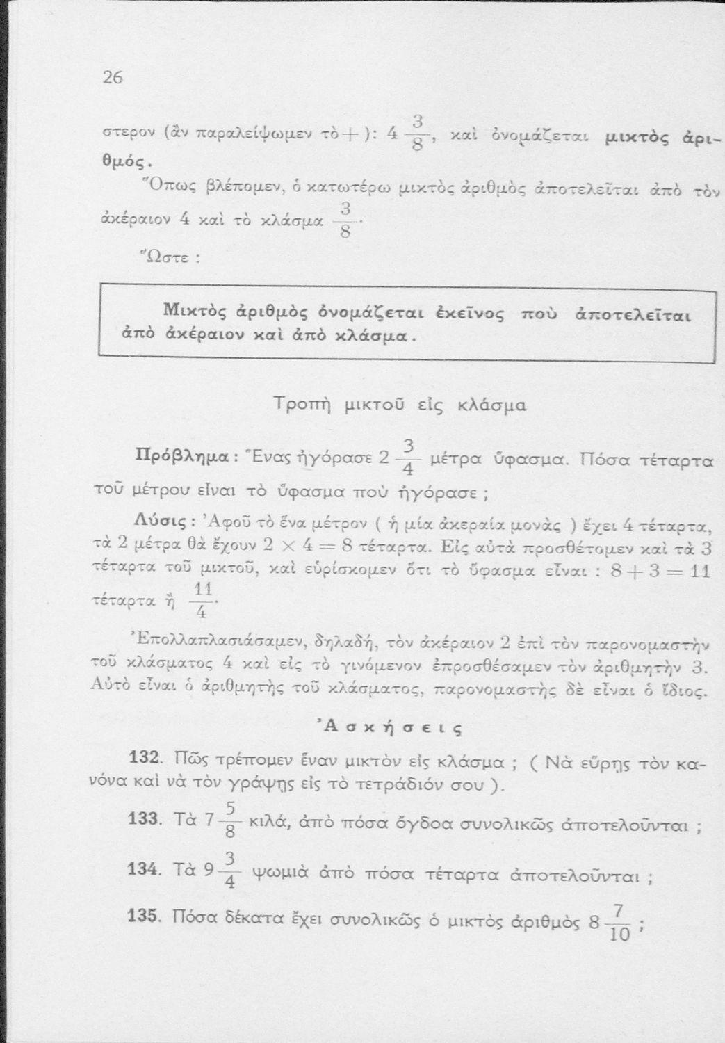 Παρουσίαση περιεχομένου: Μαθητικό βοήθημα Αριθμητικής για τις Ε΄ και ΣΤ΄ Δημοτικού που περιέχει ασκήσεις με επιχειρηματικό προσανατολισμό και εστιάζει στις αριθμητικές πράξεις με κλάσματα και την απλή μέθοδο των τριών. Η παρούσα έκδοση έχει μεταγλωττιστεί στην καθαρεύουσα.