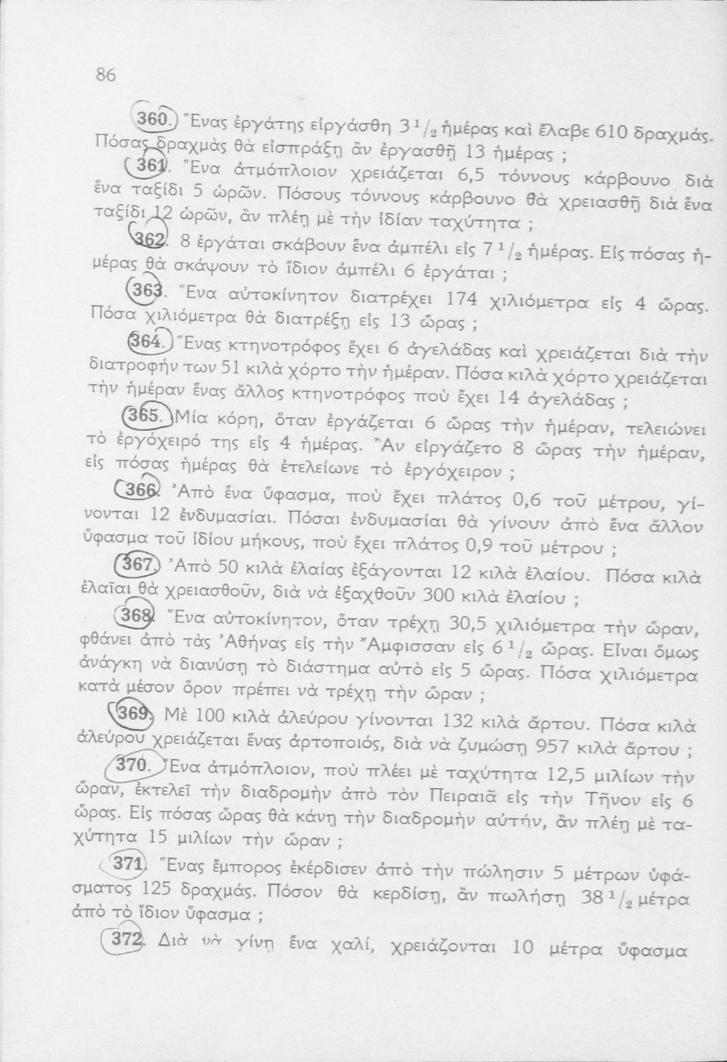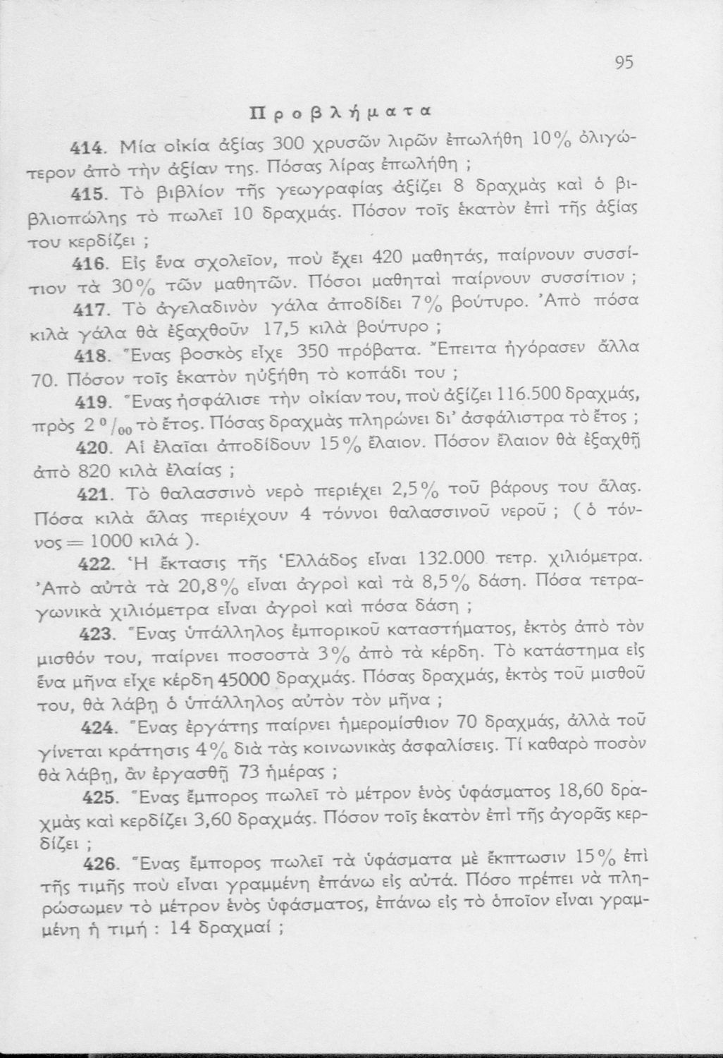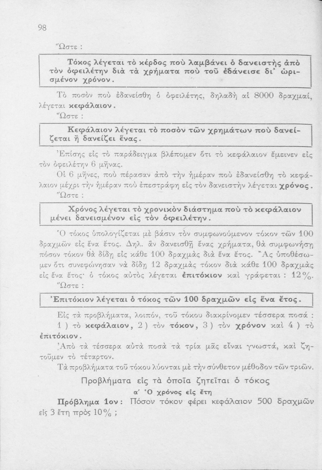 Παρουσίαση περιεχομένου: Μαθητικό βοήθημα Αριθμητικής για τις Ε΄ και ΣΤ΄ Δημοτικού που περιέχει ασκήσεις με επιχειρηματικό προσανατολισμό και εστιάζει στις αριθμητικές πράξεις με κλάσματα και την απλή μέθοδο των τριών. Η παρούσα έκδοση έχει μεταγλωττιστεί στην καθαρεύουσα.