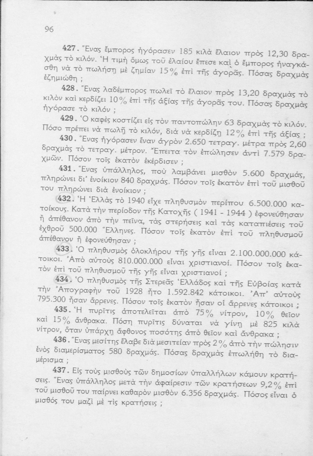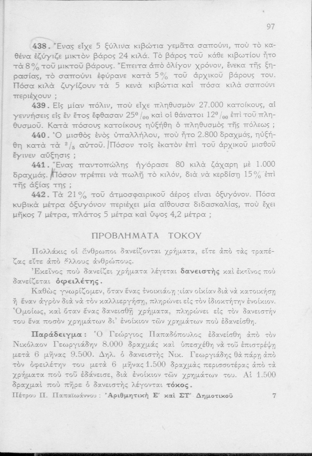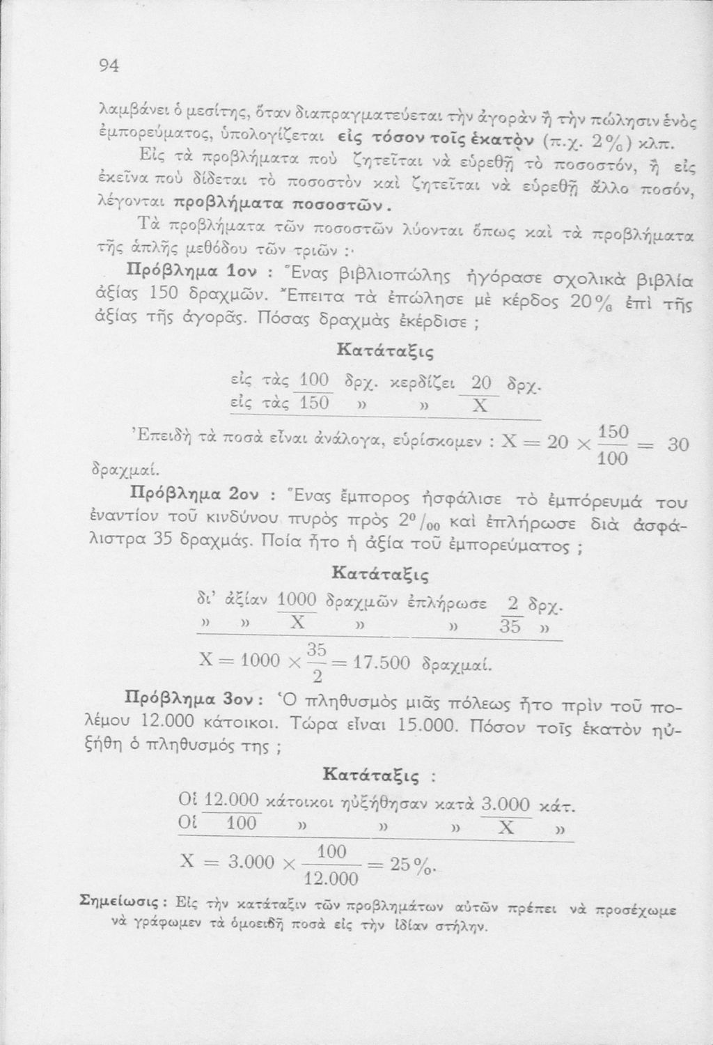 Μαθητικό βοήθημα Αριθμητικής για τις Ε΄ και ΣΤ΄ Δημοτικού που περιέχει ασκήσεις με επιχειρηματικό προσανατολισμό και εστιάζει στις αριθμητικές πράξεις με κλάσματα και την απλή μέθοδο των τριών. Η παρούσα έκδοση έχει μεταγλωττιστεί στην καθαρεύουσα.