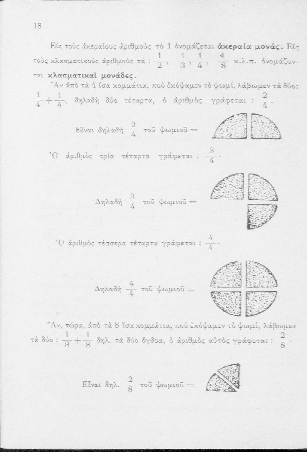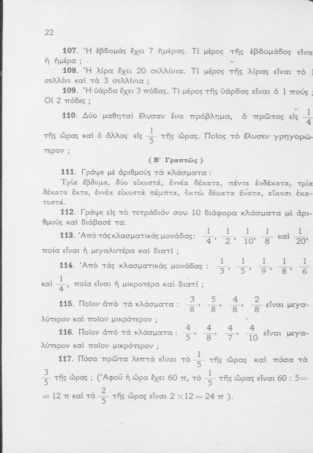 Βαθμίδα εκπαίδευσης: Πρωτοβάθμια Τάξη: Ε' Δημοτικού / ΣΤ' Δημοτικού Μάθημα: Μαθηματικά Γλώσσα: Καθαρεύουσα Παρουσίαση περιεχομένου: Μαθητικό βοήθημα Αριθμητικής για τις Ε΄ και ΣΤ΄ Δημοτικού που περιέχει ασκήσεις με επιχειρηματικό προσανατολισμό και εστιάζει στις αριθμητικές πράξεις με κλάσματα και την απλή μέθοδο των τριών. Η παρούσα έκδοση έχει μεταγλωττιστεί στην καθαρεύουσα. |