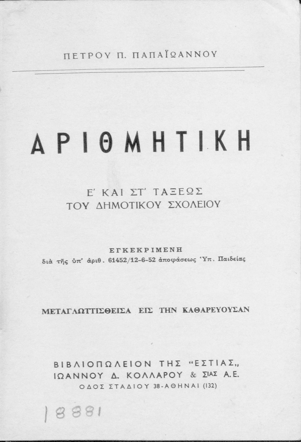 Κωδικός αναγνώρισης: 01-18881 Τίτλος: Αριθμητική Ε΄ και ΣΤ΄ τάξεως του Δημοτικού Σχολείου Συγγραφέας: Πέτρος Π. Παπαϊωάννου Μέγεθος και υπόστρωμα: Μαθητικό βοήθημα, 20εκ., μαλακό εξώφυλλο, 128 σελίδες. Εξώφυλλο (έγχρωμο). |
