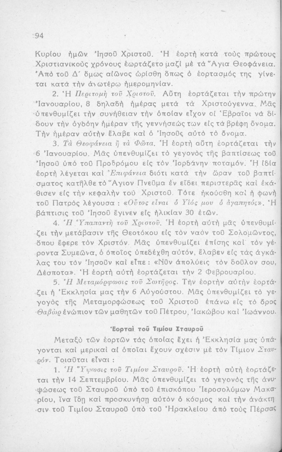 Βαθμίδα εκπαίδευσης: Πρωτοβάθμια Τάξη: ΣΤ' Δημοτικού Μάθημα: Θρησκευτικά Γλώσσα: Απλή καθαρεύουσα Παρουσίαση περιεχομένου: Σχολικό εγχειρίδιο Θρησκευτικών για την Ε΄, ΣΤ΄ Δημοτικού. Ο συγγραφέας υπήρξε Επιθεωρητής Δημοτικών Σχολείων. Στο βιβλίο περιέχονται στοιχεία Θρησκειολογίας. |