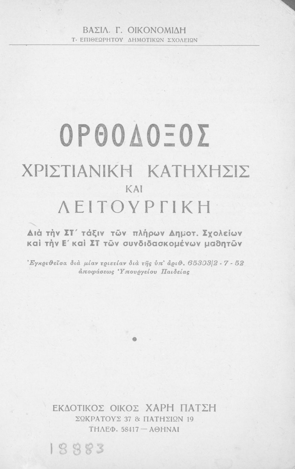 Τίτλος: Ορθόδοξος χριστιανική Κατήχησις και Λειτουργική δια την ΣΤ΄ τάξιν των πλήρων δημοτ. σχολείων και την Ε΄ και ΣΤ΄ των συνδιδασκομένων μαθητών