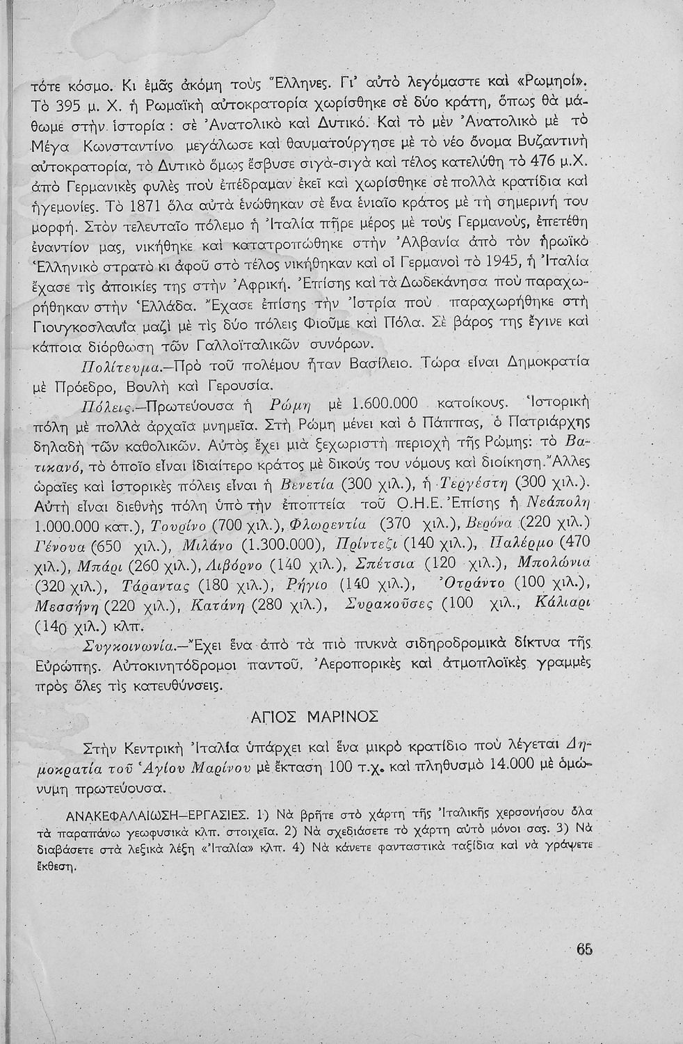 Παρουσίαση περιεχομένου: Μαθητικό βοήθημα Γεωγραφίας ΣΤ΄ Γυμνασίου που περιέχει στοιχεία φυσικής και μαθηματικής γεωγραφίας και εξετάζει τα κράτη της Ευρώπη από γεωφυσική, πολιτική και οικονομική άποψη. Περιλαμβάνει και στοιχεία ανθρωπογεωγραφίας.