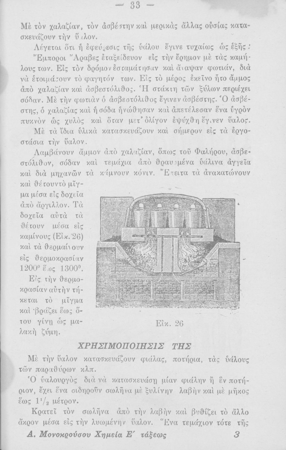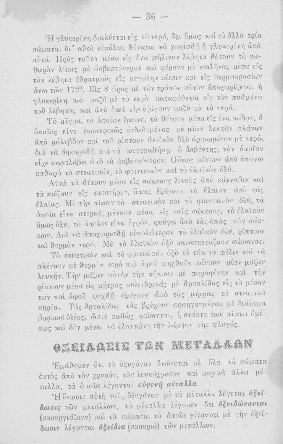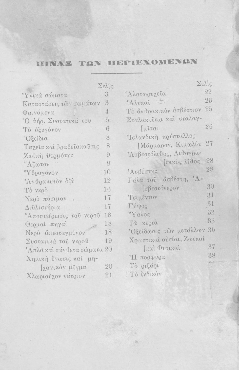 Βαθμίδα εκπαίδευσης: Πρωτοβάθμια Τάξη: Ε' Δημοτικού Μάθημα: Χημεία Γλώσσα: Καθαρεύουσα Παρουσίαση περιεχομένου: Μαθητικό βοήθημα Χημείας Ε΄ Δημοτικού που περιγράφει τη σύσταση των σωμάτων, τα φυσικά και χημικά φαινόμενα καθώς και στις ιδιότητες διάφορων στοιχείων (οξείδια, υδρογονάνθρακες κλπ.). Περιγράφονται οι χημικές ενώσεις και οι ιδιότητες τους. |