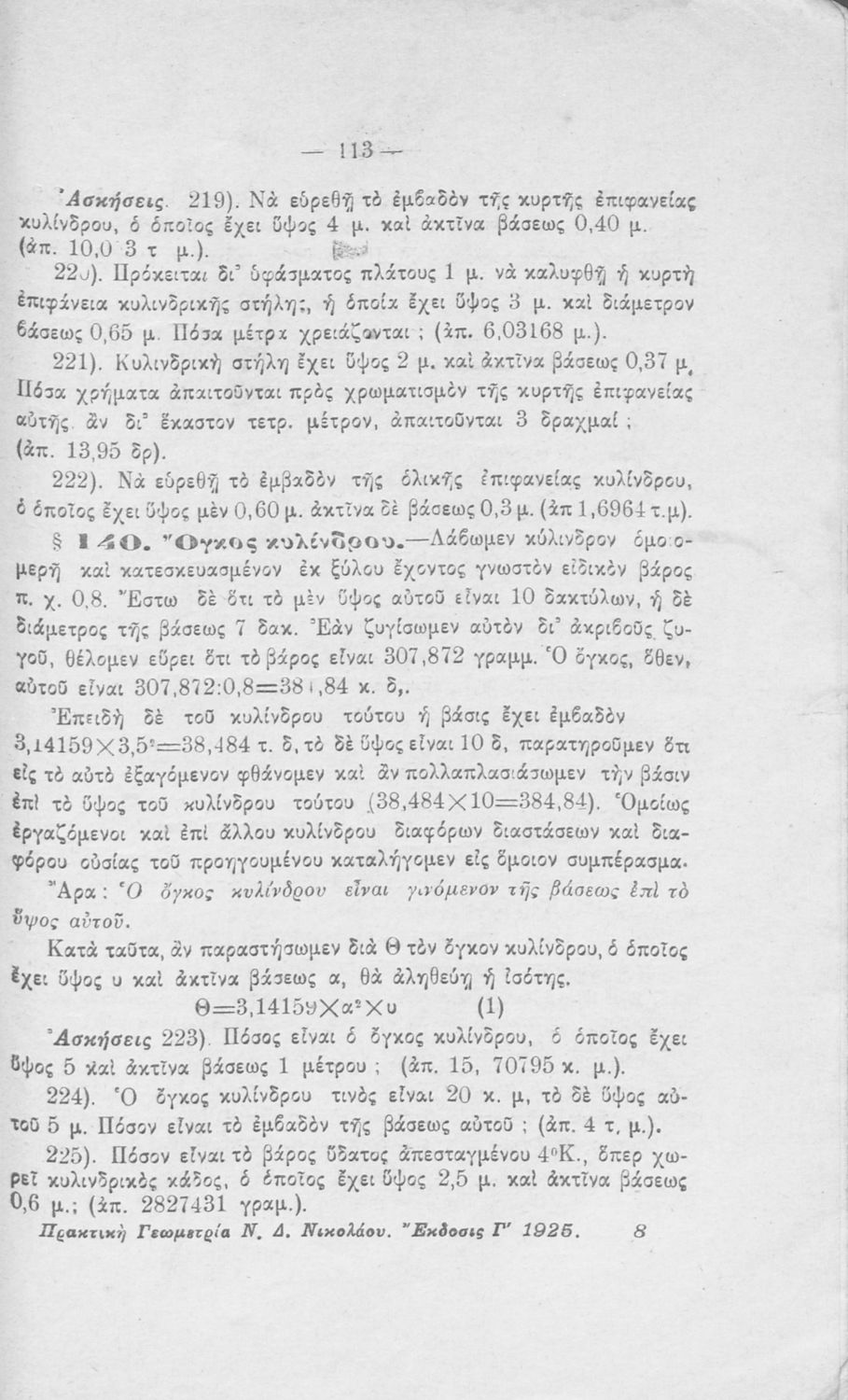Σχολικό εγχειρίδιο Γεωμετρίας για τα Ελληνικά και Αστικά Σχολεία που περιέχει θεωρία και ασκήσεις και είναι χωρισμένο σε Επιπεδομετρία και Στερεομετρία.